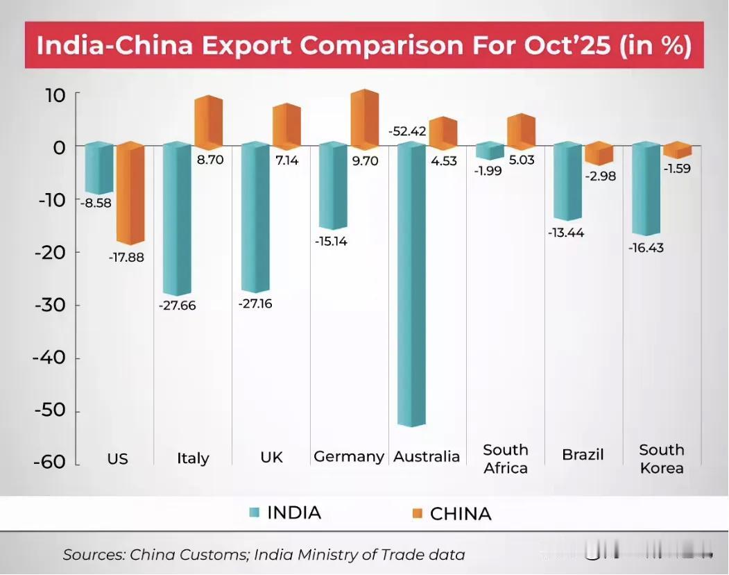 中印两国2025年10月出口数据。图源:《经济时报》 《经济时报》12月2日报道,印10月电子产品出口实现增长,但整体出口形势依然严峻,多个主要品类大幅萎缩,传统市场正面临来自中国的激烈竞争。印商工部10月出口数据显示,印整体货物出口额由去年同期的389.8亿美元($38.98 billion)降至343.8亿美元($34.38 billion),其中前十大出口品类整体下滑12.6%,从318亿美元($31.8 billion)降至278亿美元($27.8 billion),创近年来罕见回落。作为出口支柱的工程制成品下降16.7%至93.7亿美元($9.37 billion),珠宝首饰类受挫最为严重,暴跌29.5%至22.9亿美元($2.29 billion)。仅电子产品出口实现增长,增涨19%至40.8亿美元($4.08 billion),其中智能手机占比达60%,主要得益于美对电子产品实施的关税豁免。分析指出,印出口下滑的核心原因在于,中国通过“低价+多元市场+关税管理”的综合出口战略,重塑全球贸易格局,削弱了印产品的国际竞争力。同时,特朗普政府8月对印征收50%关税,对印多个产业造成冲击。此外,全球需求疲软以及物流瓶颈问题进一步加剧印出口压力。对此,印应采取多重策略,既要加强对传统行业的保护力度,也要加快出口市场多元化布局,并在关键领域提升与中国产品的竞争优势。