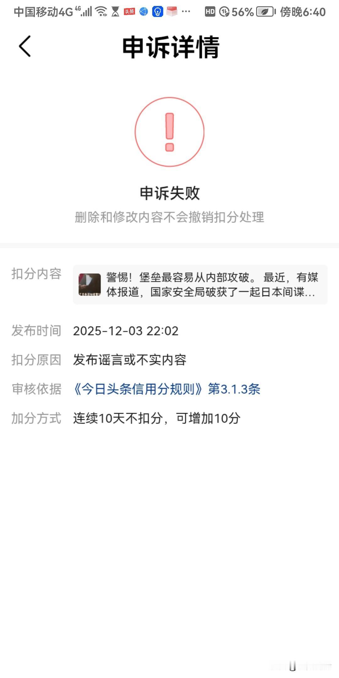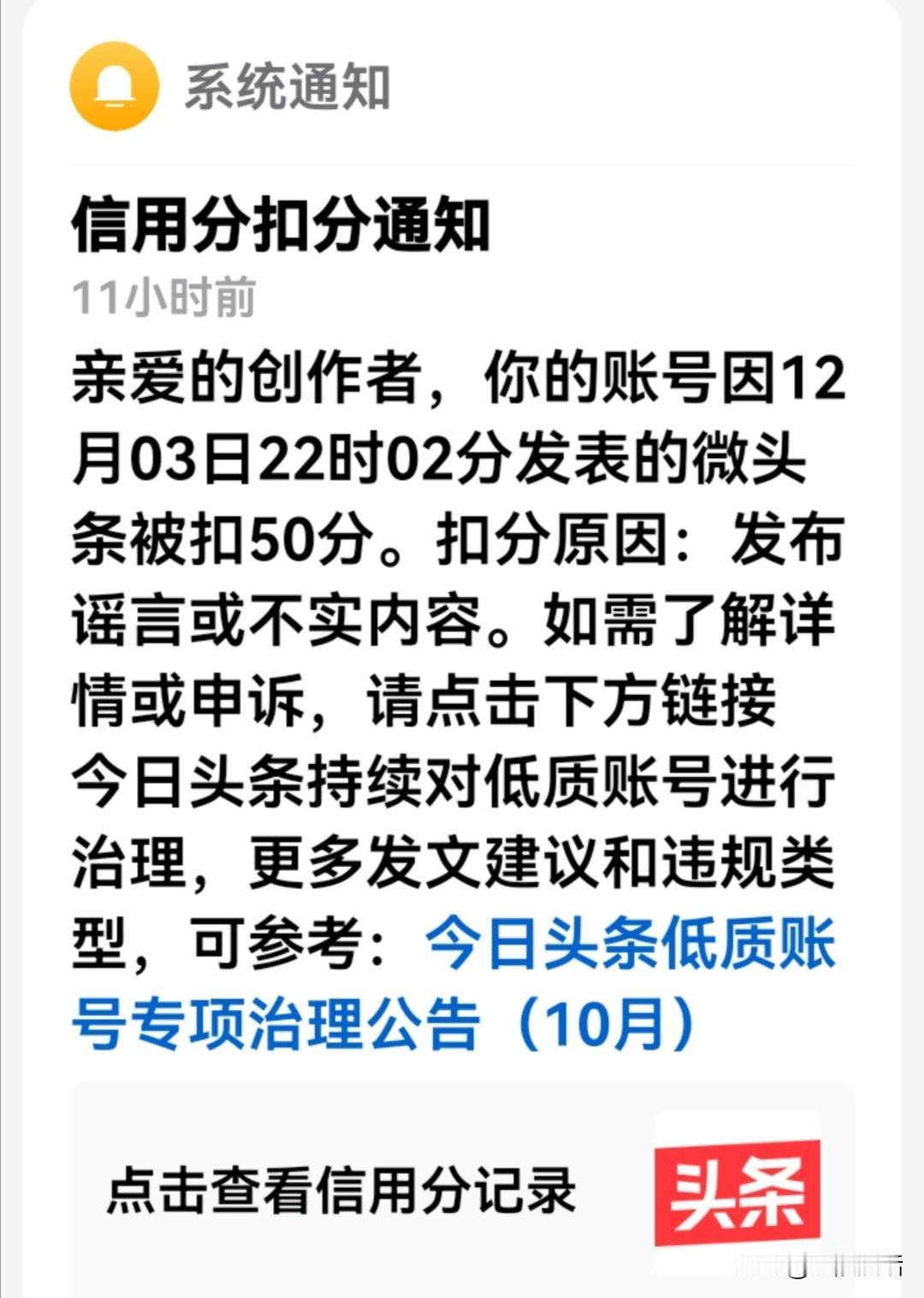 昨天真是倒霉到极点! 昨天晚上九点多,我看到有名友友发布了一篇微头条,说是前几天抓到了23名日本间谍,其中11名为日本籍,12名为我们国家机关的在职或退休人员。联系前不久央视新闻发布的有美国间谍(被收买的中国留学生)出现在我们某“核心”部门一事,出于正义和愤怒,引用此事写了一篇微头条,不料今天早晨发现账号扣了50分,并取消了所有权益(即发布的作品没有了收益,这个时间将长达50天),理由是:发布谣言或不实内容。 一开始,我没有当回事。心想所用的材料又不是我杜撰的,都有出处,并且还是平台审核过的,申诉一下就会恢复。然而,没有想到的是,我天真啦,截屏所有证据申诉后还是没有恢复。 这件事告诉我们:引用的材料必须认真核实。如果不是出自官方或自己亲身经历过的,切莫乱用乱写。
