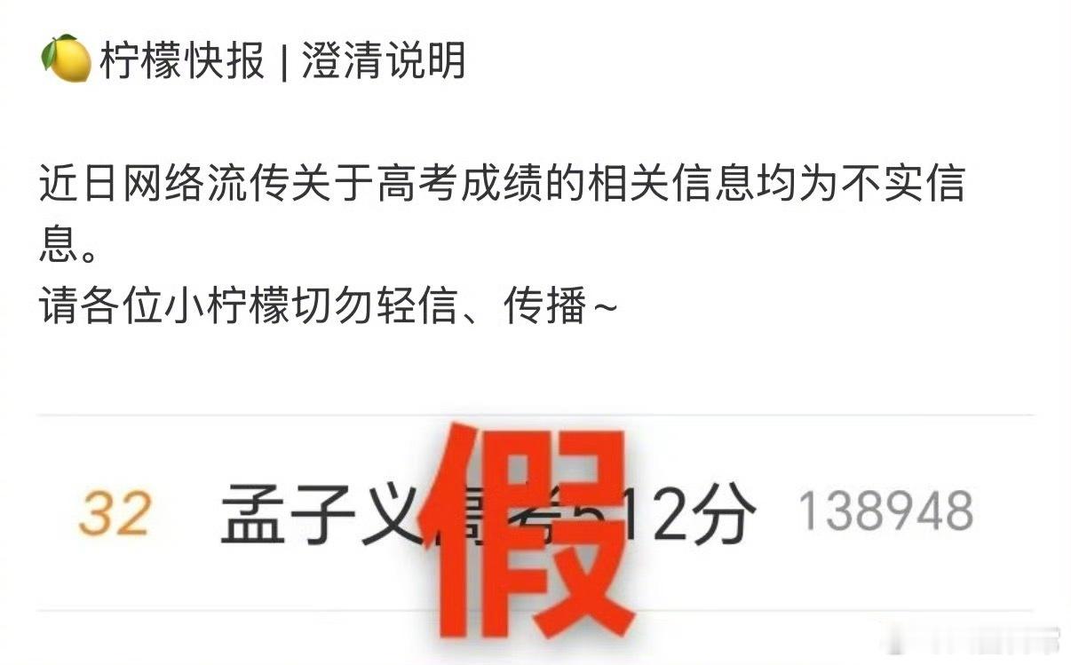 对接辟谣孟子义高考512分,表示网传关于高考成绩的相关信息均为不实信息孟子义方辟谣网传高考成绩