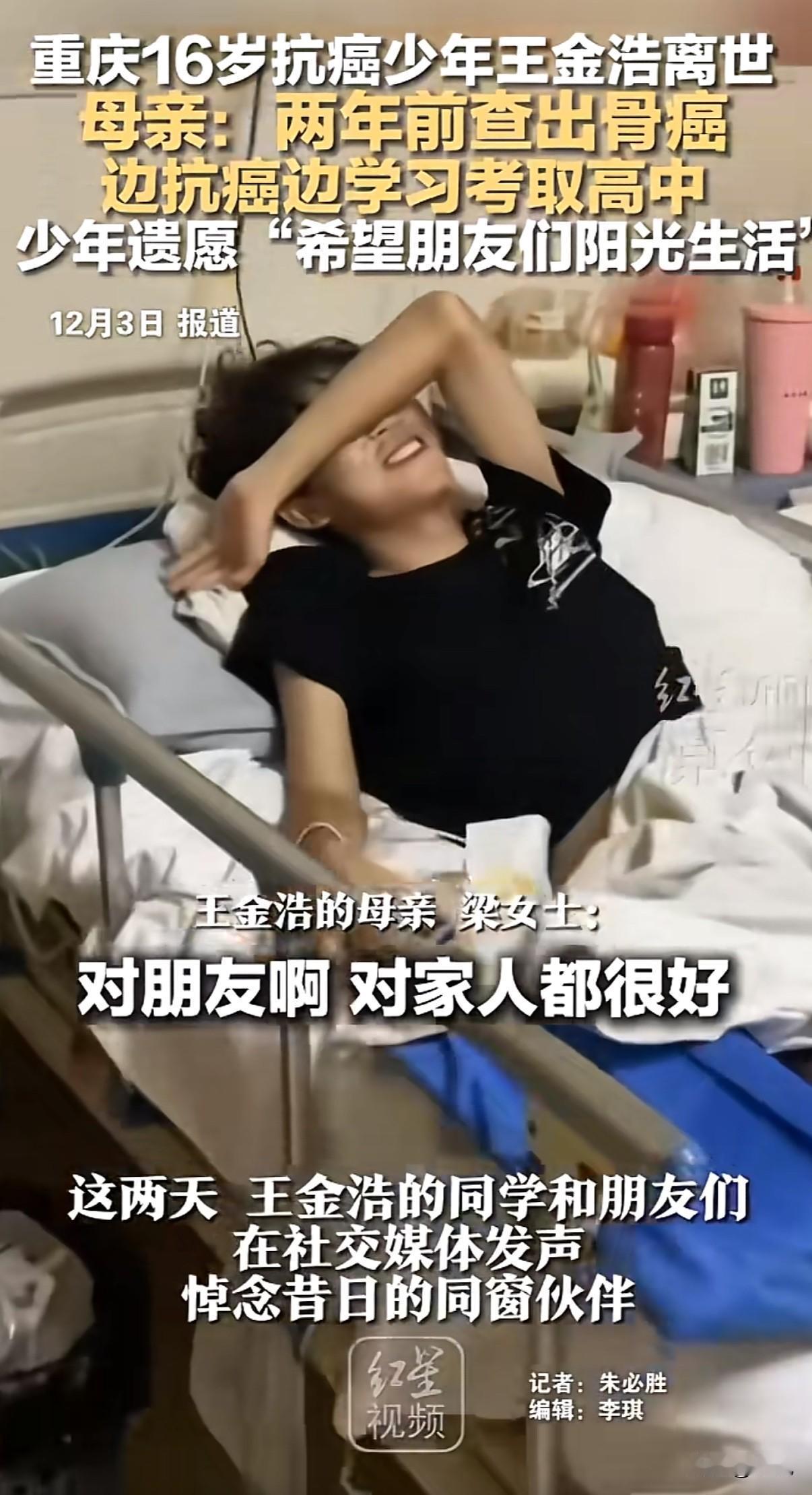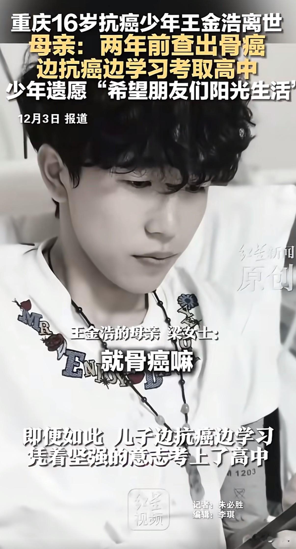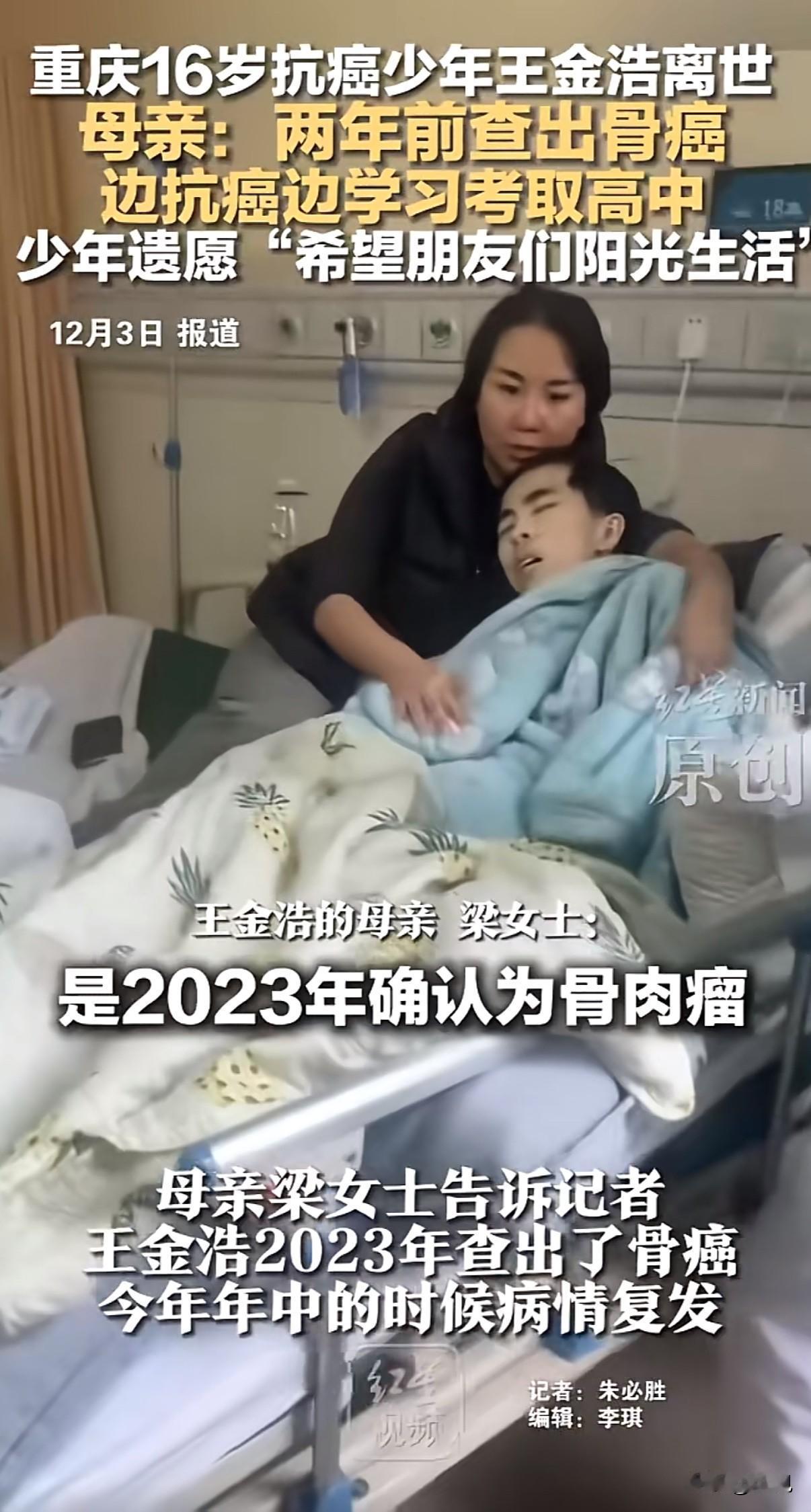 泪目!16岁重庆少年抗癌两年考上高中,最后的遗愿让全网破防。 2023年,他被确诊骨癌。治疗期间,他几乎一年没能正常上学。可这个男孩硬是咬着牙,边抗癌边读书,今年顺利考上了高中。 拿到录取通知时,全家都以为终于看到了曙光。可年中,病复发了。 十月份,医生悄悄告诉家人,孩子可能只剩下十几天了。王金浩却撑了一个多月。他后来对妈妈说,想多陪陪她。 最后那段时间,他疼得厉害,精力也跟不上了。他开始不愿见同学和朋友。妈妈梁女士说,孩子很要强,不想让别人看到自己虚弱的样子。 离世前几天,他见了几个同学一面,那时他已经说不出话了。 王金浩喜欢体育,以前拿过不少比赛金牌。他曾想过以后考北京体育大学。生病前,他还在准备学校的运动会。 妈妈记得,儿子特别懂事,每个节日都会给她准备小礼物。临走前,他拉着妈妈的手嘱咐:“你要好好过。” 梁女士通过媒体,把儿子最后的心愿转告给他的同学们:希望他们今后都积极、正能量的生活。 消息传开后,王金浩的同学好几天没心思上课。他们在社交媒体上发帖纪念他,说“浩哥,一路走好”。 很多网友留言,有人说想到了自己身边的亲人,有人说想起了读书时班上也有一位生病的同学。更多人感叹,这个16岁少年身上,有太多成年人没有的坚韧。 一个普通家庭的孩子,面对突如其来的疾病,选择了一边治疗一边读书。考上高中,对他而言不仅是学业上的目标,更像是对命运的一次抵抗。 他最后拒绝见同学,或许不是疏远,而是想留住朋友们记忆中那个健康、阳光的自己。临走前让妈妈转达的话,更像是一种寄托——自己没能走完的路,希望同龄人能替他好好走完。 生命的长短无法控制,但怎么活,人可以自己决定。这个16岁少年在最后的日子里,选择了安静地陪伴家人,并把最后的祝愿留给了同龄人。 他的一生很短,但足够有分量。