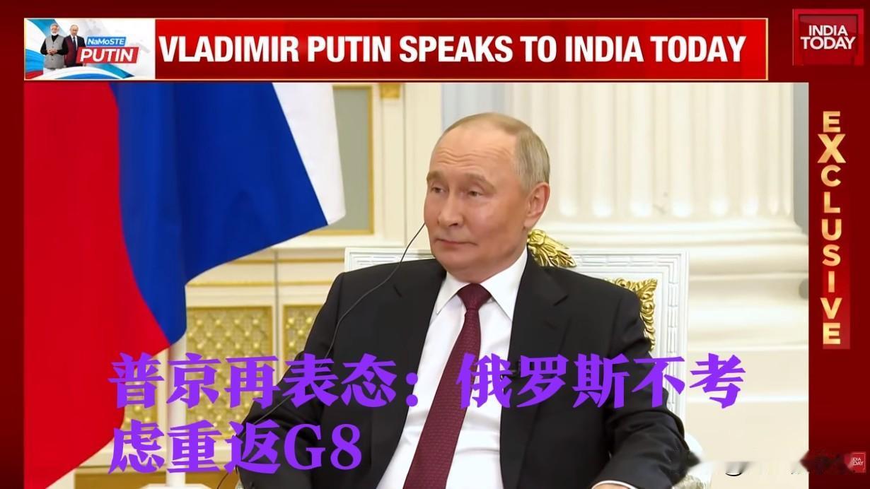 普京再表态:俄罗斯不考虑重返G8 据外媒报道印度外交部日前表示,应总理莫迪邀请,俄罗斯总统普京将于12月4日至5日对印度进行国事访问。 据俄罗斯卫星通讯社、《今日印度》等媒体12月4日报道,普京在开启访印行程前夕接受《今日印度》专访,其间他再次表态称,俄罗斯不考虑重返八国集团(G8)。 根据印媒放出的采访片段,普京被主持人问及“俄罗斯是否想要重返G8”,因为近期有很多相关报道。 对此,普京斩钉截铁回复了一个“不”字。他补充称,他从此前某个时候起就已不再参加G8峰会,且这与乌克兰局势无关。 俄罗斯《消息报》称,普京还表示,他很难理解七国集团(G7)为何自称G7,“你知道,在俄罗斯,G就像是‘伟大、大事’的缩写……”但按购买力平价计算,一些G7成员国的经济权重远低于印度。 “不过话说回来,这仍然是一个重要的平台。他们一起工作、做决定、讨论事情。祝他们一切都好吧。”普京继续说。 普京此前也就“俄罗斯是否重返G8”话题表态。据俄新社11月27日报道,普京在一场记者会上说,“在当今形势下,我很难想象,我们如何与他们(G7成员国)对话和合作。大家自己能想象吗?我们来了,说‘你好’,然后呢,难道要绷着脸面面相觑吗?” 据介绍,G7形成于上世纪70年代,由美国、加拿大、英国、法国、德国、意大利和日本组成。上世纪90年代,七国集团吸纳俄罗斯为成员,成为G8。2014年,因乌克兰危机,欧洲对俄罗斯实施制裁,俄罗斯从G8退出。