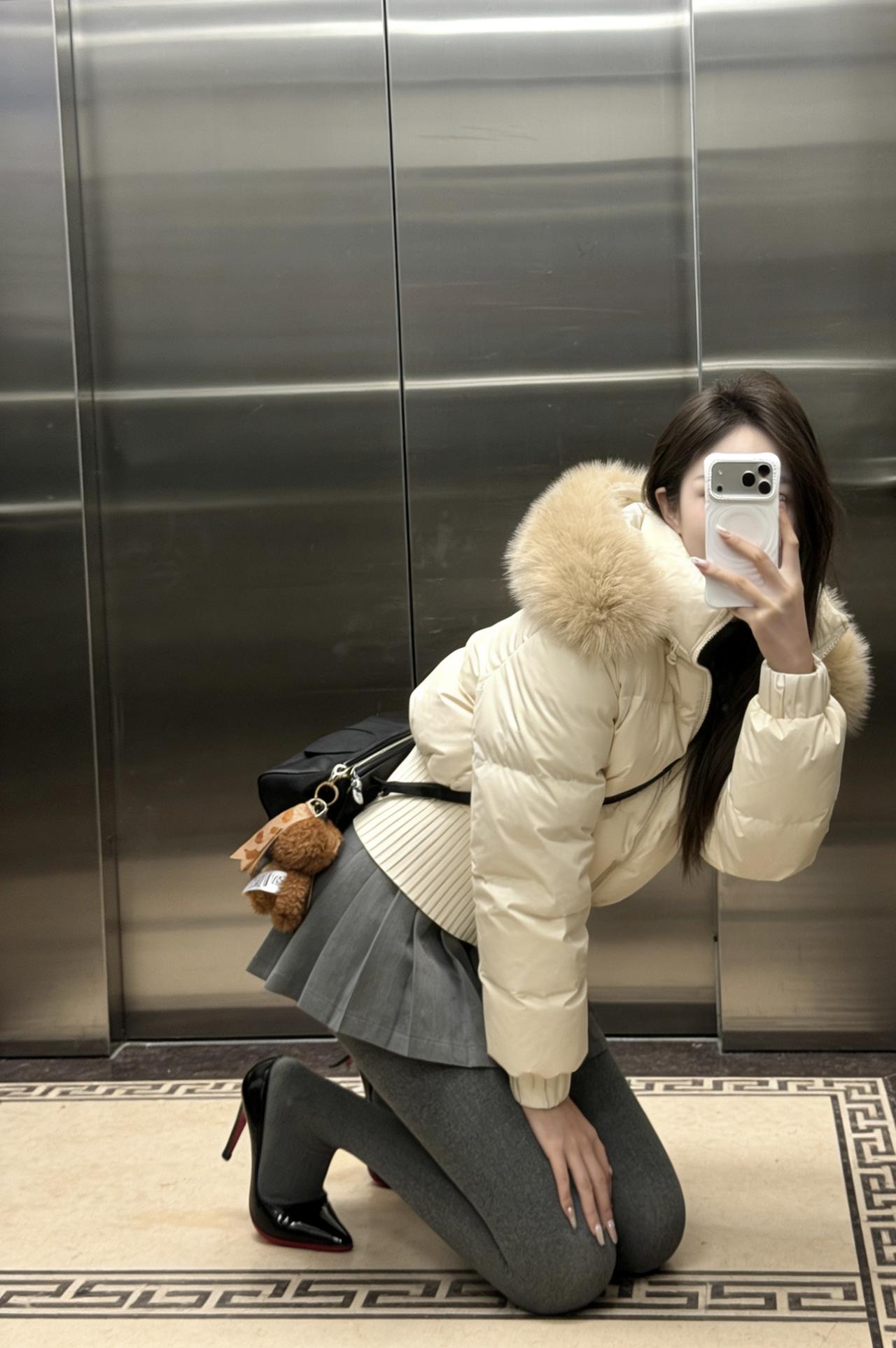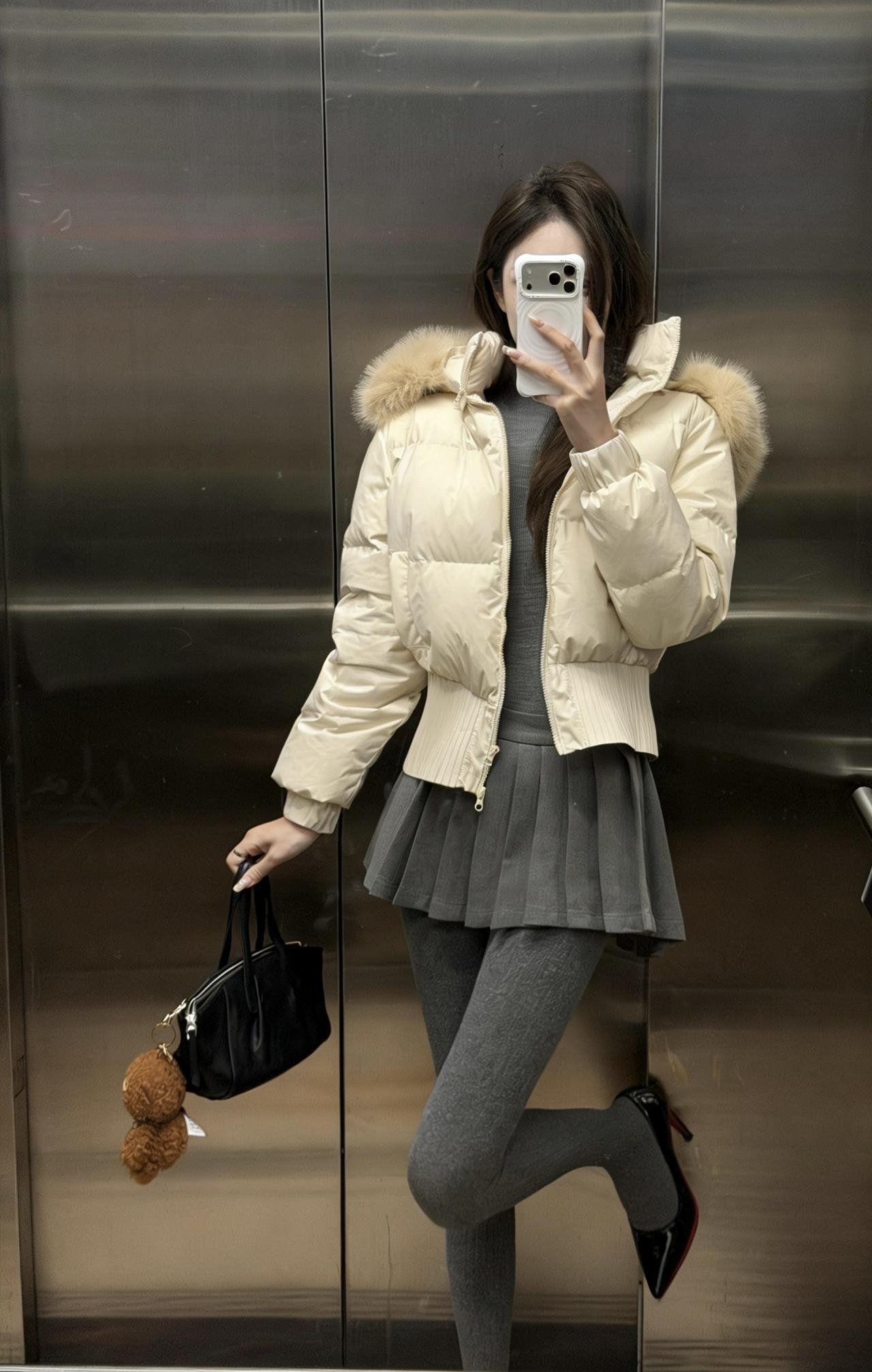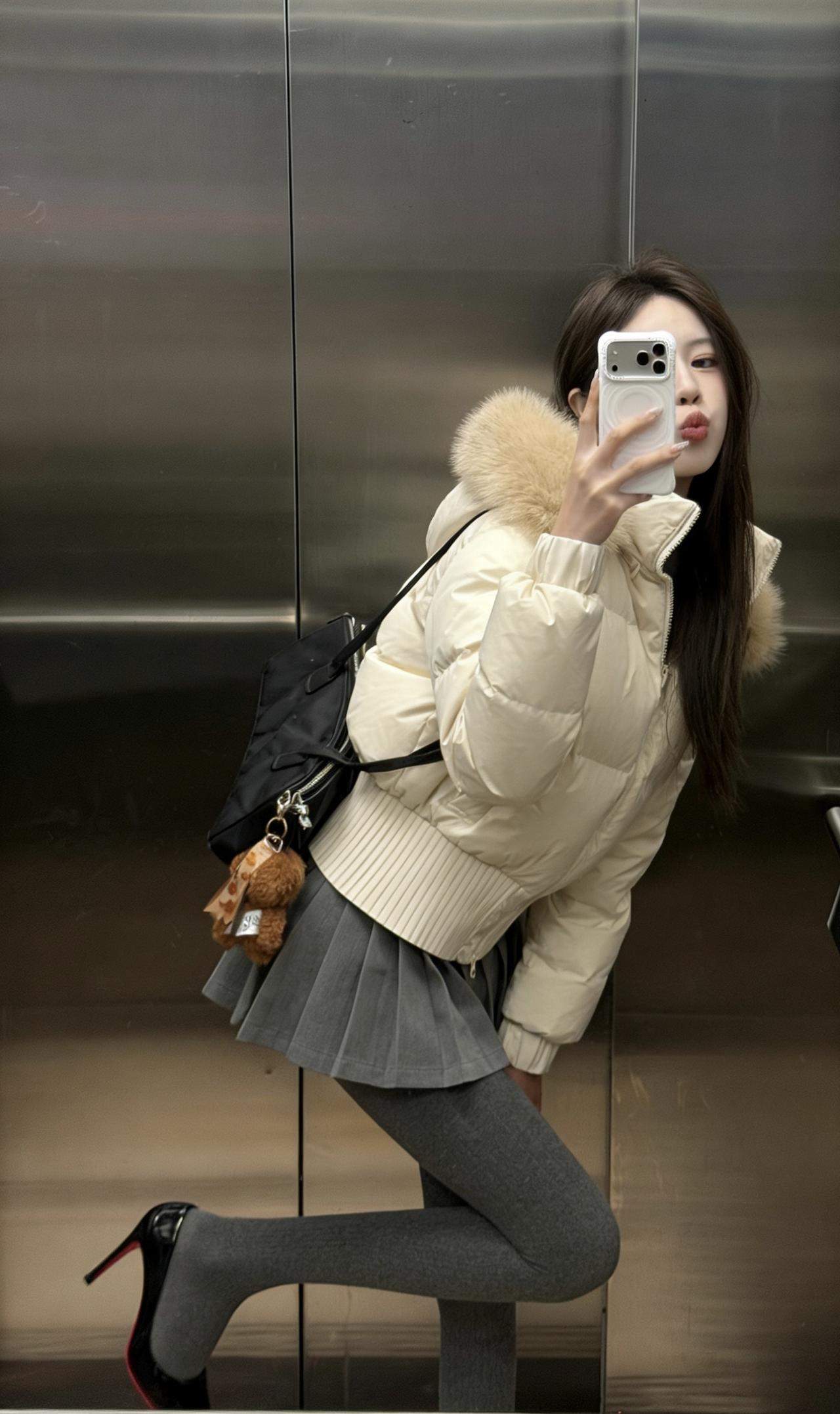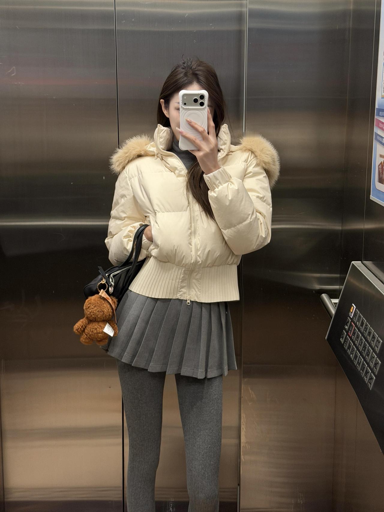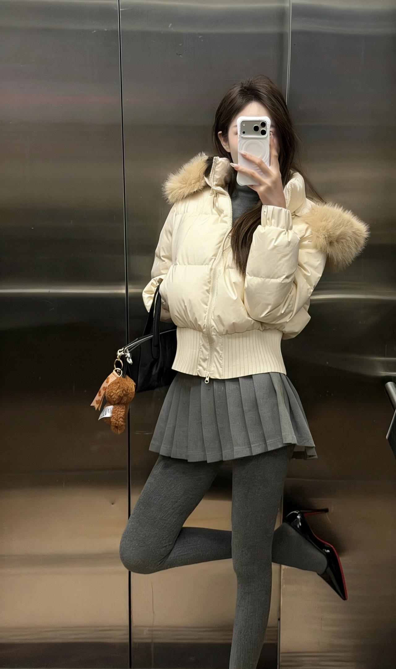 今日穿搭推荐:冬日甜酷轻熟风,整体搭配兼顾了保暖性和时尚感: 米白色短款毛领羽绒服+灰色针织内搭+灰色百褶裙+灰色紧身裤+黑色漆皮高跟鞋,搭配黑色小包。 适配场合: 日常逛街、约会、轻职场通勤、探店等。 短款羽绒服利落不臃肿,搭配简约色,既显气质又不会过于正式。保暖又上镜,拍照会很出片。