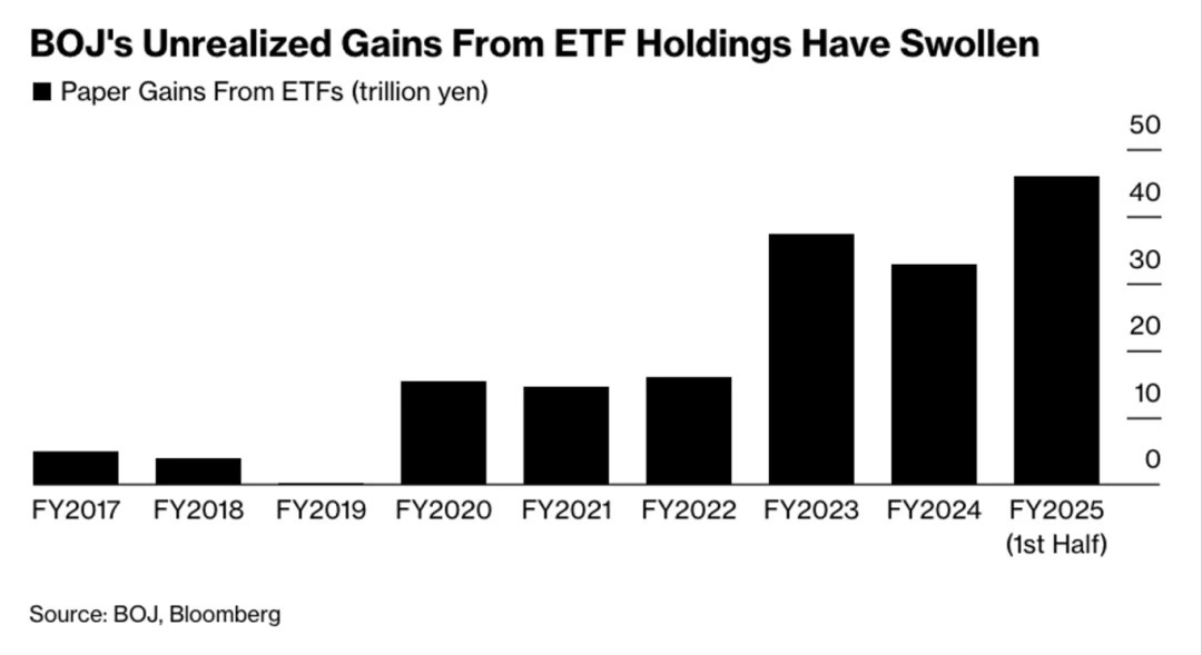 日股给日债的勇气得益于日本股市的持续上涨,日本央行持有的ETF在2025上半财年录得创纪录的46万亿日元未实现收益,推动其ETF总市值达到83.2万亿日元。日本央行于9月决定启动一项长期计划,以每年3300亿日元的账面价值规模逐步退出这些ETF持仓。巨额的账面浮盈不仅为政府提供了潜在的稳定收入来源,也缓解了其因利率攀升而录得32.8万亿日元未实现亏损的国债持仓带来的压力