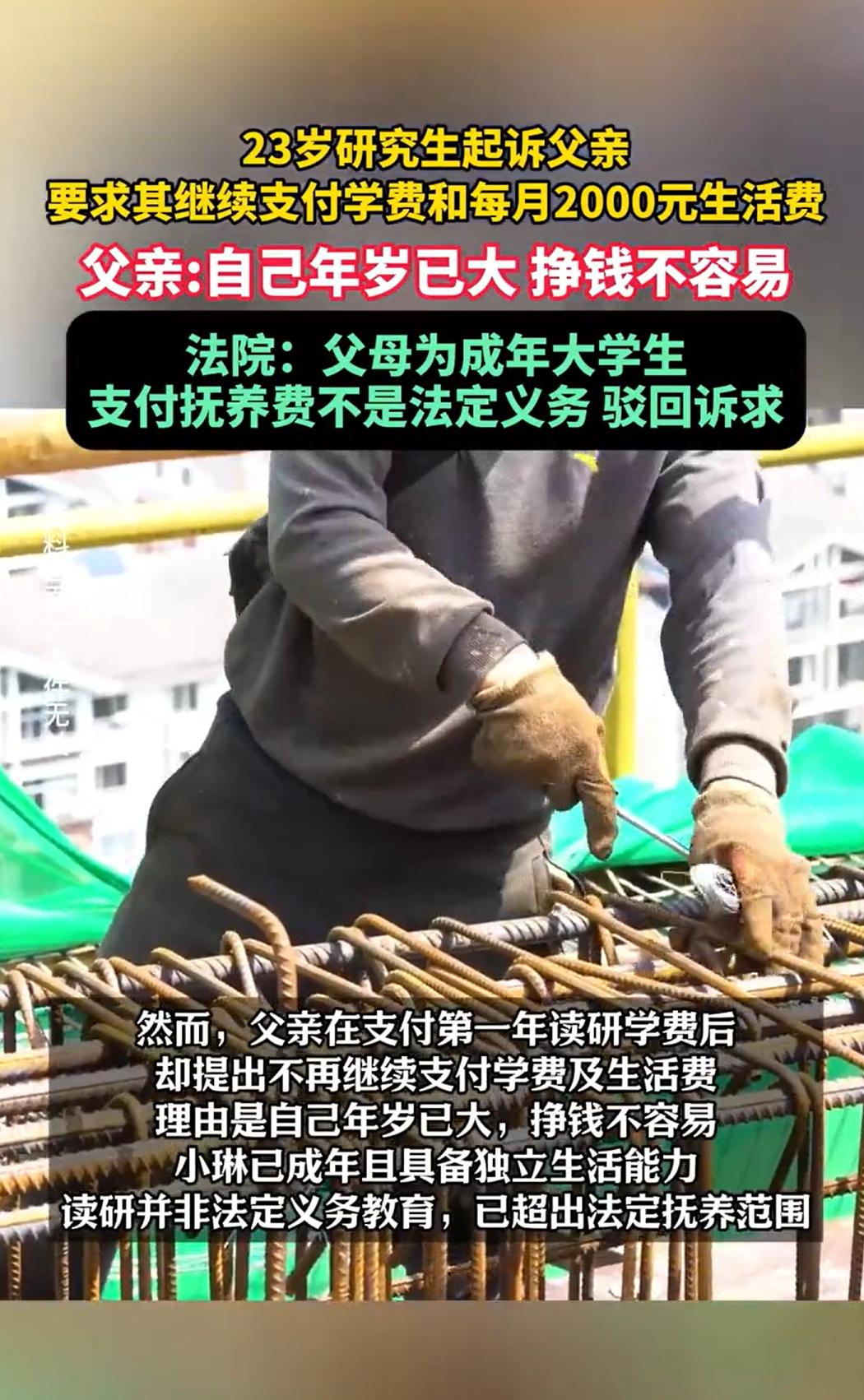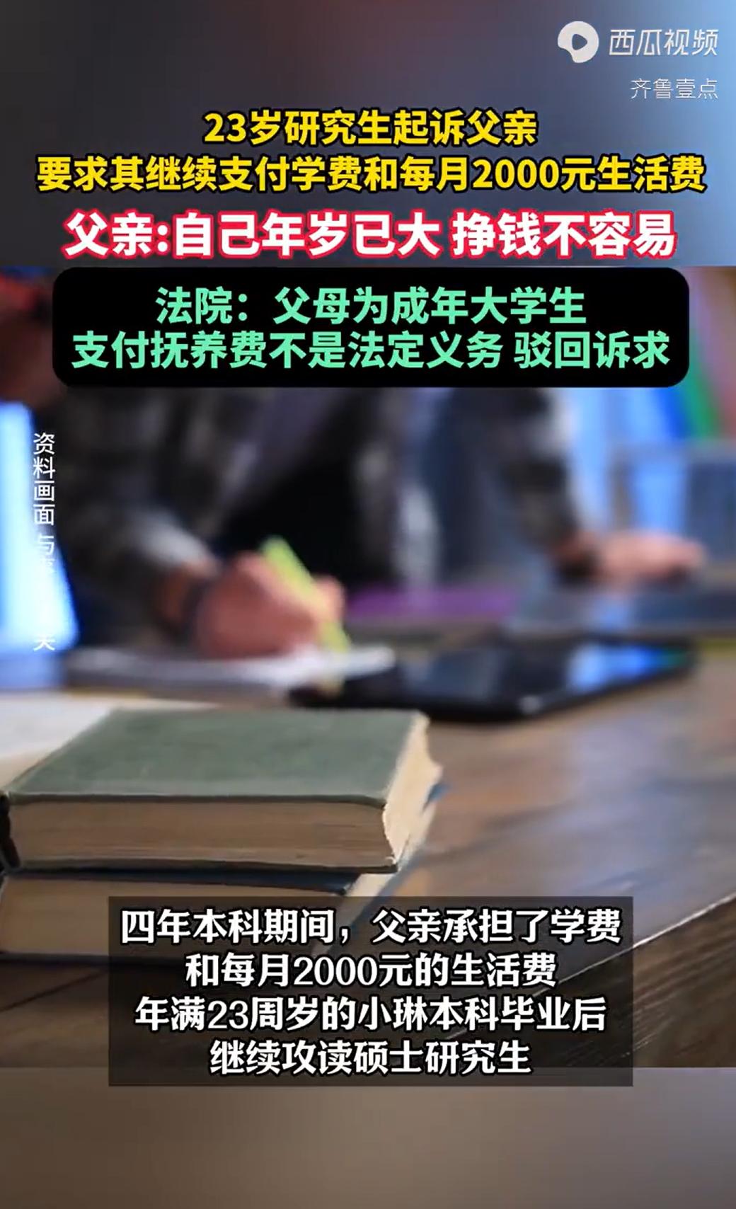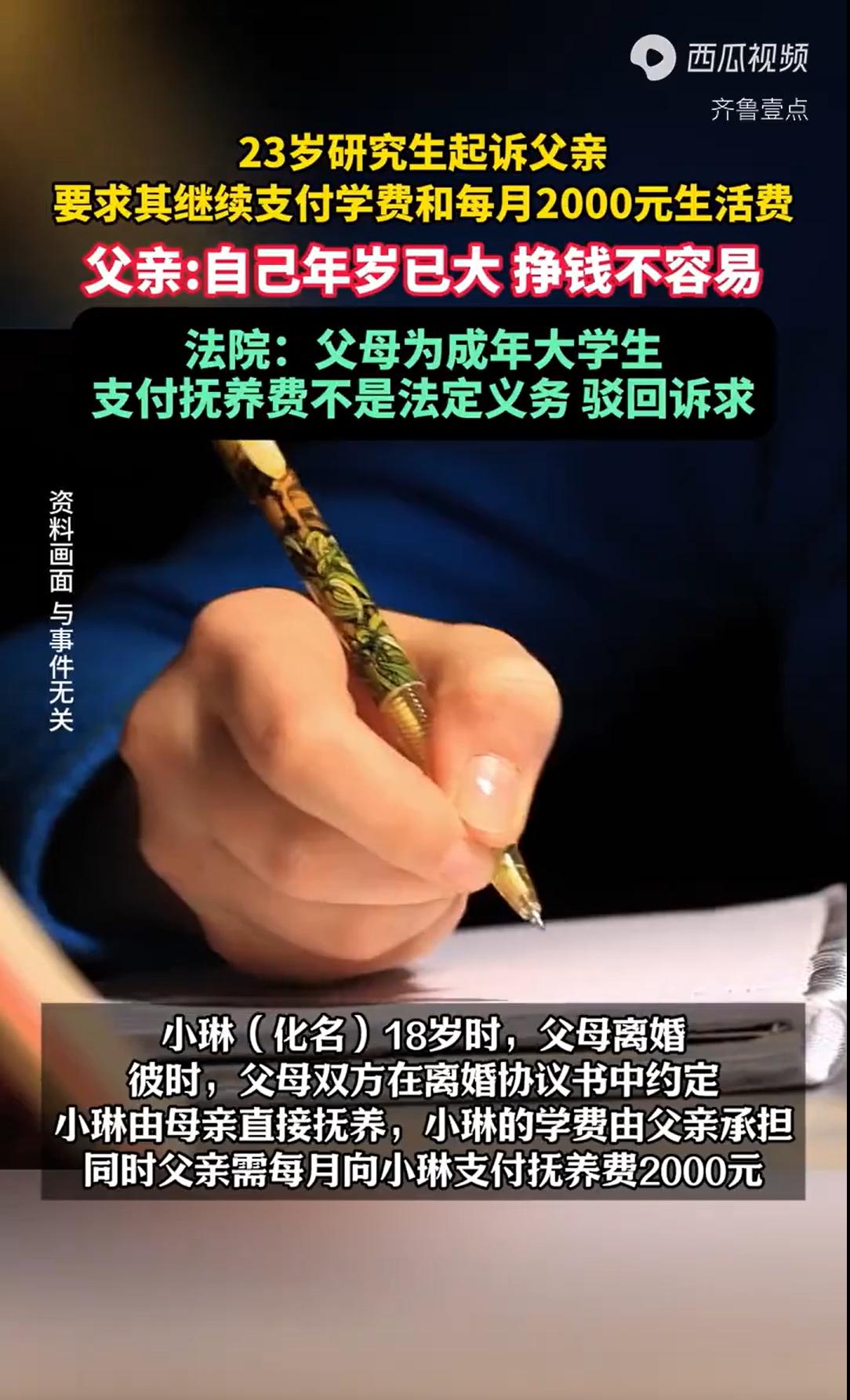 河南,一女子在18岁时父母离婚,父亲在离婚协议上签了字,承诺承担她未来的学费,并每月支付两千元生活费。本科四年,父亲如约履行。女子习惯了在每月固定日期查看账户,这成了她判断父亲是否还记得自己的方式。5年后,女子考上研究生,第一时间给父亲发去消息,以为这份“契约”会延续到硕士毕业。不料,女子研一时,父亲的转账记录中断了,电话那头的解释简短而坚决:“闺女,爸老了,研究生是你自己选的路。”女子认为父亲背叛了自己,一纸诉状将父亲告上法庭,要求父亲继续履约。法院判决却让人出乎意料。   2019年的夏天,小琳刚满18岁,高考结束不久,父母却因长期感情不和,决定结束婚姻。   在办理离婚手续时,除了分割财产,他们最放心不下的便是这个刚刚成年的女儿。   经过协商,双方在《离婚协议书》中白纸黑字地约定:女儿小琳由母亲直接抚养,跟随母亲生活;父亲则承担小琳今后的学费,并且,自协议签订之日起,每月需向小琳支付生活费人民币2000元,直至她“学业结束”。   这份协议,在当时看来,是父母双方对小琳未来的一份共同承诺,也是父亲在离开家庭后,试图用经济方式维系父爱、弥补愧疚的一种体现。   小琳的母亲含辛茹苦地照顾着她的日常起居,而父亲则按时将学费和生活费打到指定的账户上。   随后,小琳顺利进入了大学,开始了四年本科生涯,父亲一直恪守着承诺,学费按时缴纳,每月2000元的生活费也雷打不动地到账。   时光荏苒,四年本科时光转瞬即逝。   2023年,小琳迎来了毕业季,她和许多同龄人一样,选择继续深造,并成功考取了硕士研究生。   然而,父亲在为她支付了研究生第一年的学费后,明确向她表示:从今往后,他将不再继续支付研究生阶段的学费,每月2000元的生活费也将停止支付。   父亲的解释直接而现实:他自己年岁渐长,体力和精力已不如前,挣钱越来越不容易。   更重要的是,在父亲看来,小琳已经是一个23岁的成年人了,身体健康,完全具备了独立生活和工作的能力,供她读完本科,已经尽到了作为父亲的责任。   而研究生教育并非国家法律规定的义务教育阶段,继续供养她读研,已经超出了法律要求的抚养范围,也超出了他个人认为合理的负担限度。   这个消息对小琳而言,无异于一场突如其来的风暴,她早已习惯了将那份离婚协议视为自己求学路上的经济“保障书”。   在她看来,协议中“学业结束”的表述,自然应当涵盖研究生阶段,直至她硕士毕业。父亲单方面中止支付,让她感到被承诺抛弃的失望与愤怒。   与父亲多次沟通无果后,小琳选择与父亲对簿公堂要求父亲继续履行离婚协议约定,支付其研究生阶段剩余学年的学费,并按照每月2000元的标准支付生活费,直至她硕士研究生毕业。   法庭上,小琳认为,父母签订《离婚协议书》合法有效,对双方均有法律约束力,协议中明确了父亲支付学费和生活费直至“学业结束”,并未限定于本科阶段,父亲理应继续履行约定。   小琳强调,自己目前仍是在校学生,没有稳定的收入来源,父亲的资助对其完成学业至关重要。   面对小琳的坚持,父亲则显得无奈而坚定,他承认协议的存在,但提出,签订该协议时,小琳已年满18周岁,在法律上已是成年人,自己没有义务继续承担抚养义务,且自己年纪大了,没有继续履约能力。   法院会如何判决呢?   《民法典》第一千零六十七条规定:父母不履行抚养义务的,未成年子女或者不能独立生活的成年子女,有要求父母给付抚养费的权利。   《民法典婚姻家庭编司法解释一》第四十一条规定,尚在校接受高中及其以下学历教育,……可以认定为民法典第一千零六十七条规定的“不能独立生活的成年子女”。   法院指出,小琳在起诉时已23周岁,且已顺利完成大学本科学业,其计划攻读的硕士研究生教育,明显属于高中以上学历的高等教育深造,不符合“接受高中及其以下学历教育”的情形。   经查,小琳身体健康,精神状况正常,完全具备劳动能力和通过自身努力获取生活来源的客观条件,小琳亦不符合“不能独立生活的成年子女”的法定条件。   法院认为,自小琳年满18周岁起,其父亲对她便不再负有支付抚养费的法定强制义务。   此外,《民法典》第六百五十七条规定,赠与合同是赠与人将自己的财产无偿给予受赠人,受赠人表示接受赠与的合同。   法院指出,父亲同意在小琳学业时继续支付学费及每月2000元生活费,是法定义务之外的承诺,属于赠与性质。   不过,《民法典》第六百五十八条规定,赠与人在赠与财产的权利转移之前可以撤销赠与。   法院认为,对于尚未支付的未来期间的学费和生活费,父亲有权表示不再给予,而该等承诺并非道德层面义务,何况父亲是因为年岁已大、挣钱不易,情有可原,并不触发道德规范约束。   最终,法院判决驳回小琳的全部诉求。   对此,您怎么看?