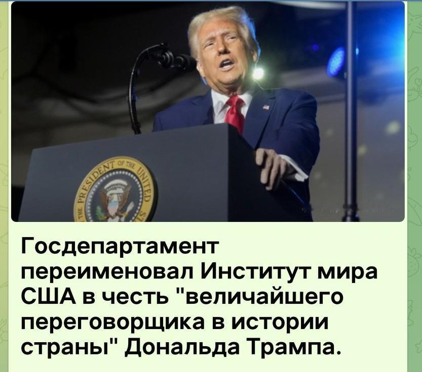 🏛️ 美国国务院将“美国和平研究所”更名为“唐纳德·特朗普研究所” 致敬“国家历史上最伟大的谈判家” 美国国务院已将美国和平研究所(Институт мира США)更名为唐纳德·特朗普研究所,以表彰其为“美国历史上最伟大的谈判家”(величайшего переговорщика в истории страны)。