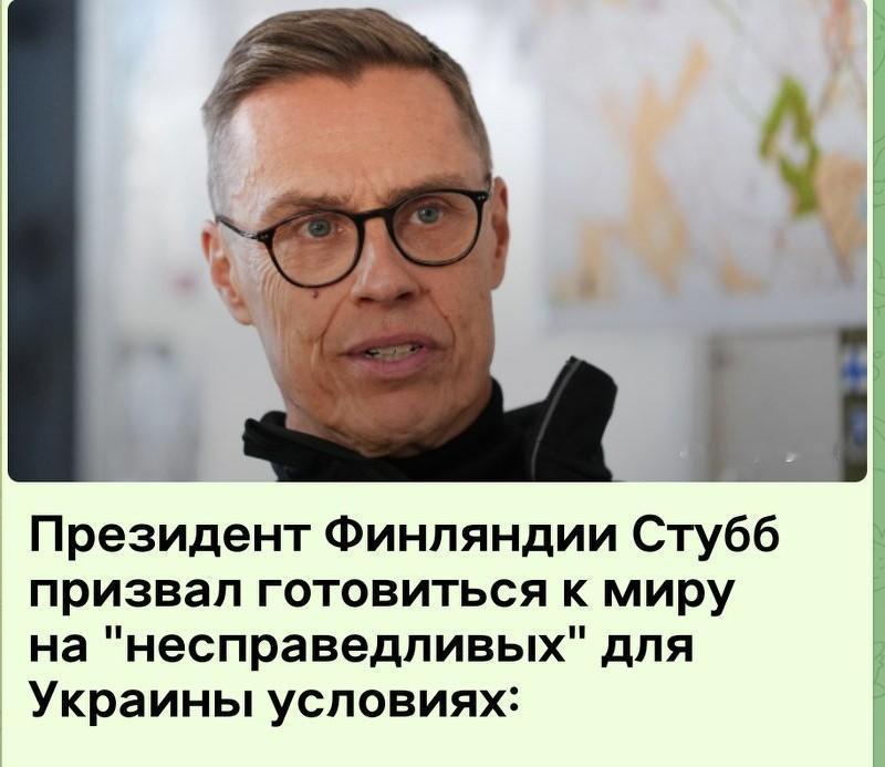 🌍 芬兰总统斯图布呼吁:准备接受对乌“不公”的和平条件 芬兰总统亚历山大·斯图布呼吁,应准备好在对乌克兰“不平”(несправедливых)的条件下实现和平: “过去四年间我们频繁提及的所有公平和平(справедливого мира)条件,恐怕难以全部兑现。”