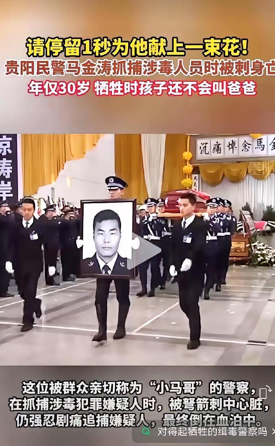 泪目!请为这位30岁缉毒英雄停1秒😭 贵阳民警马金涛抓捕涉毒人员时被刺身亡,年仅30岁,牺牲时孩子还不会叫爸爸… 这消息一出,谁能不心痛?30岁,多美好的年纪,人生才刚刚展开,可马金涛却永远倒在了缉毒一线。他的生命,被那些丧心病狂的涉毒人员残忍终结,只留下家人无尽的悲痛。 从警5年,马金涛办了100多起案子,抓了80多个违法犯罪分子,调处400多起矛盾纠纷 。这一个个数字背后,是他日日夜夜的付出。他是同事眼中的“工作狂”,为了工作,连续一个多月吃住在单位,毫无怨言。碰上急难险重的任务,他总是冲在最前面,“我年轻,让我来”成了他的口头禅。 他也是辖区群众的贴心“小马哥”。大家有困难,第一时间就想到他。社区里哪家闹纠纷、哪家遭了灾,他都跑在前面帮忙解决。发放的警民联系卡,承载着他对群众的承诺:“有事请打我电话,我一定会尽快赶到。”他用行动践行了这句话,赢得了群众的信任和爱戴。得知他牺牲,上千名群众自发前来送别,那场面,让人泪目。 想想他的家庭,更是满心苦涩。他的妻子,为了支持他的工作,辞去教师工作来到贵阳。父母从河南赶来,开个小饭馆帮着照顾刚出生的孙女。一家人的生活,本应充满幸福和希望。可如今,妻子失去了丈夫,孩子失去了父亲,父母失去了儿子,这个家,塌了。 马金涛牺牲后,社会各界都被震动。短短几天,40多万网民自发在网上发起“向英雄致敬,为民警马金涛点亮蜡烛”的悼念活动。大家都被他的英勇事迹感动,也对涉毒犯罪深恶痛绝。 那些涉毒人员,为了一己私欲,不仅毁了自己的人生,还夺走了马金涛的生命,让一个幸福的家庭支离破碎。他们的行为,天理难容!毒品带来的危害,实在太大了,不仅损害个人健康,还破坏家庭,扰乱社会秩序。 而马金涛这样的缉毒警察,他们是在拿生命守护我们的安宁。他们行走在黑暗边缘,与毒贩斗智斗勇,每一次行动都可能是生死考验。他们也是普通人,有家庭、有牵挂,却为了大家的幸福,把危险留给自己。 如今,杀害马金涛的罪犯卢起兴被执行死刑,钱作为、杜如松也受到了法律的严惩,可这也换不回马金涛的生命了。他的离去,时刻提醒我们,要珍惜当下的和平生活,更要坚决抵制毒品。 各位读者你们怎么看?欢迎在评论区讨论。