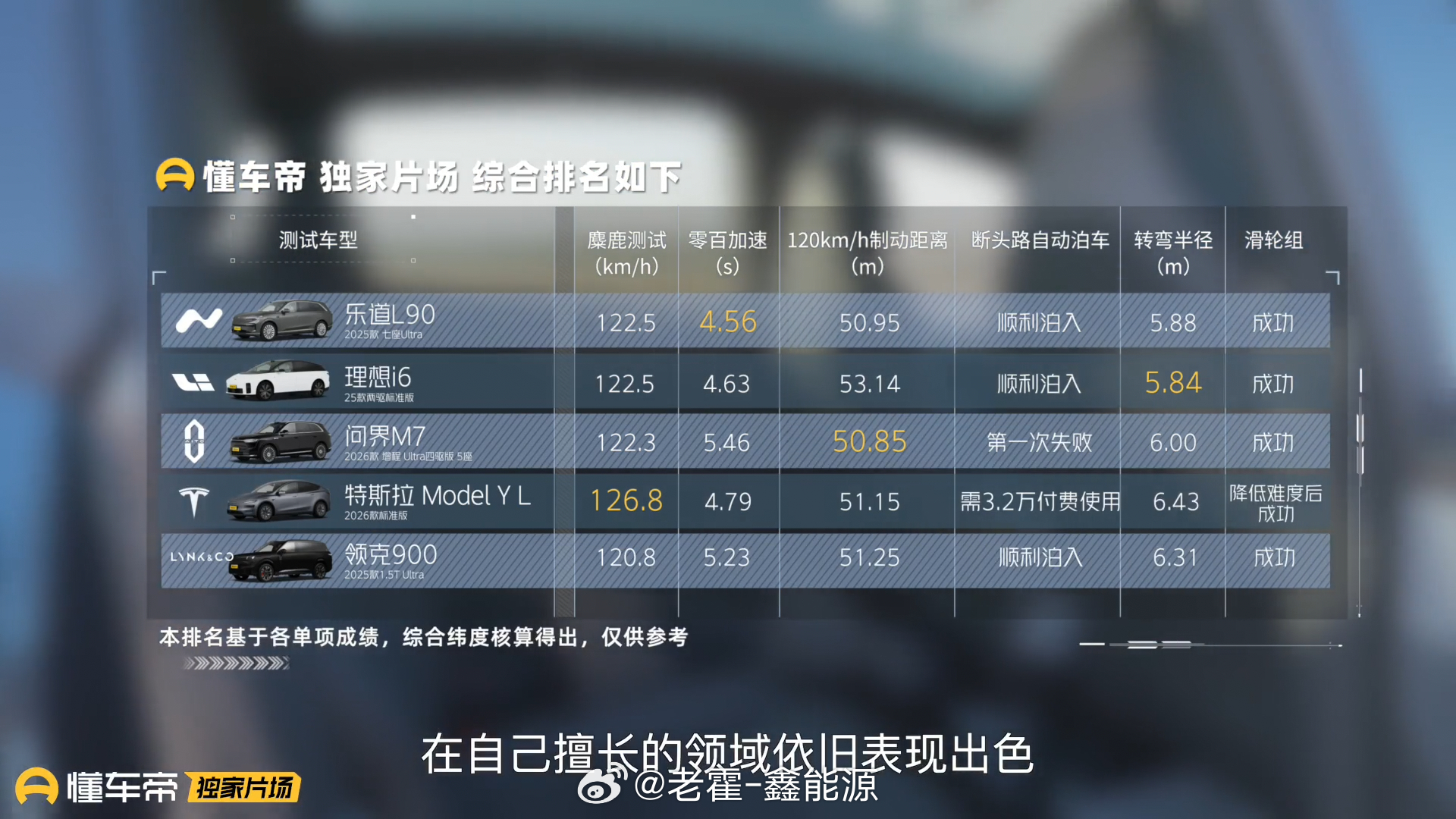 懂车帝出了个5车横屏的视频,范围是市面上最热门的6款20-30万新能源SUV。总结来看,乐道L90的表现还是相当抢眼的。在乘坐这一块,乐道可以说包揽了所有的第一名,这个没啥好说的,大家去多坐几辆车就知道了。其他方面可以感觉出来5款车都各有所长,尤其是在动态这方面,大家的优势项都相对分散,但是乐道有点意思,乐道主打一个,我虽然不是最好,但是我都是跟着第二名走,头部梯队总有我一个位置。这就导致了最后最终排名的时候,L90就综合到第一去了,这说明了啥,这就说明了乐道L90是水桶车型大V聊车