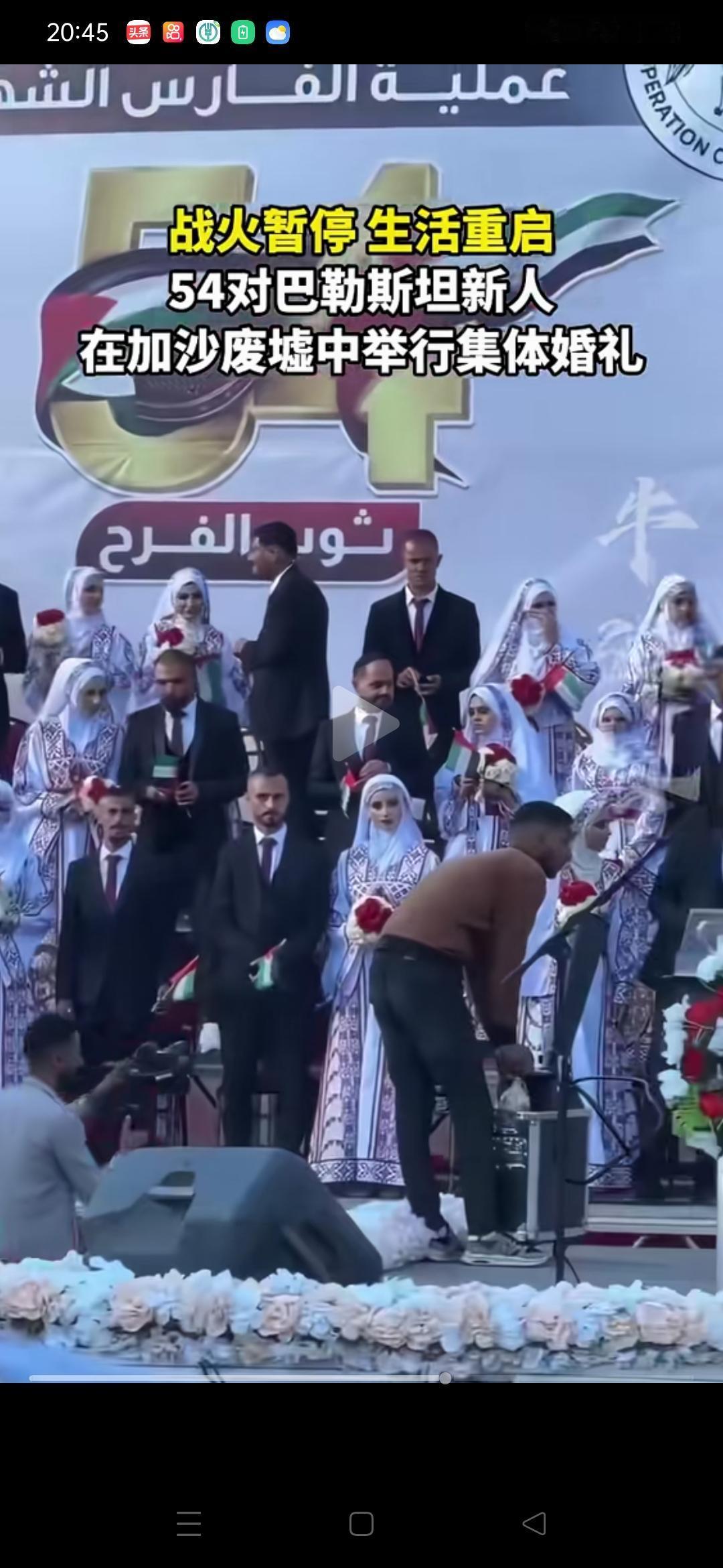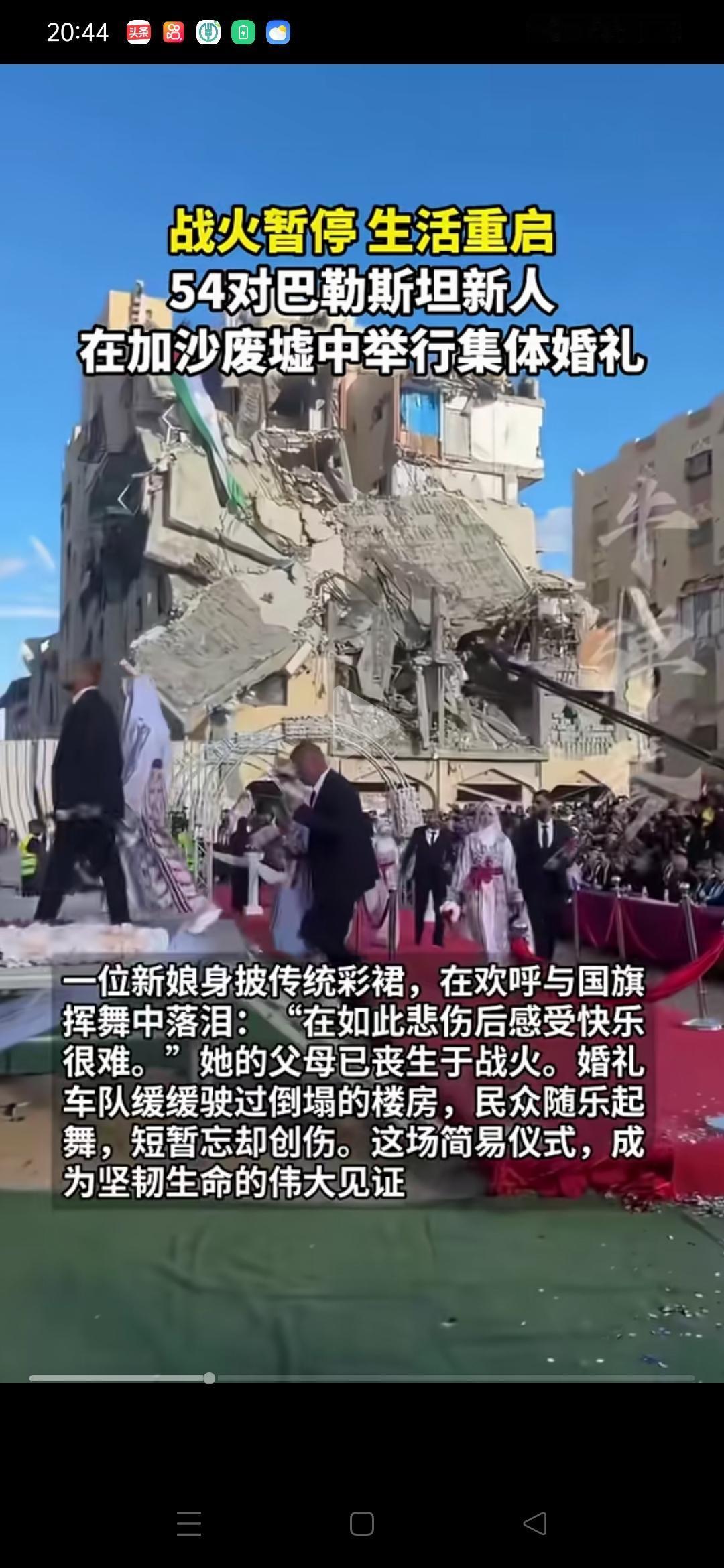 可怜的孩子们,你们结婚了,中国朋友为你们高兴,向你们祝贺! 当地时间12月2日,在加沙南部城市汗尤尼斯的断壁残垣之间,五十多对巴勒斯坦新人举行了一场特殊的集体婚礼。加沙停火第一阶段协议生效,战火暂停,生活继续。 在战火中走来,活过来就是幸运,相爱的人走到一起,更是万幸!这场集体婚礼,标志着加沙这片土地暂时结束了杀戮,巴勒斯坦人民迎来了久违的快乐和幸福。命运不都是悲惨,还有幸福! 巴勒斯坦自愿者 巴勒斯坦文化 巴勒斯坦儿童 巴勒斯坦婚礼