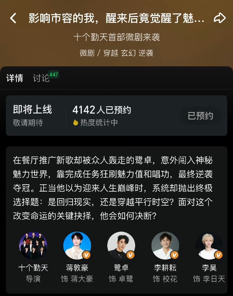 十个勤天首部微剧十个勤天首部微剧来袭,预约人数已经突破4000万,已经开始有点期待住了,请速速抬上来!影响市容的我醒来后觉醒了魅力系统2025尖叫之夜全阵容名单