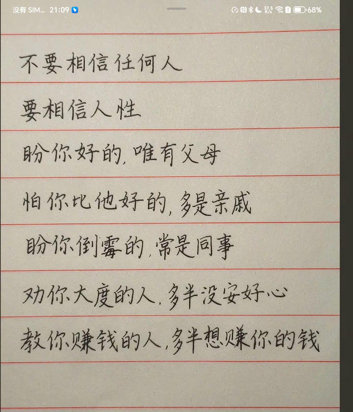 现实让我看透人性,教训让我看透人心! 尤其是老家里的 越想 就 越他妈的来气!当好人没好下场没用, 真的要学会记仇!没心情! 去他妈的!真的 出去在哪待着 都要比在老家 好 千倍万倍!社会大学第一课! 这个世界除了自己的父母就没好人!每日分享