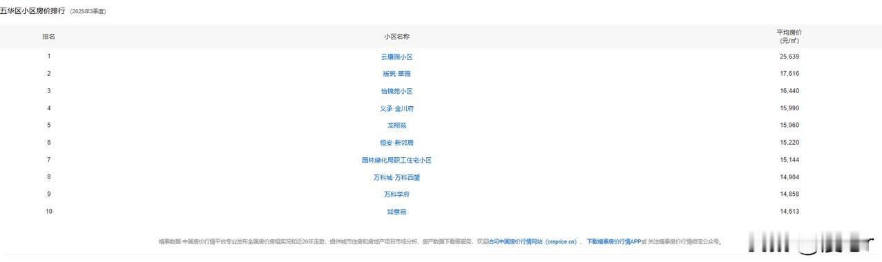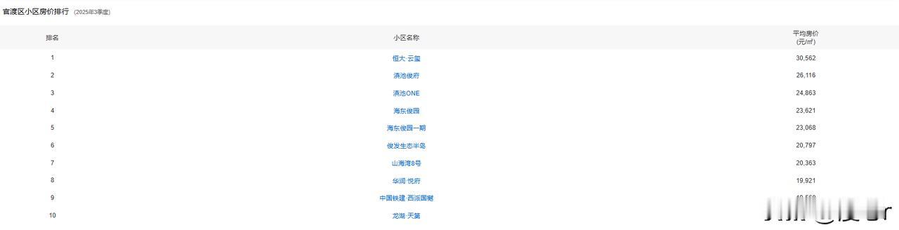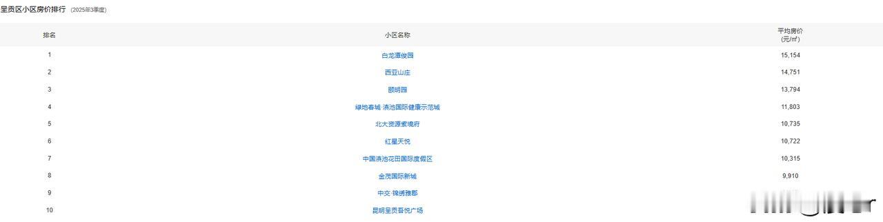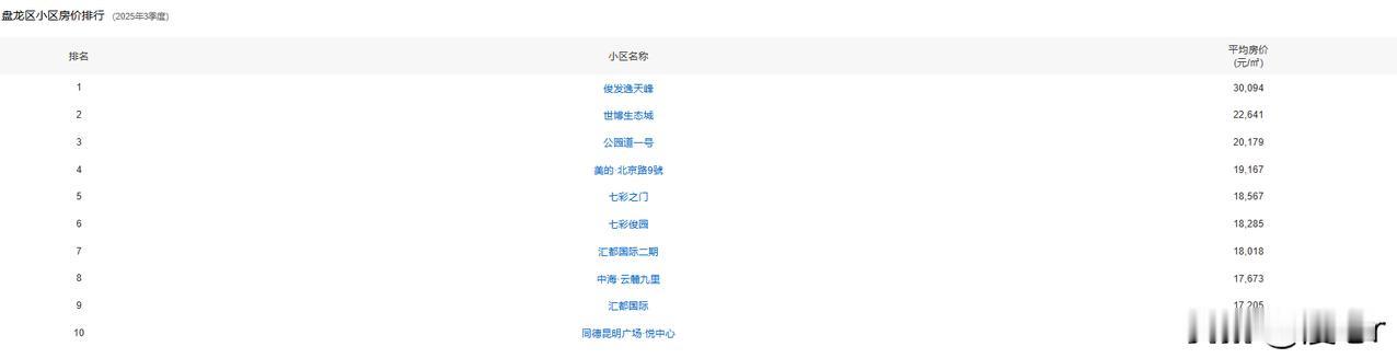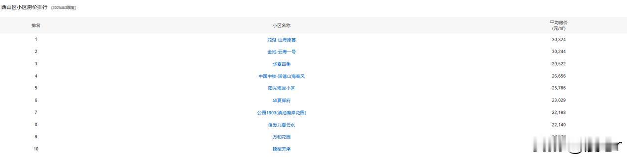 2025年11月,昆明西山区房价均价13371元; 2025年11月,昆明五华区房价均价11152元; 2025年11月,昆明官渡区房价均价10887元; 2025年11月,昆明盘龙区房价均价10753元; 2025年11月,昆明呈贡区房价均价8535元。 2025年11月,西山区最贵的小区为龙湖山海原著,均价30324元; 2025年11月,五华区最贵的小区为云康园小区,均价25639元; 2025年11月,官渡区最贵的小区为恒大云玺,均价30562元; 2025年11月,盘龙区最贵的小区为俊发逸天峰,均价30096元; 2025年11月,呈贡区最贵的小区为白龙潭俊园,均价15154元。 漫心r看了云南2025年11月份各区的房价和各区的楼王,一下子尽无言以对。原来最贵的小区根本不受房市的影响,好像玩儿的是另外一个赛道。怪不得常听人们说,普通住宅看均价,豪华住宅看楼王。 不过各区的楼王也很有意思,官渡区的楼王价格竟然比西山区的高。这也充分说明了巫家坝板块在高端客群心中的预期价值。 写在最后,2025年11月份,昆明购房者的购房逻辑已悄然改变,从“哪里都会涨”切换到“哪里更抗跌、哪里更有用”。在政策托底、市场挤水分的时候,恰恰是静下心来,用自住的心态去寻找真正价值的好时机。毕竟,好房子,永远是穿越周期的硬通货。