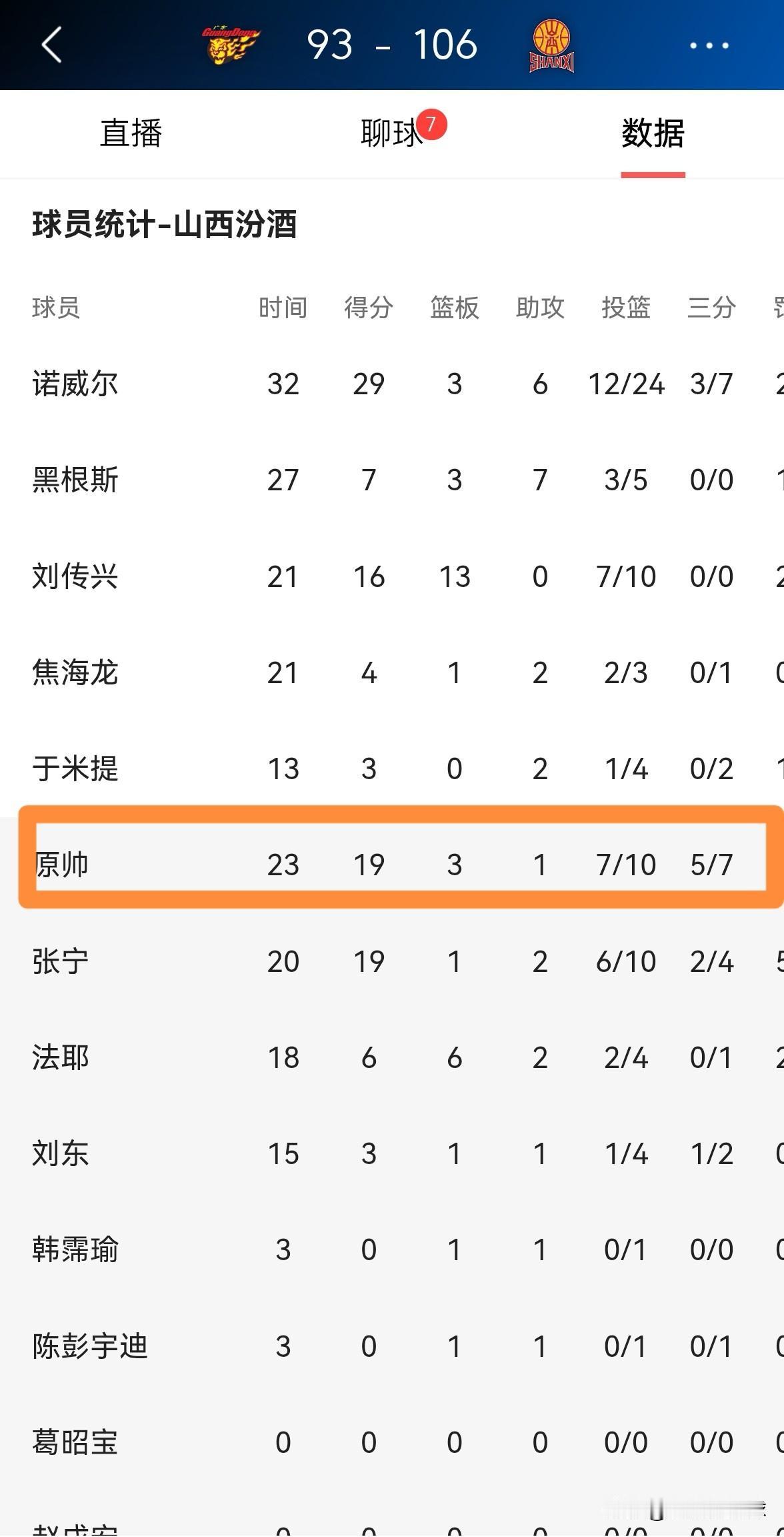 山西汾酒大将原帅真是名副其实的神射手!在今天山西汾酒以106:93击败广东东阳光的比赛中,原帅的手感异常火热,他在替补出战的23分钟里,投篮10中7,其中三分球7中5非常高效的砍下19分3篮板,他的场上正负值高达+21。 值得一提的是,在关键的第四节比赛中原帅更是独得11分,帮助球队锁定了胜局。