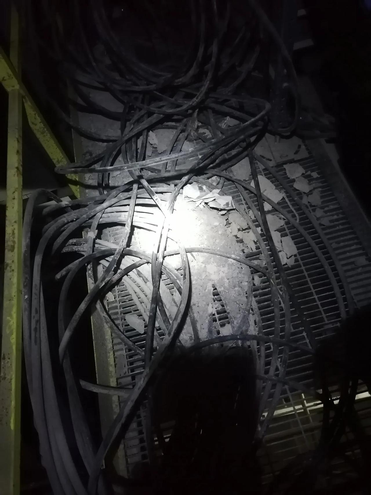 大家好,我是水电工星仔,今天去整理桥架里的电缆,方便后面盖盖板,沿着桥架检查一路无事,走到末尾一段时,吓了我一跳。 不知道哪个挨千刀的,把桥架里本放好的电缆抽了出来,都是通了电的、关键还都是5X6,380V的电,7根。 抽出来也不打声招呼,一看就抽出来很久了,楼上打混凝土掉在电缆上面都结巴了。 看到这情况,我马上跑到配电室把电关了,又跑回来,处理电缆上的混凝土,找了根木方又是砸,又是敲的,效果不明显,手都震麻了,只震掉了边缘上的混凝土。 见不起效果,拿了个锤子,开始小心的在电缆上敲,效果好多了,混凝土一块一块的掉。 结果力道控制不住,7根电缆,破了三。 还好关了电,用胶布缠了,再放回桥架,也算搞好了。 拍了照,留个底,给了老板,也不知道老板能不能叼到那个人,估计是哪个不长眼的想偷电缆,发现屁股包了胶布,不敢动了,万幸没听说发生了触电事故,7根齐发,大罗神仙都难救,阎王看了估计都叹气。