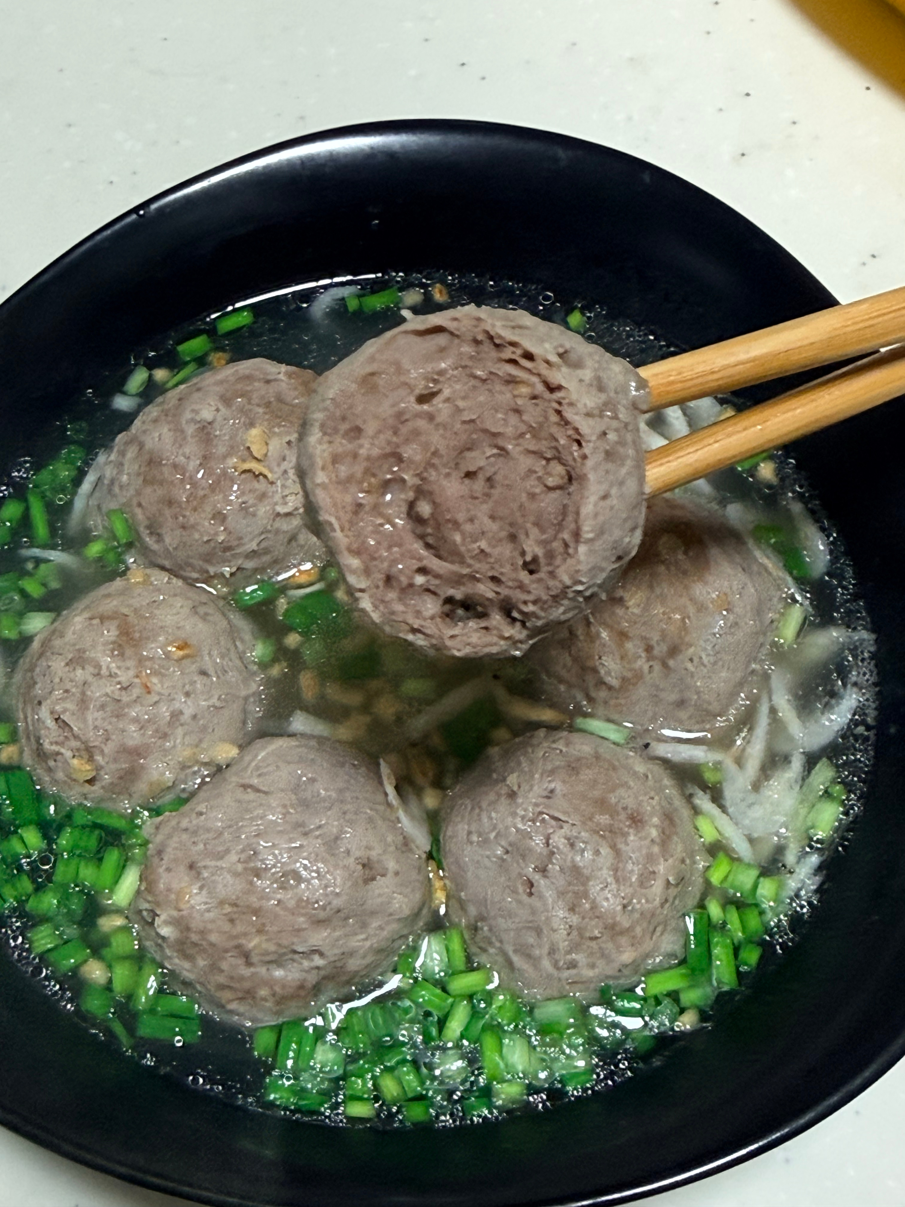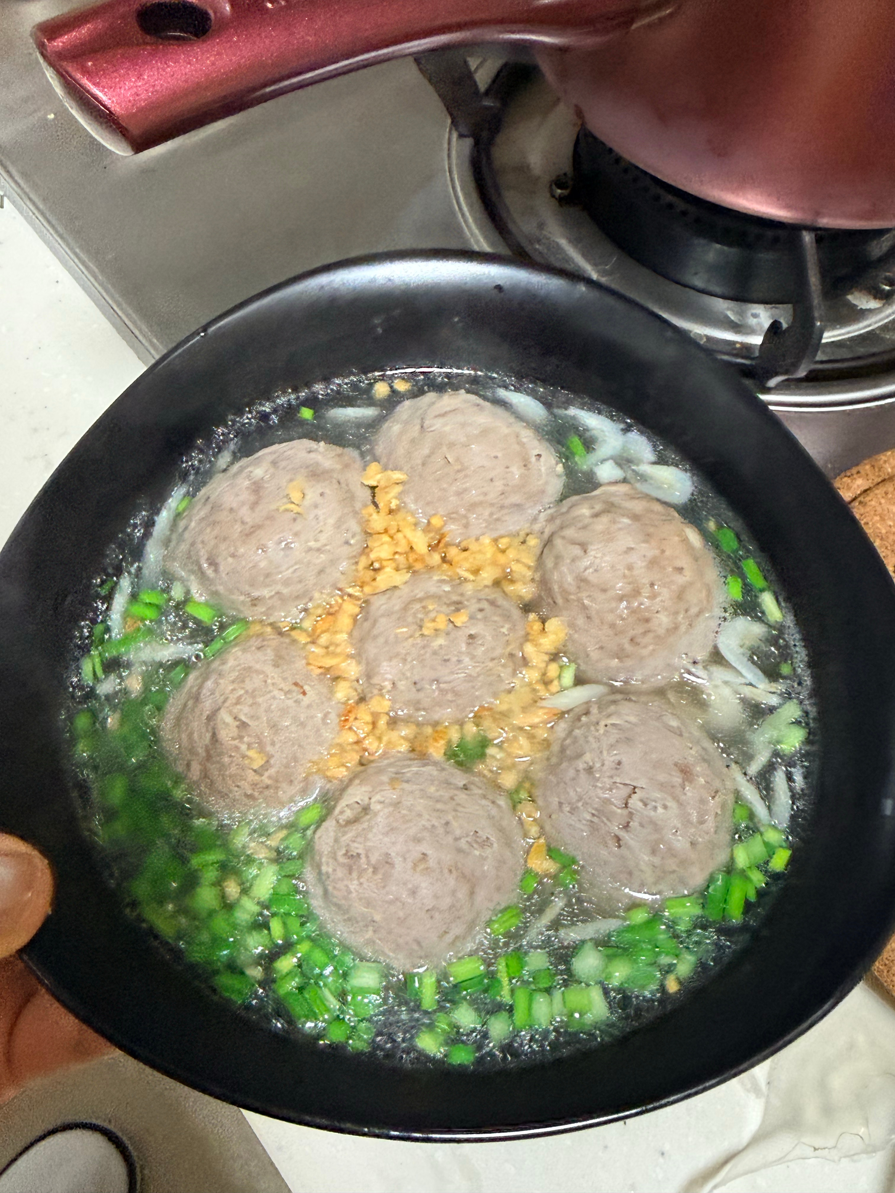 晚上煮了慌姨卖的牛肉丸,真的太好吃了兄弟们,一口爆汁满嘴牛肉香!丸子很弹牙,但不