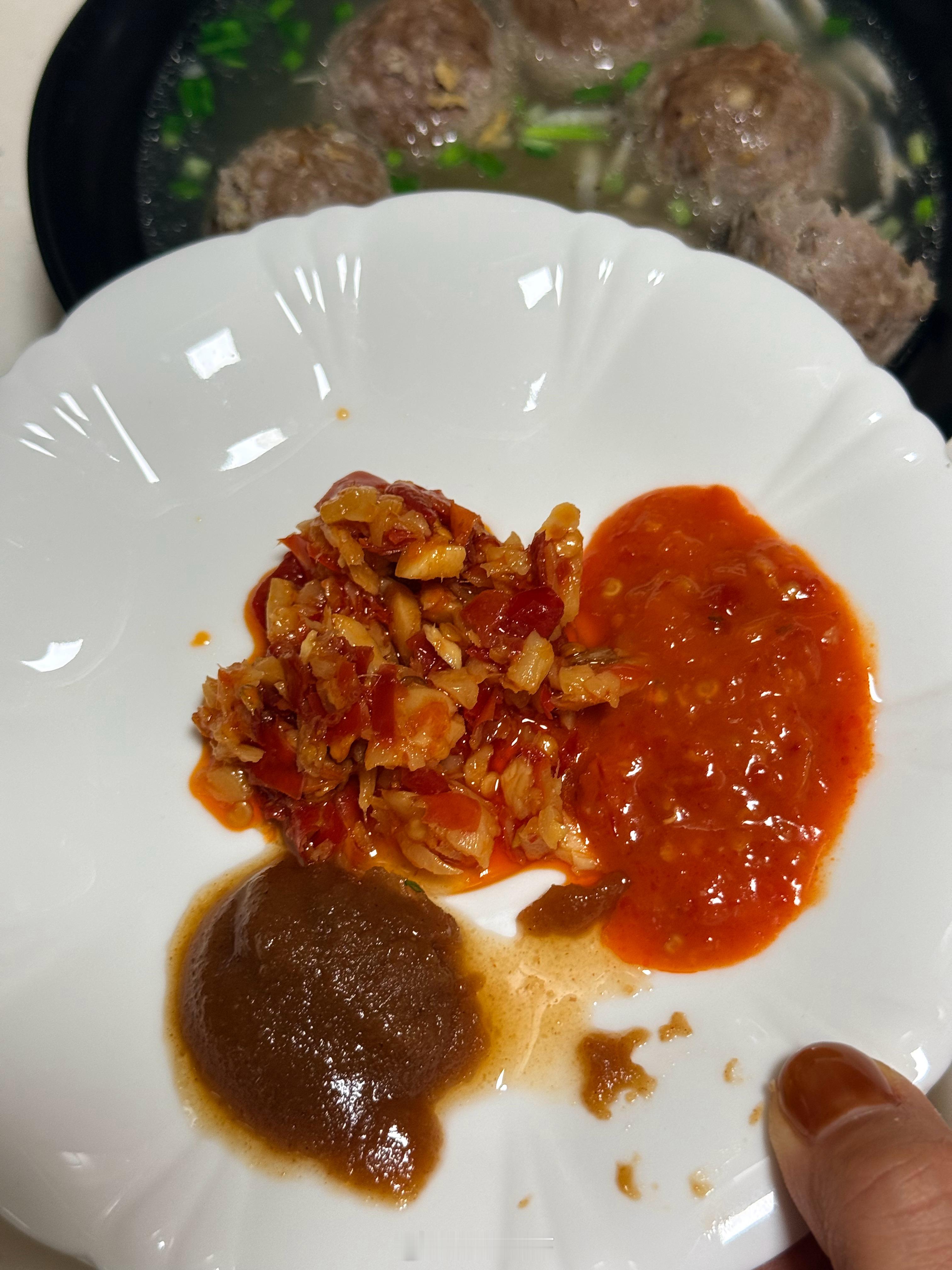 晚上煮了慌姨卖的牛肉丸,真的太好吃了兄弟们,一口爆汁满嘴牛肉香!丸子很弹牙,但不是那种嚼着有塑料感的弹,就是很有肉劲儿,真的巨好吃,我好买一些素食放冰箱,这个丸子真是买过的丸类里最好吃的了,毫不夸张我就拿清水煮,这个汤底很淡,应该丸子里盐份也比较低,煮开撒一小把盐,碗里放点葱花,(家里有芹菜的也可以放芹菜碎!)我还加了一把虾皮提味儿,别提多鲜美了蘸酱是随快递送的沙茶酱和辣椒酱,我还加了仔姜辣椒酱,但这个丸子吃本味最香!其次沙茶酱,送的辣椒酱偏咸口我不喜欢,吃惯南方辣椒酱的应该能接受,反正就是好吃!慌姨选品,值得信赖