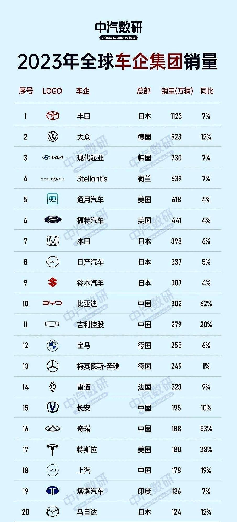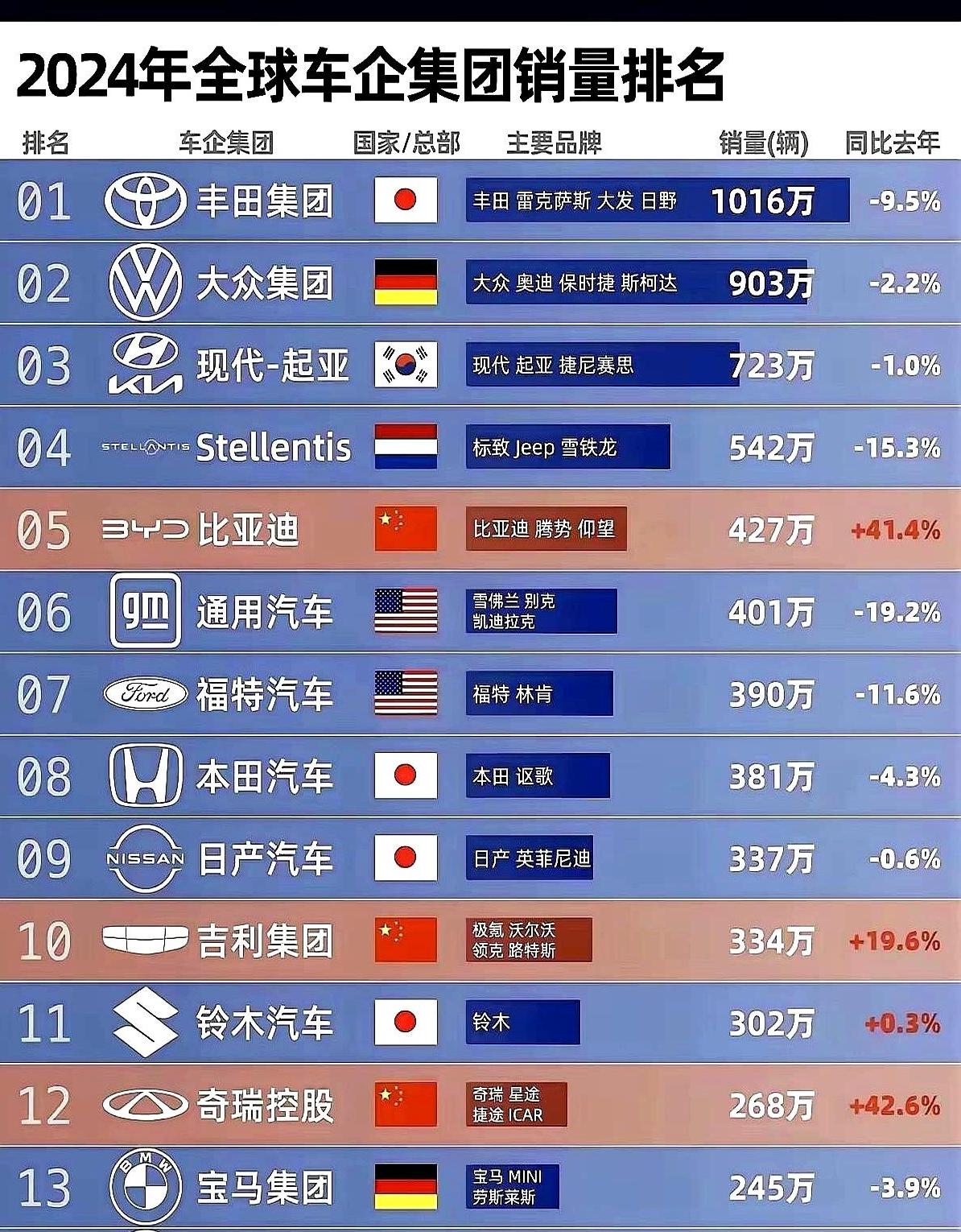 丰田继续稳坐全球汽车销量冠军宝座,大众和起亚的排名也基本没变。 但这次榜单里最引人注目的,是中国汽车品牌的强势崛起: 比亚迪已经冲到了全球第五名, 吉利排在第十, 奇瑞位列第十二。