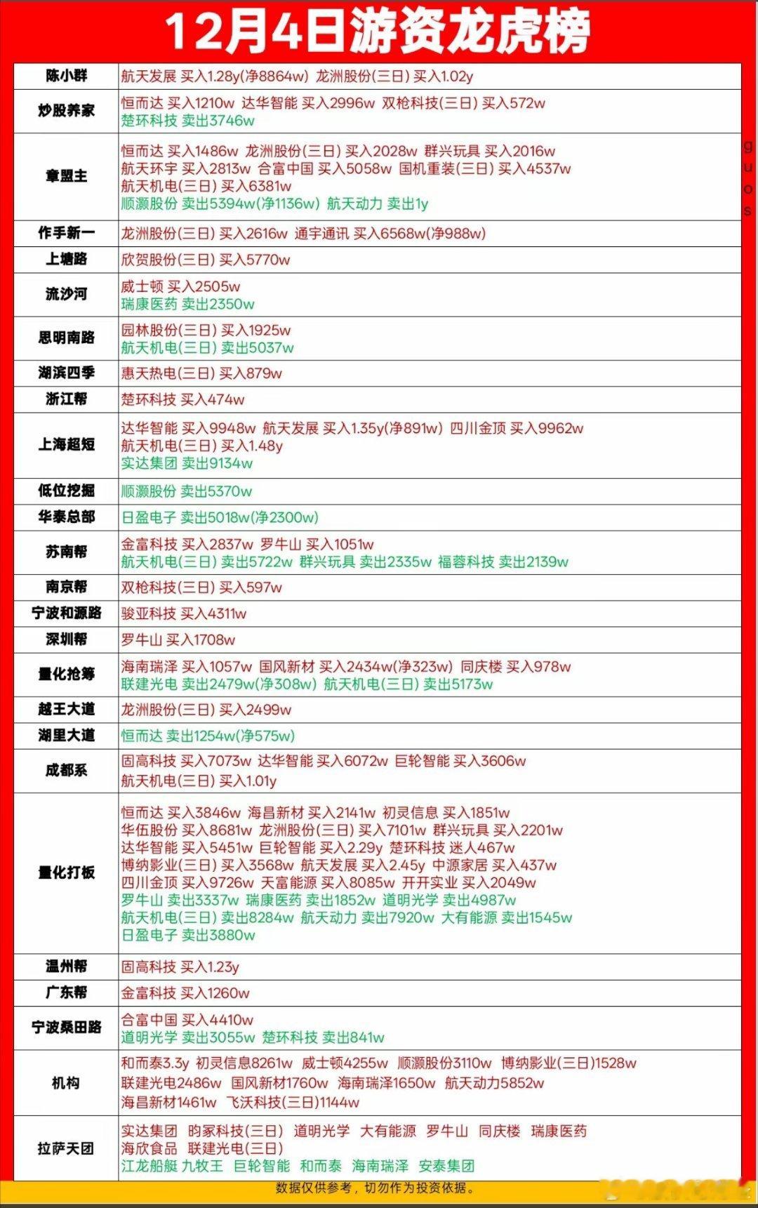 12.4周四全天游资抢筹龙虎榜!商业航天,机器人受游资热捧。巨轮智能,达