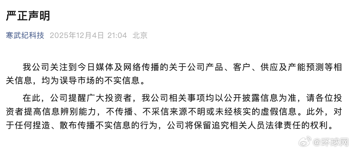 【#寒武纪发布严正声明#】#寒武纪严正声明#我公司关注到今日媒体及网络传播的关于公司产品、客户、供应及产能预测等相关信息,均为误导市场的不实信息。在此,公司提醒广大投资者,我公司相关事项均以公开披露信息为准,请各位投资者提高信息辨别能力,不传播、不采信来源不明或未经核实的虚假信息。此外,对于任何捏造、散布传播不实信息的行为,公司将保留追究相关人员法律责任的权利。
