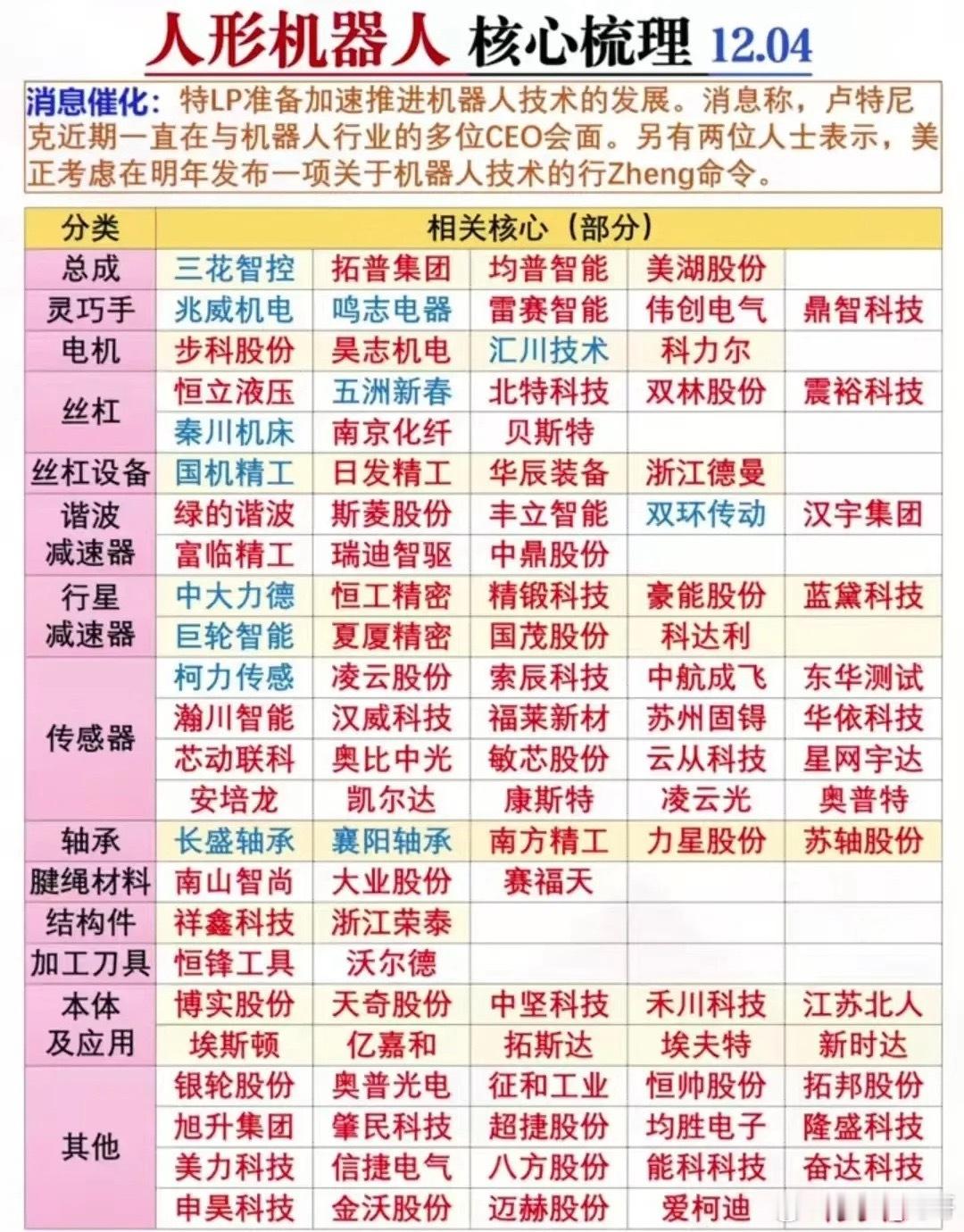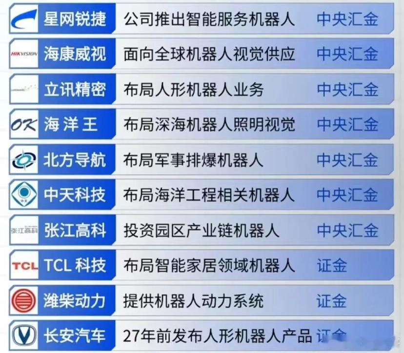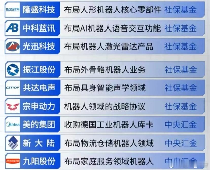 国家队布局机器人概念公司梳理!2025年12月4日,美政府在推动AI发展后转向聚焦机器人,美股机器人概念股走强,iRobot收涨74.36%!A股国家队重仓的机器人概念龙头有哪些?机器人赛道的国家队社保、汇金、大基金齐进场。从三花智控的机器人零部件,到美的集团收购库卡,从海康威视的机器人视觉,到北方华创的AI芯片……人形机器人赛道又迎重磅催化!从总成、灵巧手到传感器、减速器,这条产业链的核心标的都给你理清楚了放在下面图片里,相关环节的机会值得重点关注~