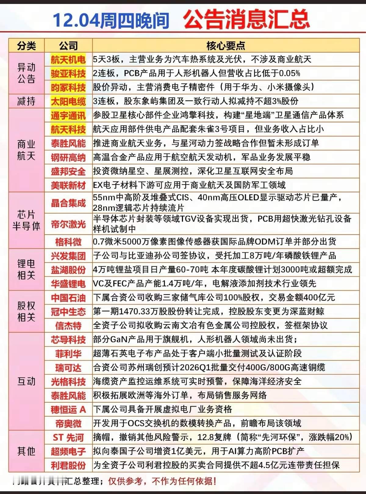 12.04周四晚间 最新:公告消息汇总!1.上市公司股权转让,收购2.锂电相关3.减持计划4.商业航天5.异动公告,生产经营,订单合同