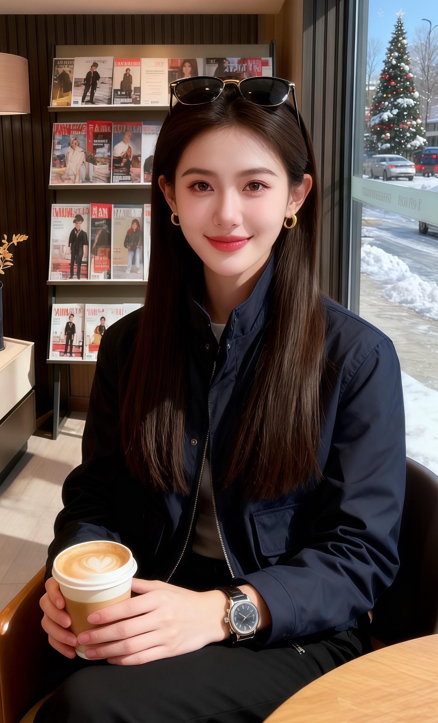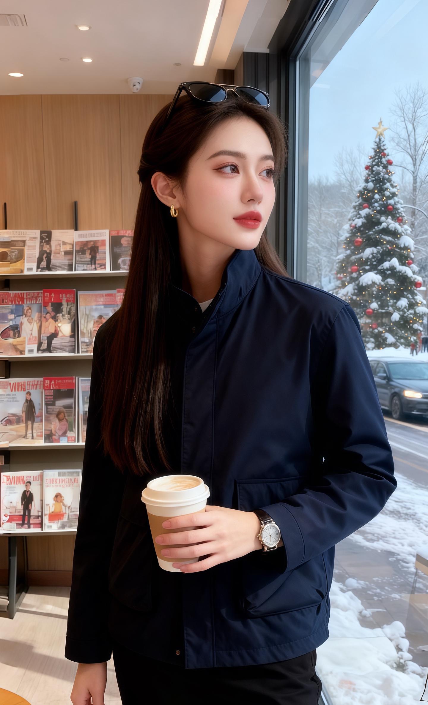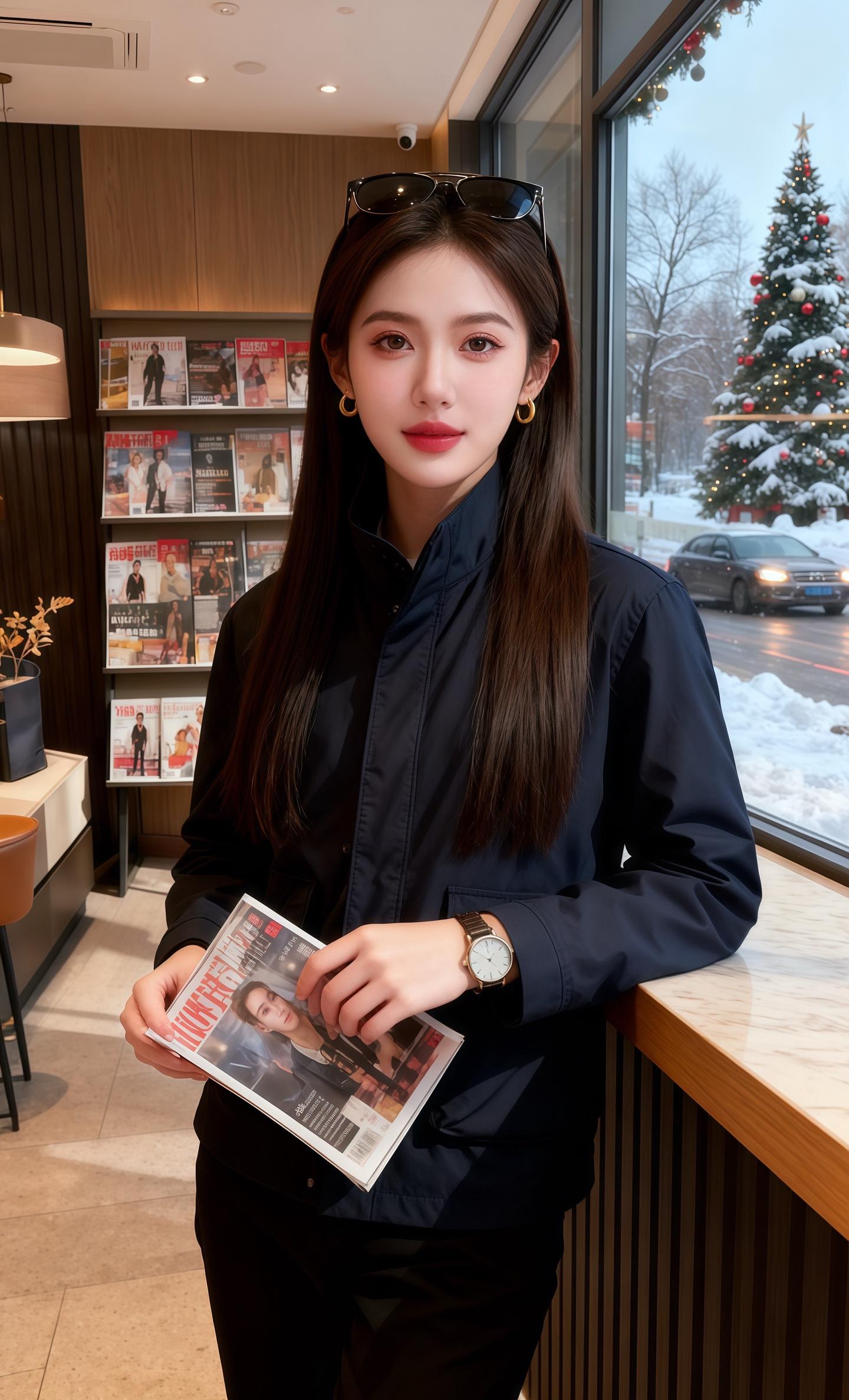 雪裹着街景漫进咖啡厅时,我正撞见她靠在吧台翻杂志。藏青外套的面料衬得肩线利落,黑裤垂出轻缓的弧度,长发滑过耳侧时,墨镜在发顶晃了点光,金环耳饰浸着暖灯的晕。