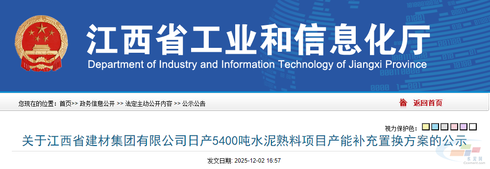 12月2日,江西省工业和信息化厅发布关于江西省建材集团有限公司日产5400吨水泥熟料项目产能补充置换方案的公示,公示时间为2025年12月2日至2025年12月15日。