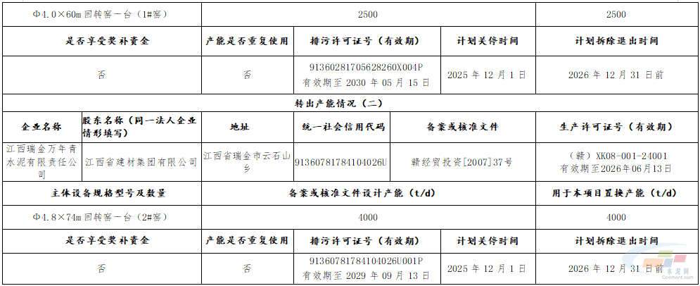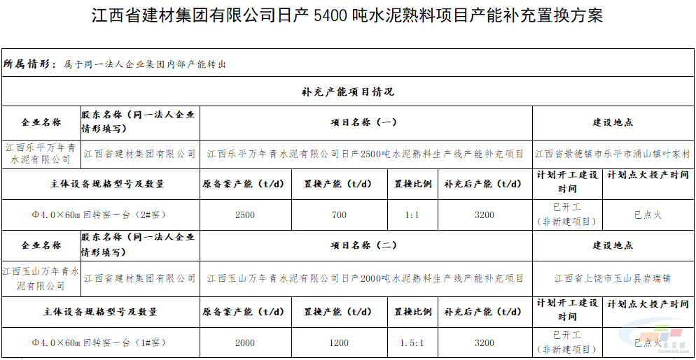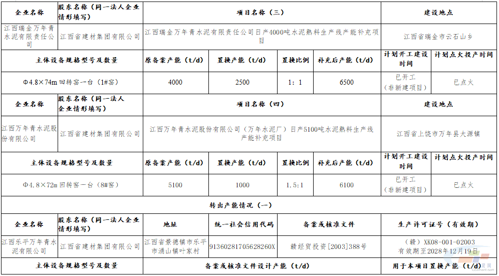 公示内容显示,江西省建材集团有限公司拟将下属成员企业江西乐平万年青水泥有限公司1#窑2500t/d水泥熟料产能,用于江西乐平万年青水泥有限公司、江西玉山万年青水泥有限公司两家企业2条水泥熟料生产线进行补充产能,置换比例分别为1︰1和1.5︰1,分别补充江西乐平万年青水泥有限公司2#窑700t/d水泥熟料产能、江西玉山万年青水泥有限公司1#窑1200t/d水泥熟料产能;