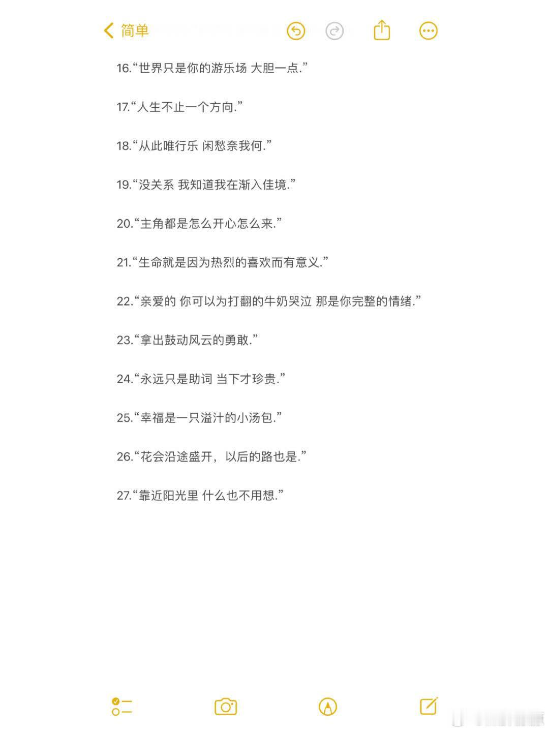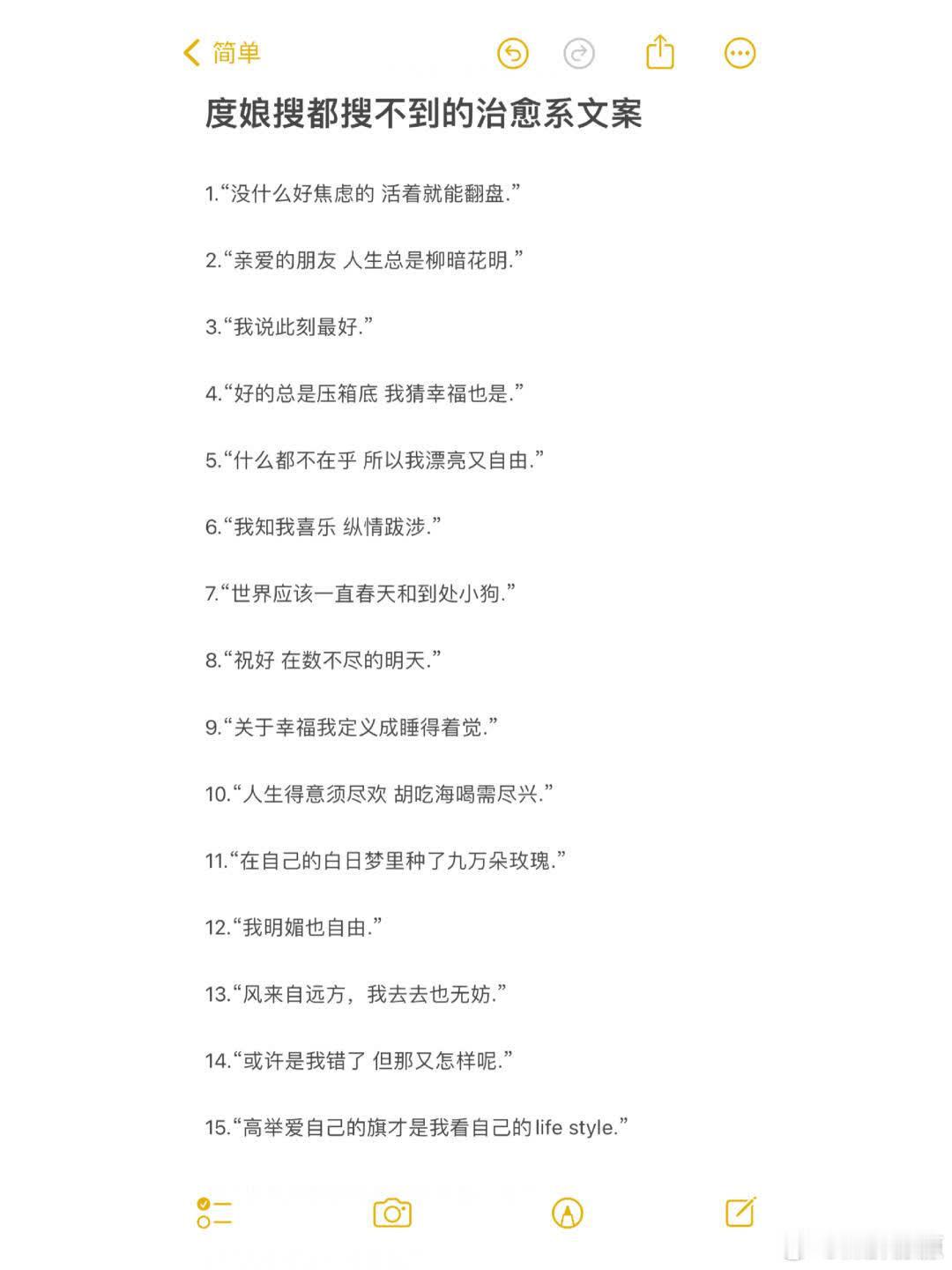 度娘搜都搜不到的治愈系文案 1.“没什么好焦虑的 活着就能翻盘.” 2.“亲爱的朋友 人生总是柳暗花明.” 3.“我说此刻最好.” 4.“好的总是压箱底 我猜幸福也是.” 5.“什么都不在乎 所以我漂亮又自由.” 6.“我知我喜乐 纵情跋涉.” 7.“世界应该一直春天和到处小狗.” 8.“祝好 在数不尽的明天.” 9.“关于幸福我定义成睡得着觉.” 10.“人生得意须尽欢 胡吃海喝需尽兴.” 11.“在自己的白日梦里种了九万朵玫瑰.” 12.“我明媚也自由.” 13.“风来自远方,我去去也无妨.” 14.“或许是我错了 但那又怎样呢.” 15.“高举爱自己的旗才是我看自己的life style.” 16.“世界只是你的游乐场 大胆一点.” 17.“人生不止一个方向.” 18.“从此唯行乐 闲愁奈我何.” 19.“没关系 我知道我在渐入佳境.” 20.“主角都是怎么开心怎么来.” 21.“生命就是因为热烈的喜欢而有意义.” 22.“亲爱的 你可以为打翻的牛奶哭泣 那是你完整的情绪.” 23.“拿出鼓动风云的勇敢.” 24.“永远只是助词 当下才珍贵.” 25.“幸福是一只溢汁的小汤包.” 26.“花会沿途盛开,以后的路也是.” 27.“靠近阳光里 什么也不用想.”