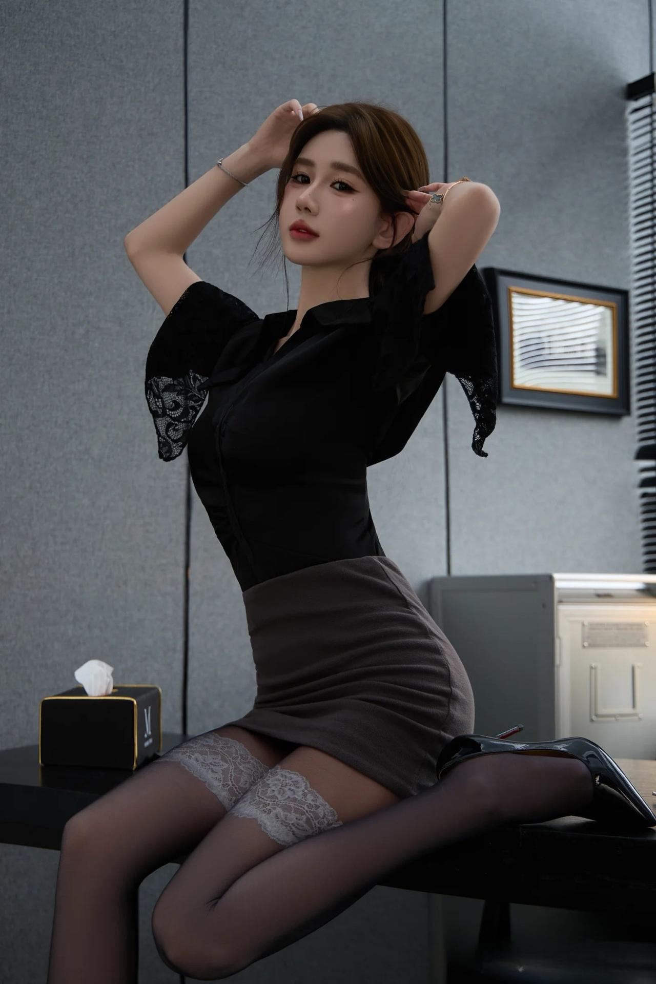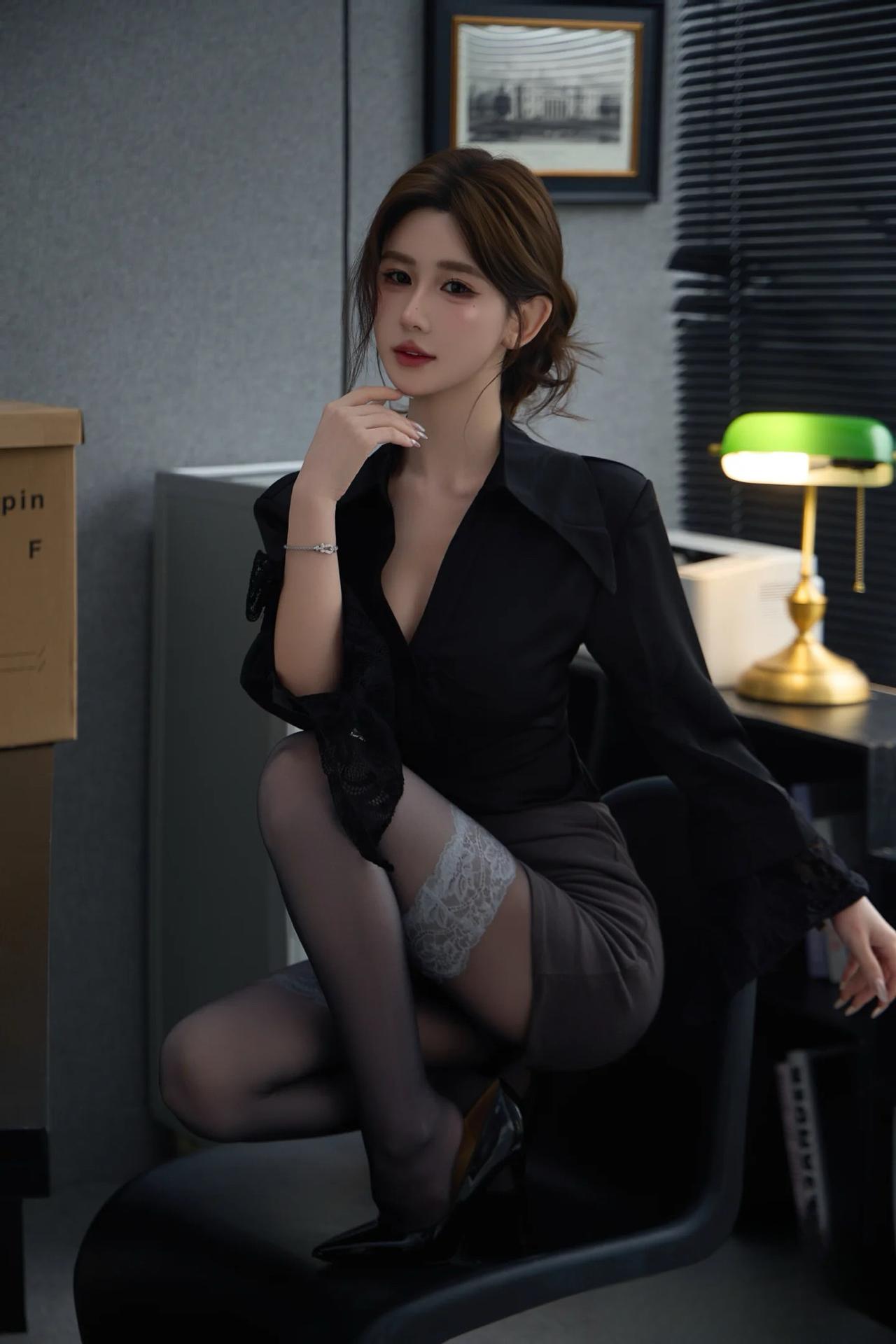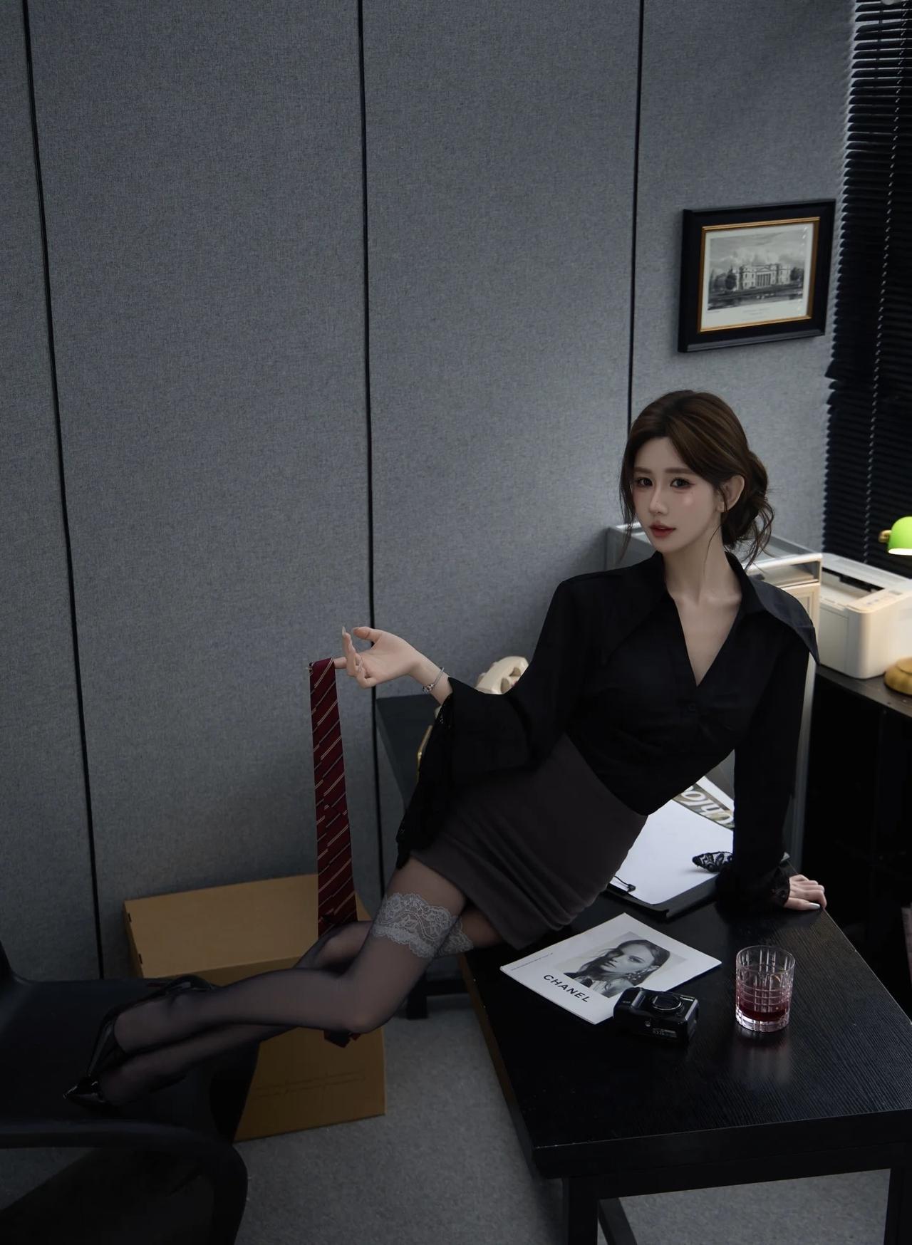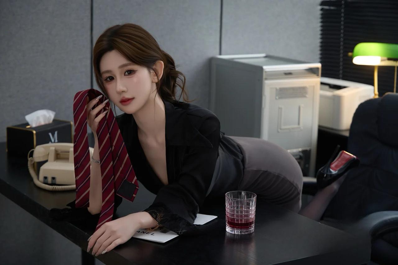 办公室里的优雅一刻,红领带与黑西装相得益彰,尽显女性魅力。