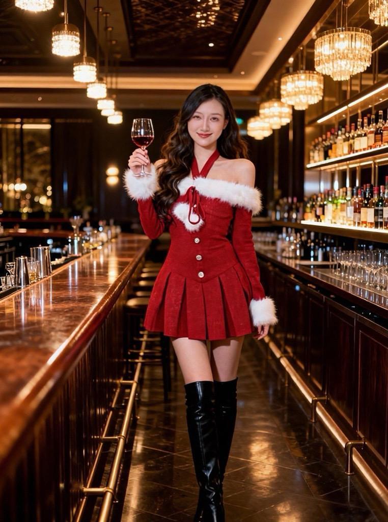 圣诞战袍, 微醺在鎏金光影的吧台,红裙与酒香撞个满怀,把浪漫揉进每一杯酒里,敬这个温柔又热烈的圣诞季~