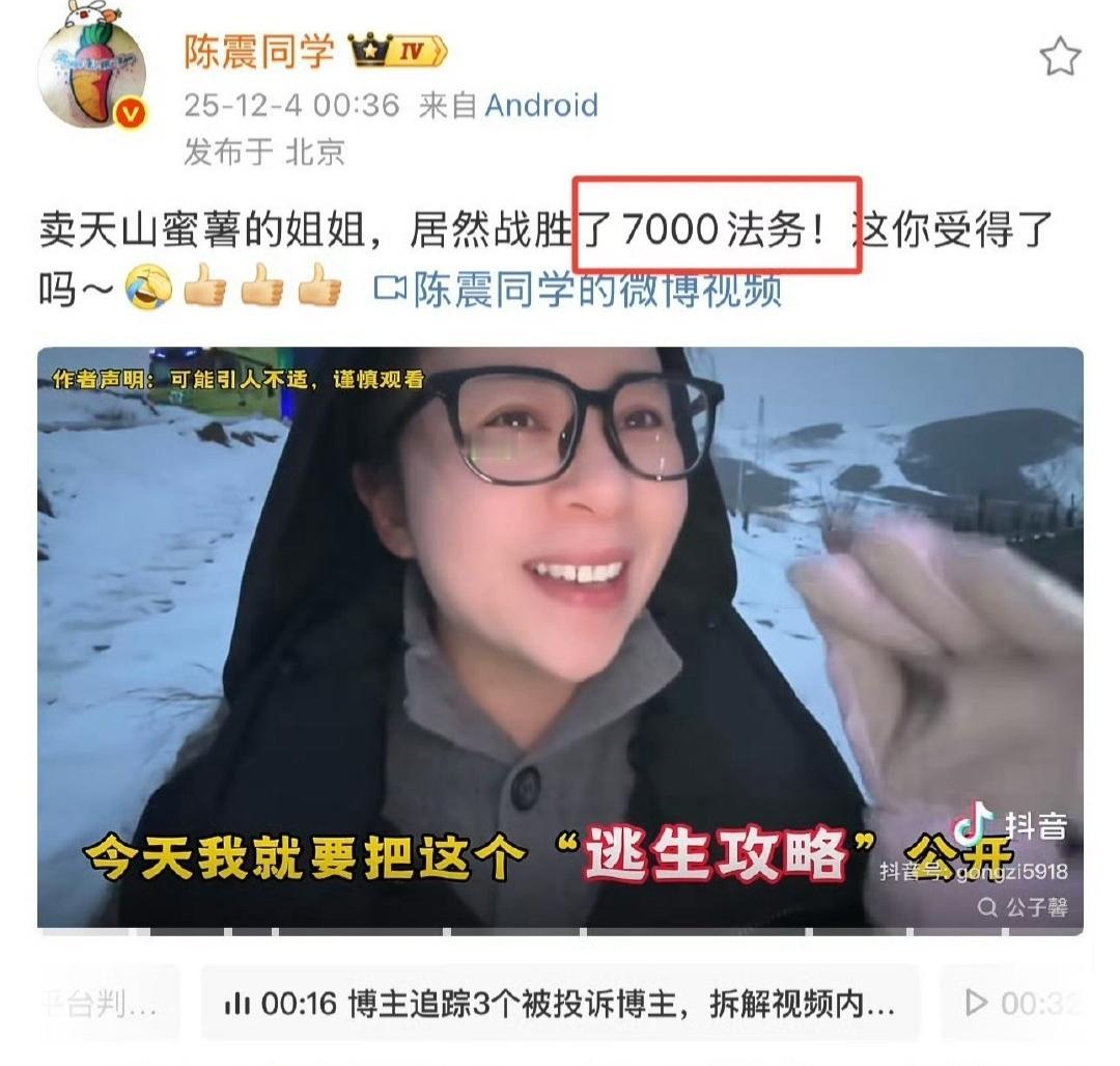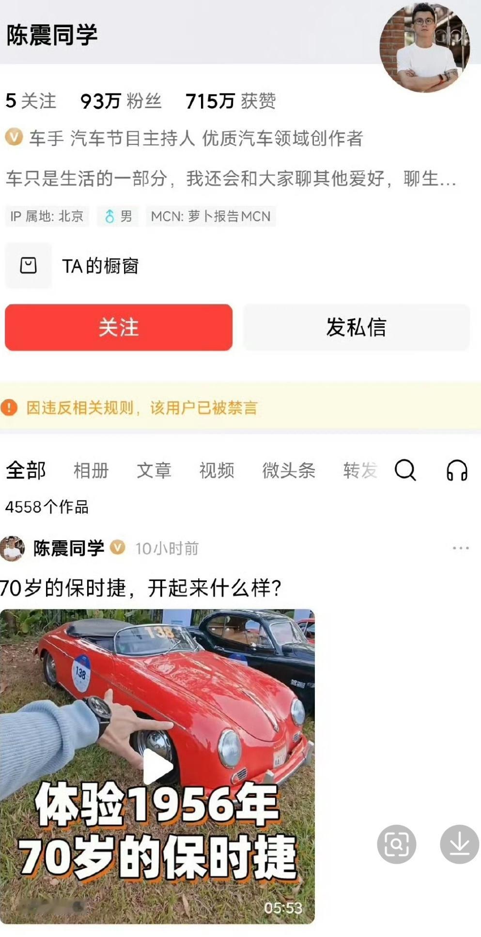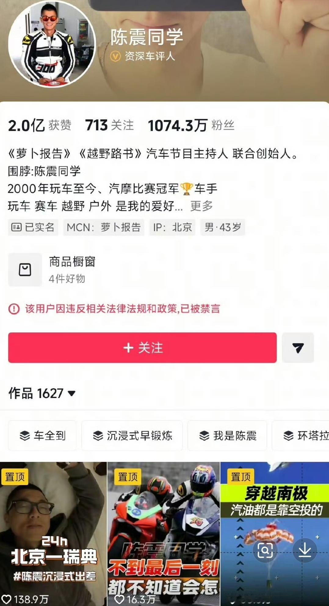 完蛋,“谢一路”大v陈震被全网禁言,微博上更是显示违反法律法规,而不是违反社区规定,看来这次不是某一平台出手,而是陈震真的遇到事了。 我想想啊。 上次逆行车祸那么厉害,陈震都没禁言,这次大概率是和那条7000法务的内容有关。 要么就是阴阳怪气捐款的事。 总而言之,陈震这么大一汽车网红都倒霉了,其他人真要当心啊!