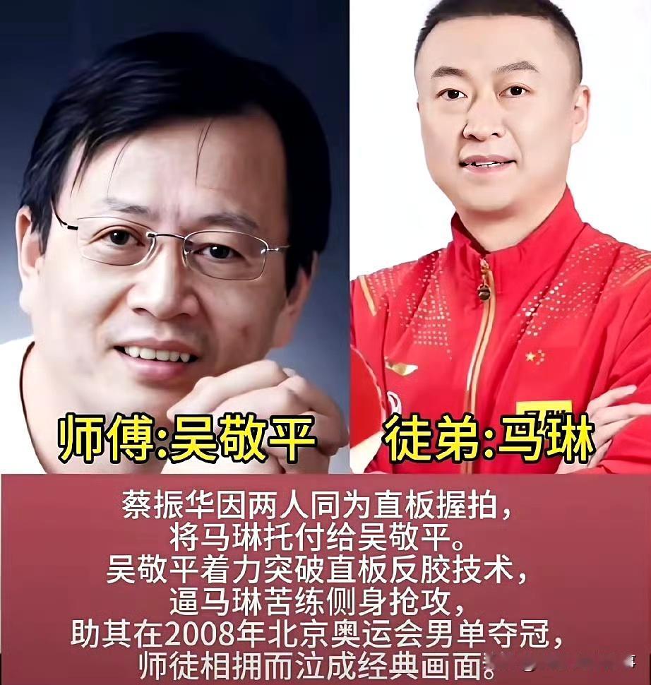 国乒6对师徒封神名场面!你pick哪一对? 蔡振华携刘国梁走出低谷,秦志戬陪马龙熬成双圈大满贯,张燮林为邓亚萍量身打造“小个子杀招”——国乒6对师徒每段传承都戳泪!从赛场并肩到薪火相传,他们不止教球技,更传拼搏底气。 哪对师徒的故事曾让你热血沸腾?评论区蹲同好!!!