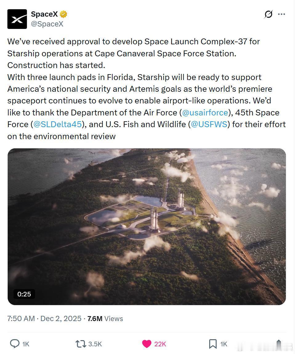 SpaceX星舰:获准进驻卡角改建发射场!SpaceX迈出了从佛罗里达州发射其星舰超大型火箭的重要一步。美国空军12月3日已批准将佛罗里达州卡纳维拉尔角太空军基地的37号航天发射场(SLC-37)改建为星舰的专用发射场。星舰是有史以来最大、推力最强的火箭,迄今为止其全部11次测试飞行均从得克萨斯州南部的星舰基地进行。12月2日,SpaceX通过一则简短的X帖子也宣布了这一消息,“我们将获得批准,在卡纳维拉尔角太空军基地开发用于星舰任务的37号航天发射场。建设工作已启动。凭借佛罗里达州的三个发射台,星舰将准备好支持美国的国家安全目标和阿尔忒弥斯计划……”卡角的37号发射场拥有深厚的历史底蕴,它最初是为支持NASA的阿波罗计划而建造的,该计划在1969年至1972年间将12名宇航员送上了月球。该场地包括A和B两个发射台,但A发射台此前从未执行过发射任务。如今,它被赋予了新的使命,将成为 SpaceX 星舰这一下一代巨型运载火箭的关键发射基地。根据美国联邦航空管理局最终确定的发射活动可接受范围内,SLC-37未来每年将可承办多达76次星舰发射和152次着陆。热门微博 科技快讯 天文航天 spacex星舰