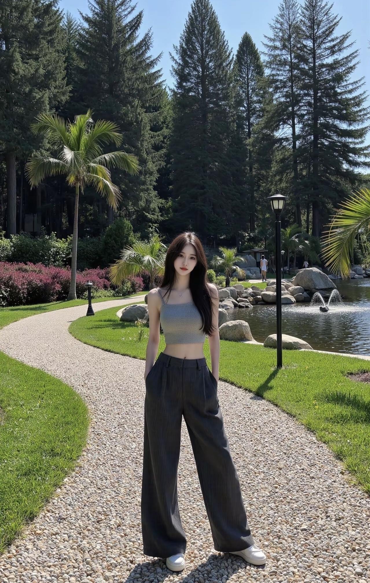 灰调吊带和牛仔的松弛感刚好适配这抹淡金色的光。帽檐遮了半分热意,露腰的小小心机,