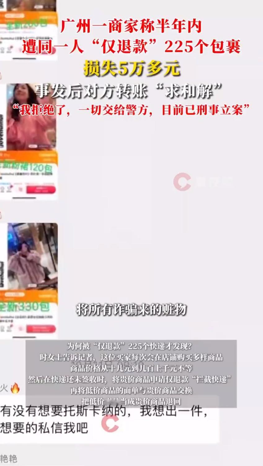 广州做电商的时女士最近遇到了一件糟心事,半年时间里被同一个买家“仅退款”了225个包裹,算下来直接损失了五万多块钱。她把这事拍成视频发到网上后,很快就引发了不少商家的共鸣,现在已经报警刑事立案,就等警方调查结果了。 时女士说,这个买家是山东烟台的,每次在她店里下单都不买单一商品,而是一次选多样,价格从十几块到几百上千元不等,看着就像正常的消费者。但其实对方心里早就打好了坏主意,每次都趁着快递还没签收的时候,专门挑订单里的贵价商品申请“仅退款”,还能操作“拦截快递”。更让人没想到的是,买家会把低价商品的快递面单撕下来,贴到贵价商品的包裹上,再把这些换了面单的低价商品退回去,这样一来,贵价商品就被他神不知鬼不觉地留了下来,还拿到了全额退款。 正常情况下,消费者根本接触不到“拦截快递”这种操作,时女士怀疑对方可能和快递员或者驿站有勾结,不然没法这么顺利地完成面单更换和快递拦截。而她之所以过了半年才发现这个问题,主要是因为仓库那边的惯例,一般不会检查被拦截退回的快递,觉得既然是拦截件,商品应该都是完好未拆的,也就没多留意。直到最近一次,这个买家可能是操作太匆忙,没把面单贴牢固,露出了破绽,仓库工作人员核对的时候才发现不对劲,这才顺着线索查下去,一统计才知道已经被钻了225次空子。 时女士把自己的遭遇曝光后,没想到收到了好多其他商家的私信,大家一聊才发现,原来不止她一个人被这个买家坑过,核对地址后确认都是同一个人所为,看来对方已经用这种手段骗了不少商家。事情败露后,那个买家主动找到时女士,还转了钱想要和解,希望她能撤案,但时女士直接拒绝了。她觉得,成年人就得为自己的行为负责,这种恶意利用平台漏洞骗钱的做法,不能就这么轻易算了,必须让他得到应有的判罚。 其实懂行的人都知道,这种行为根本不是正常的售后维权。按照相关规定,消费者得遵循诚信原则维护自己的合法权益,要是通过造假、捏造事实的方式骗取商家退款,数额小的可能涉及民事欺诈,数额大或者情节严重的,就可能构成诈骗罪了。时女士这五万多元的损失,已经达到了刑事立案的标准,这也是为什么警方会立案调查的原因。现在越来越多的商家遇到类似的“恶意仅退款”,有的是用AI造假图,有的是像这样换面单拦截快递,大家都希望能通过这次事件,引起平台和相关部门的重视,堵住规则漏洞,也让这些想“白嫖”的人付出应有的代价。 来源:潇湘晨报