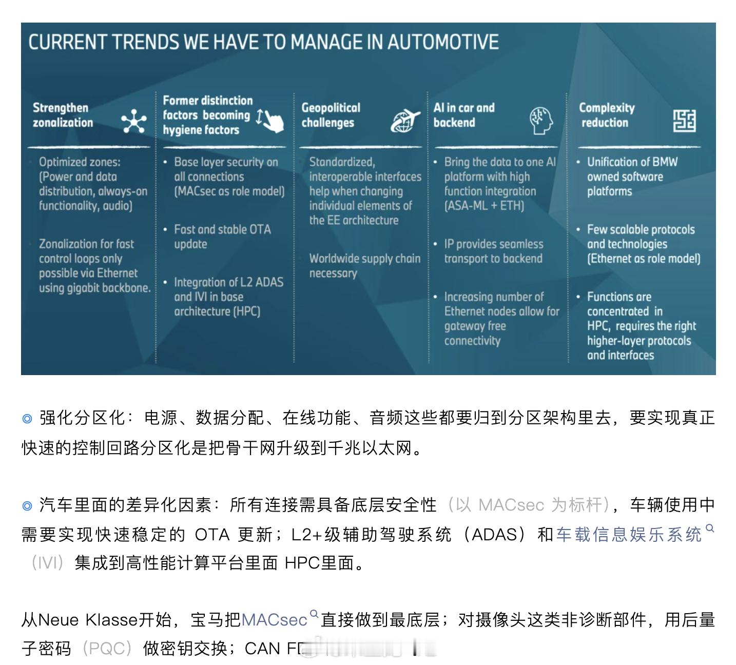 宝马下一代EE架构的迭代方向过去十年,汽车电气架构不断复杂化,但从2025年开始,行业真正进入“大收敛时代”,硬件逐渐简化,智能与软件成为主角。在IEEE会议上,宝马工程负责人 Christoph Gollob 分享了他们对下一代电子电气(EE)架构的思路 ① 先解决“太复杂”这件事 过去历史上车型平台里面有太多复杂和历史的软件,宝马给出的方向和中国现在在做的是一样的:集中化 + 分区化。未来结构大致这样理解HPC(中央大脑)负责算力与核心功能 Zonal(分区节点)负责连接线束与传输 外围ECU只保留最基础驱动。宝马将车端和云端分别承载不同AI能力:车端AI(LLM/VLM): 低延迟、不依赖信号、保护隐私云端AI:模型更大,逻辑推理更强两者之间通过Agent代理机制互通:车端不懂的问云端,云端运算后再反馈给车;能本地算的则本地完成,实现智能闭环。宝马从Neue Klasse起将MACsec安全机制下沉至底层以太网,摄像头等模块采用PQC后量子密码交换密钥,CAN FD上使用SecOC安全通信,汽车的信息安全强度更接近云安全等级。总体来看,德国汽车的设计意图也是希望跟上高效的计算终端,再让智能持续成长,这个路线全球都认同的,无非快慢而已。新能源汽车大V聊车BMW