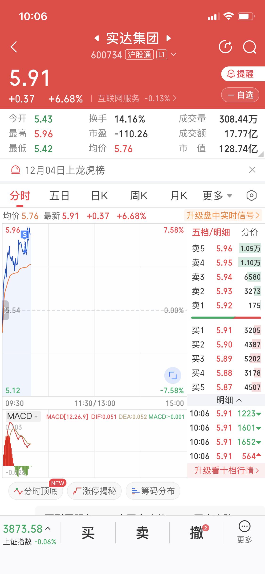 12月5日早盘我把实达股份卖了,昨天水下9.5点进的,今天水上5点就出了,小赚200元。虽然没卖在最高点,但我不贪心,落袋为安才是王道。 实达集团最近动静不小,12月1日到3日连续3个交易日收盘价涨幅偏离值累计超20%。12月5日早盘还涨了3.07%,成交额6.43亿元,主力资金净流入近7000万。这股今年以来涨了58.17%,近20日涨幅超50%。不过它也多次登上龙虎榜,12月4日龙虎榜净买入还是负的。股票市场变幻莫测,能小赚一笔就很满足啦。