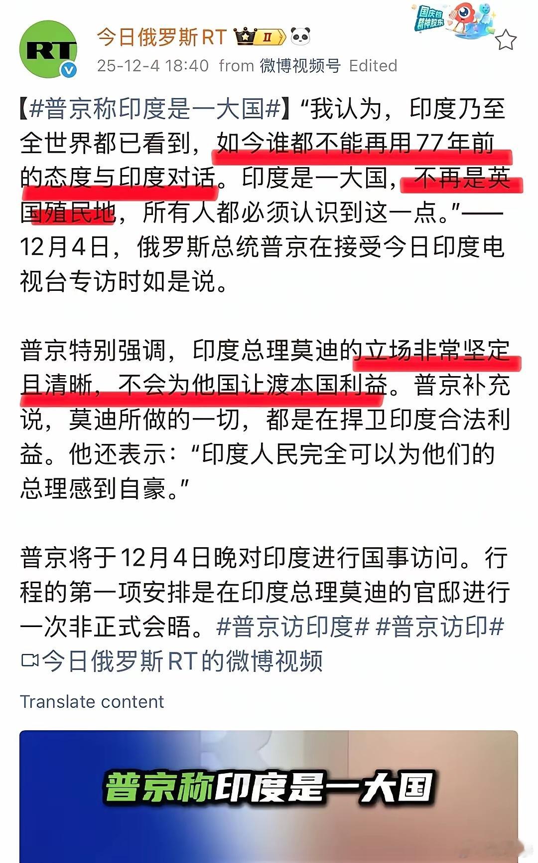 到访印度的普京专门朝印度的痛点下手,大谈特谈大国尊严,大国强国尊严就要立场清晰坚定,绝不会为他国(美国)让渡印度利益,否则就不是大国,就没有尊严。