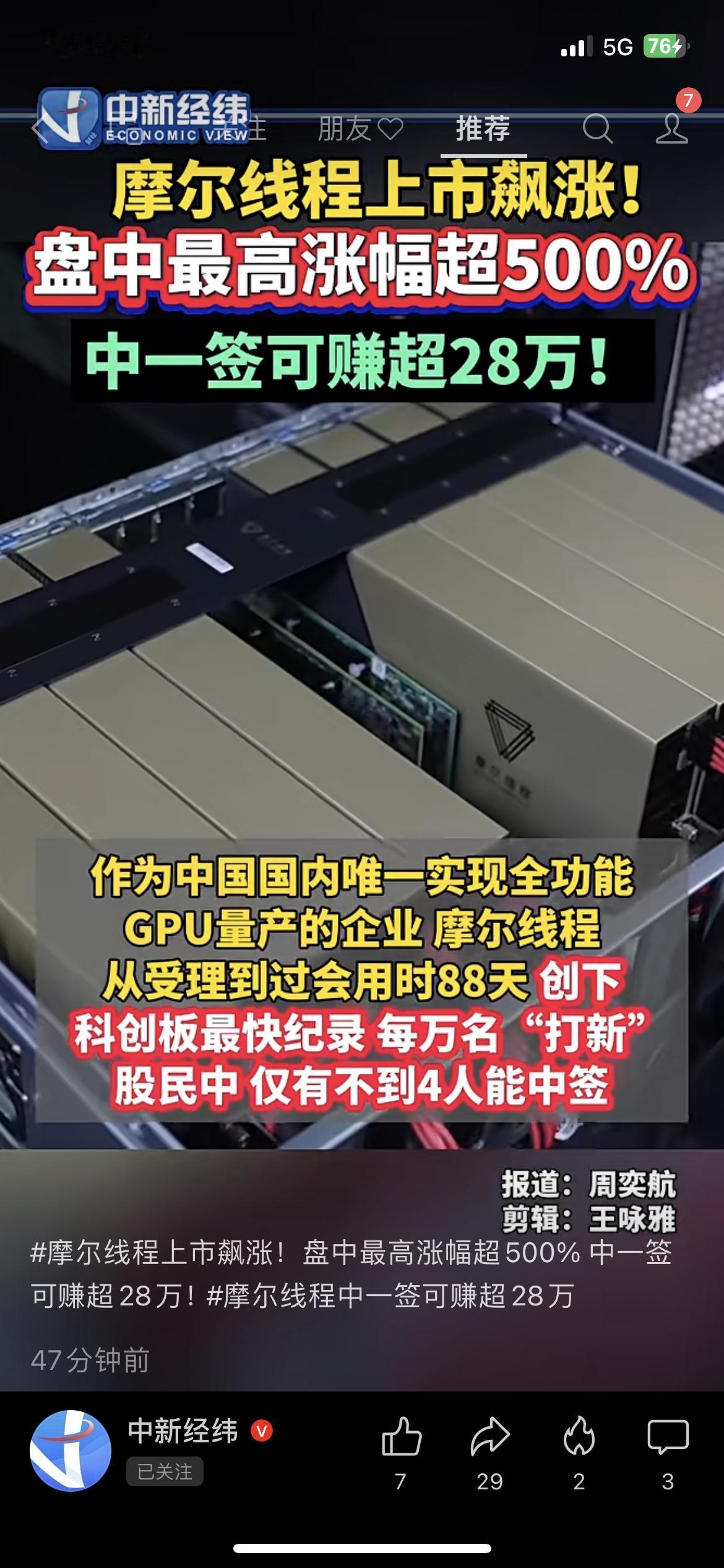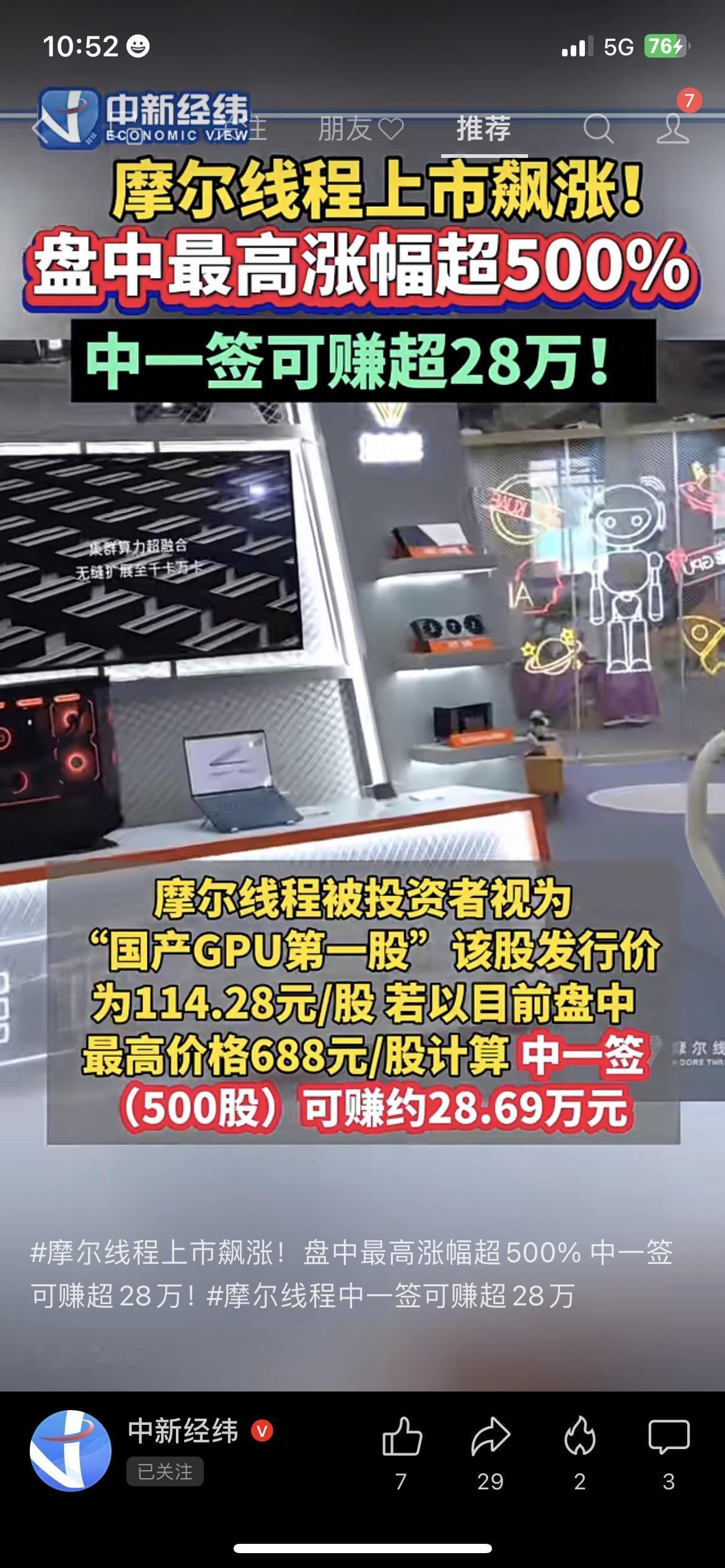 疯了!新股上市涨500%,中一签赚28万!这公司啥来头?摩尔线程 今天科创板直接炸了!新上市的“摩尔线程”,盘中最高涨了502%,从发行价114块直接冲到688块! 就按最高算,中一签500股,能赚28万多!这钱赚得也太爽了吧? 为啥这么疯?因为它是“国产GPU第一股”,现在AI、算力这么火,GPU就是核心硬件,市场对它期待值直接拉满。不过现在市值已经超3000亿了,这涨法到底是真价值还是炒热度? 摩尔线程上市暴涨