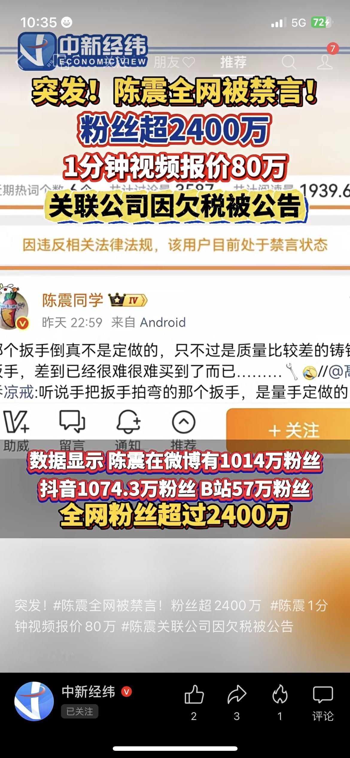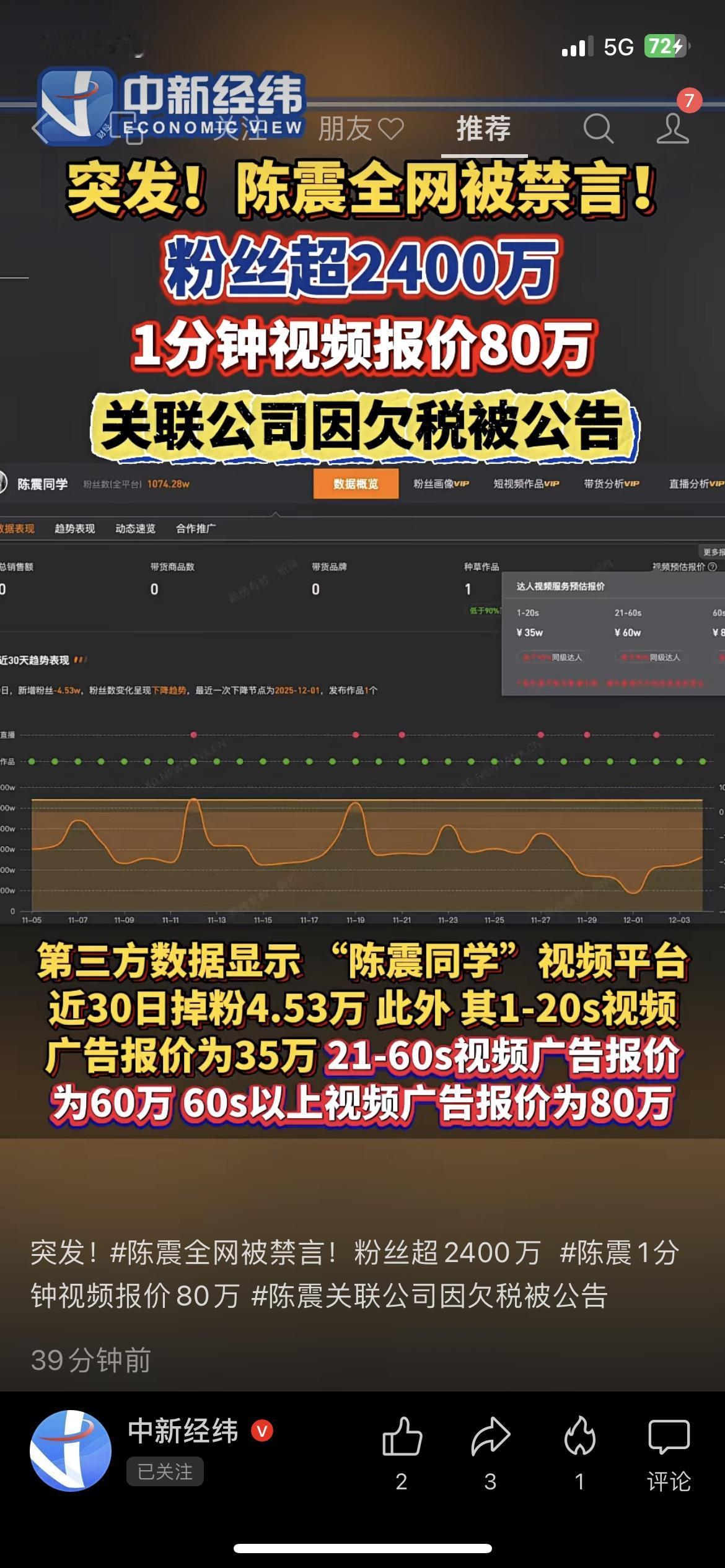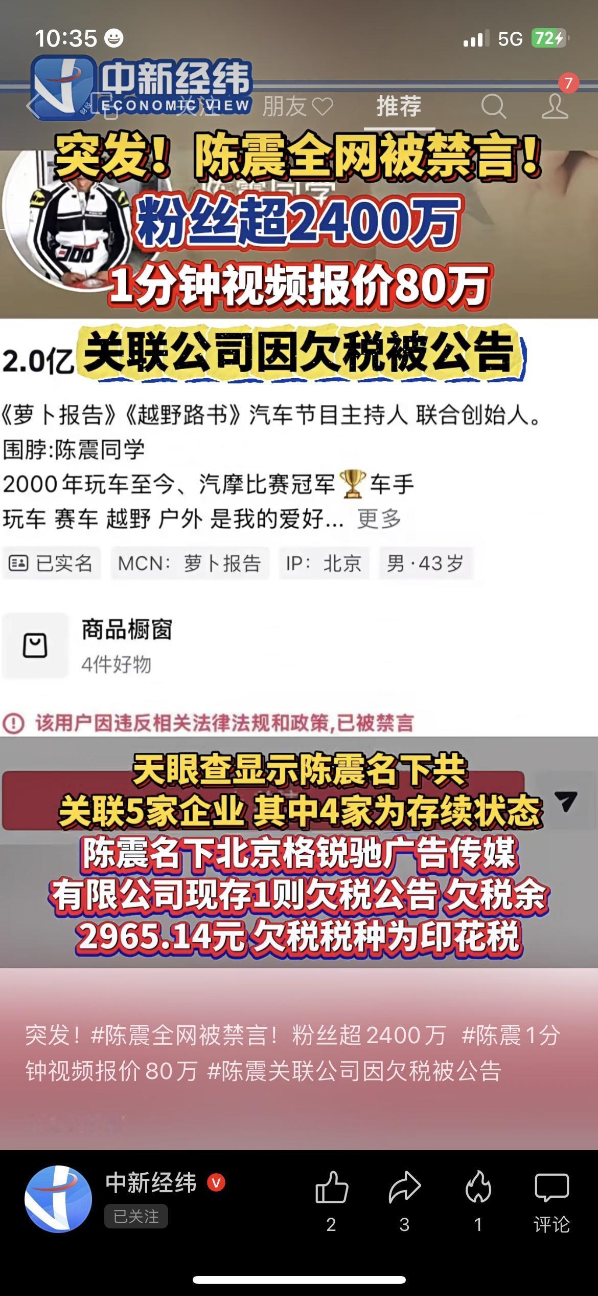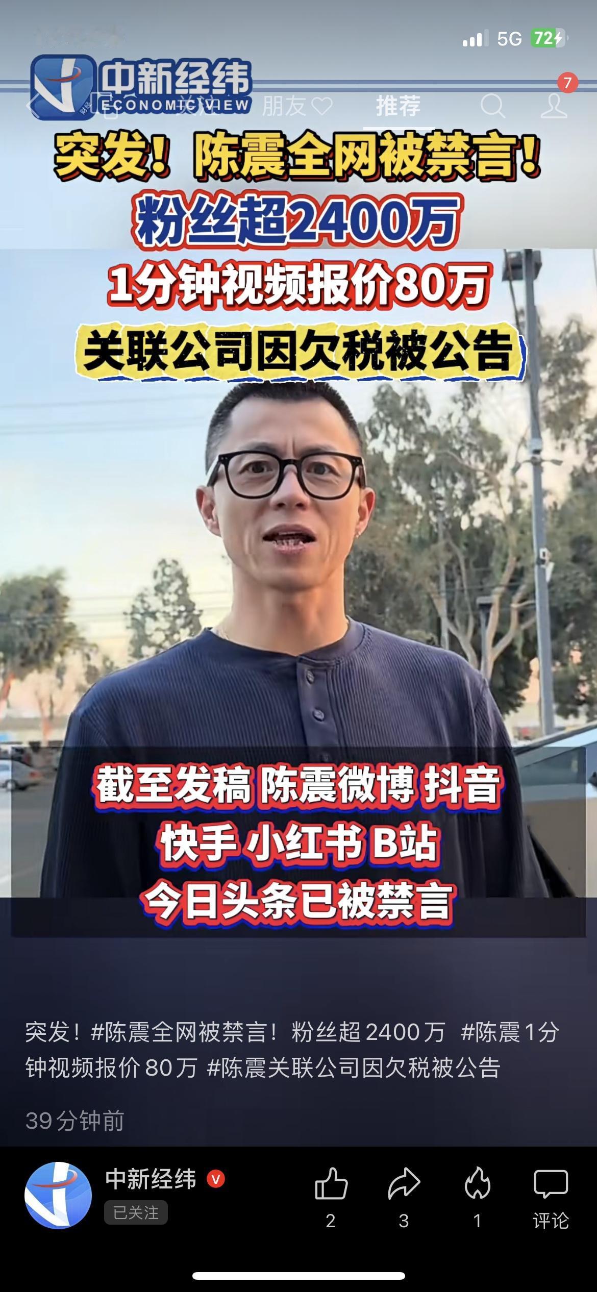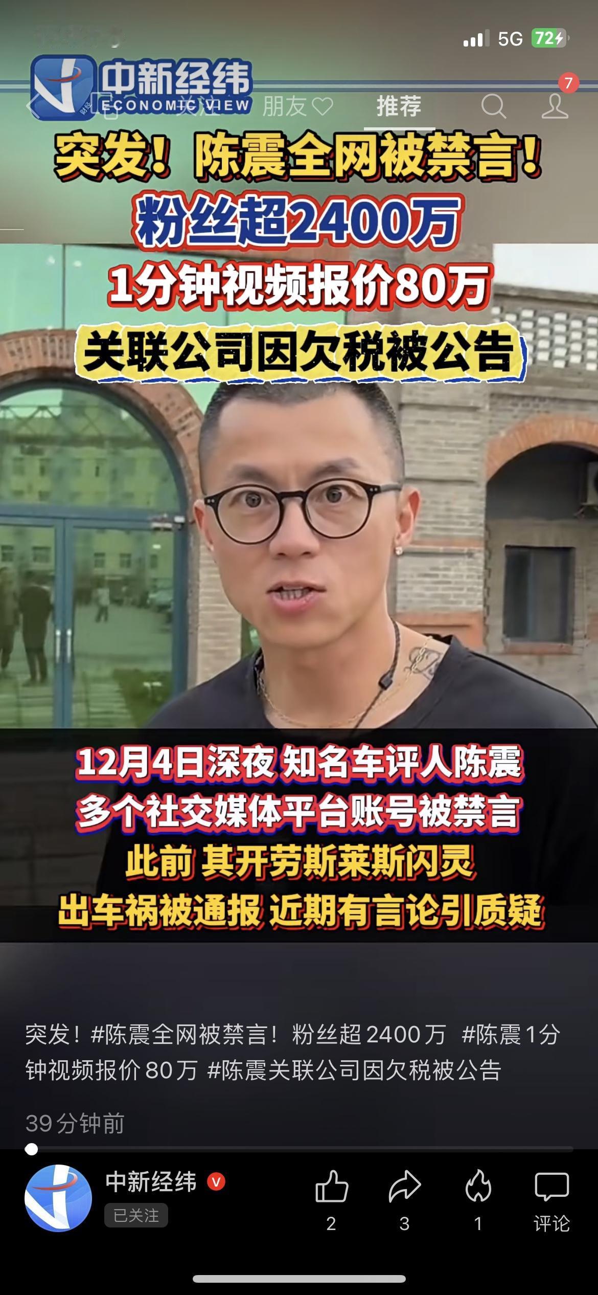 实锤!2400万粉车评顶流陈震全平台禁言!80万/条报价泡汤,欠税+车祸+造谣连踩3个雷 刚刷到的大消息!12月4号深夜到5号凌晨,车圈没人不认识的陈震,微博、抖音、B站、小红书账号全被封了——有的标着“违反法律法规”,有的直接显示“账号已封禁”,2400万粉丝一夜之间找不到人,这波操作真的炸锅了! 这可不是突然翻车,全是近期争议堆出来的: ✅ 80万一条的广告彻底停了!第三方数据显示,他60秒以上的视频报价高达80万,近30天还掉了4.53万粉,现在账号没了,这赚钱路子直接断了; ✅ 欠税+车祸早埋雷!他持股54%的公司被税务部门公示欠税2965.14元,还是印花税这种基础税费;10月3号在北京开劳斯莱斯闪灵逆行撞车,交警直接判他全责,后来他自己说,是开车时低头捡东西、过度信辅助驾驶才出的事,被撞的网约车司机多处骨折,家里还有四老两小要养; ✅ 最后一根稻草是造谣!12月4号他发视频说“卖天山蜜薯的姐姐战胜7000法务”,暗戳戳影射某企业,可实际该企业法务才150人,全球头部公司法务最多也不到2000人,这明显造谣被平台实锤,直接触发全平台封禁; ✅ 之前还蹭灾情引众怒!11月27号小米捐1000万驰援香港火灾,他转发说“不管出于什么原因,这事没得黑”,被网友骂阴阳怪气消解公益,道歉都没人买账。 以前看他开着第四辆二手劳斯莱斯拍视频,觉得又专业又风光,没想到接连踩法律和公序良俗的红线。只能说流量再大也不是挡箭牌,说话做事没底线,迟早要栽跟头!陈震微博 陈震车评