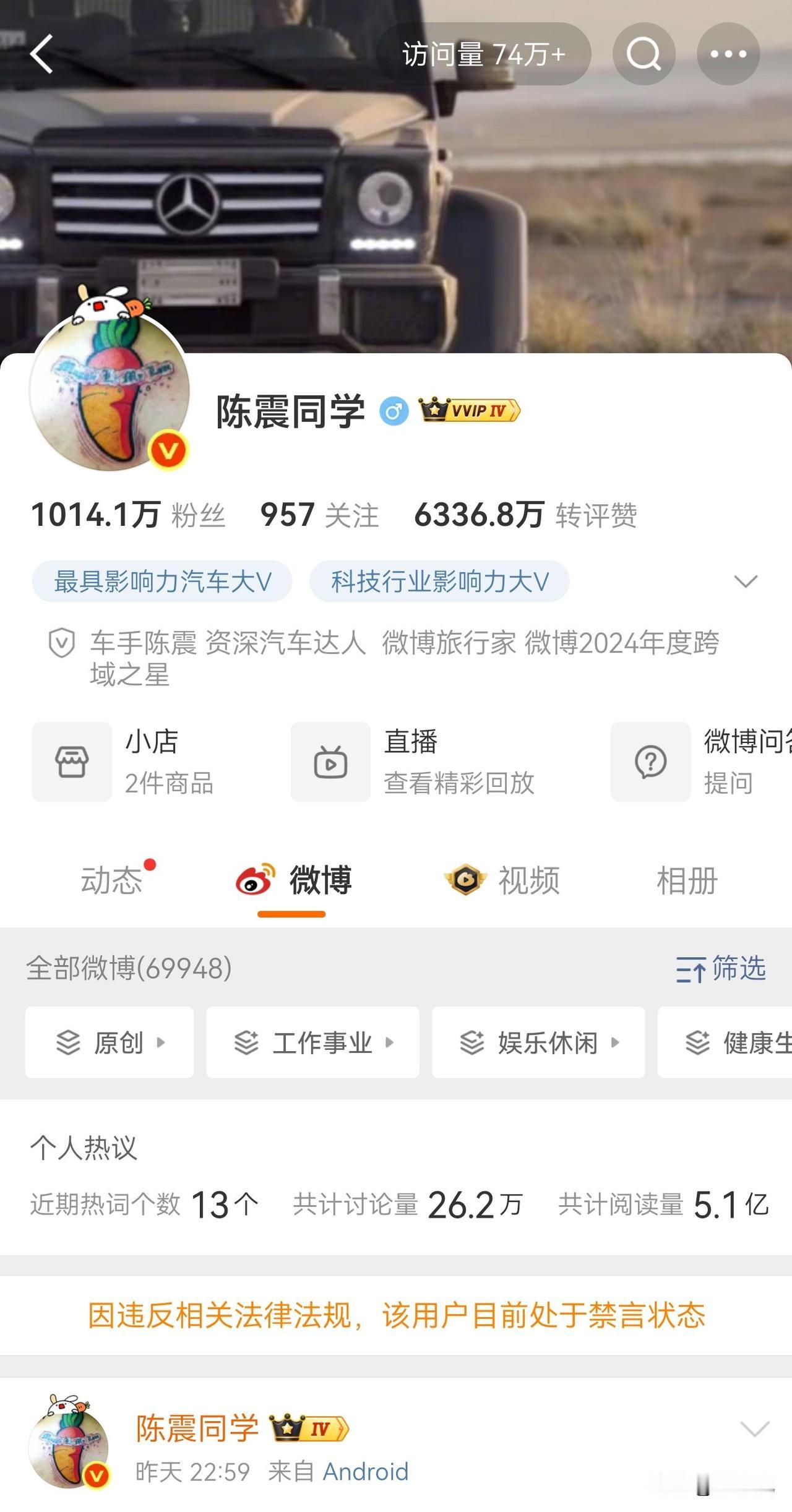 这你受得了么? 全网被禁言了[笑哭]! 坏消息:陈震被全网禁言了, 好消息:禁言微博居然还有74万访客!