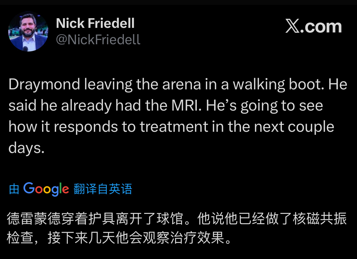 1⃣️追梦赛后穿着保护靴离开球馆他说多米尼克·巴洛落地时压到了他的右脚,伤势和上周多诺万·克林根压到他右脚的情况类似但追梦表示,他预计能够带伤上阵2⃣️补充Nick报道,追梦说他已经做了核磁共振检查,接下来几天他会观察治疗效果新赛季篮不住勇士vs76人