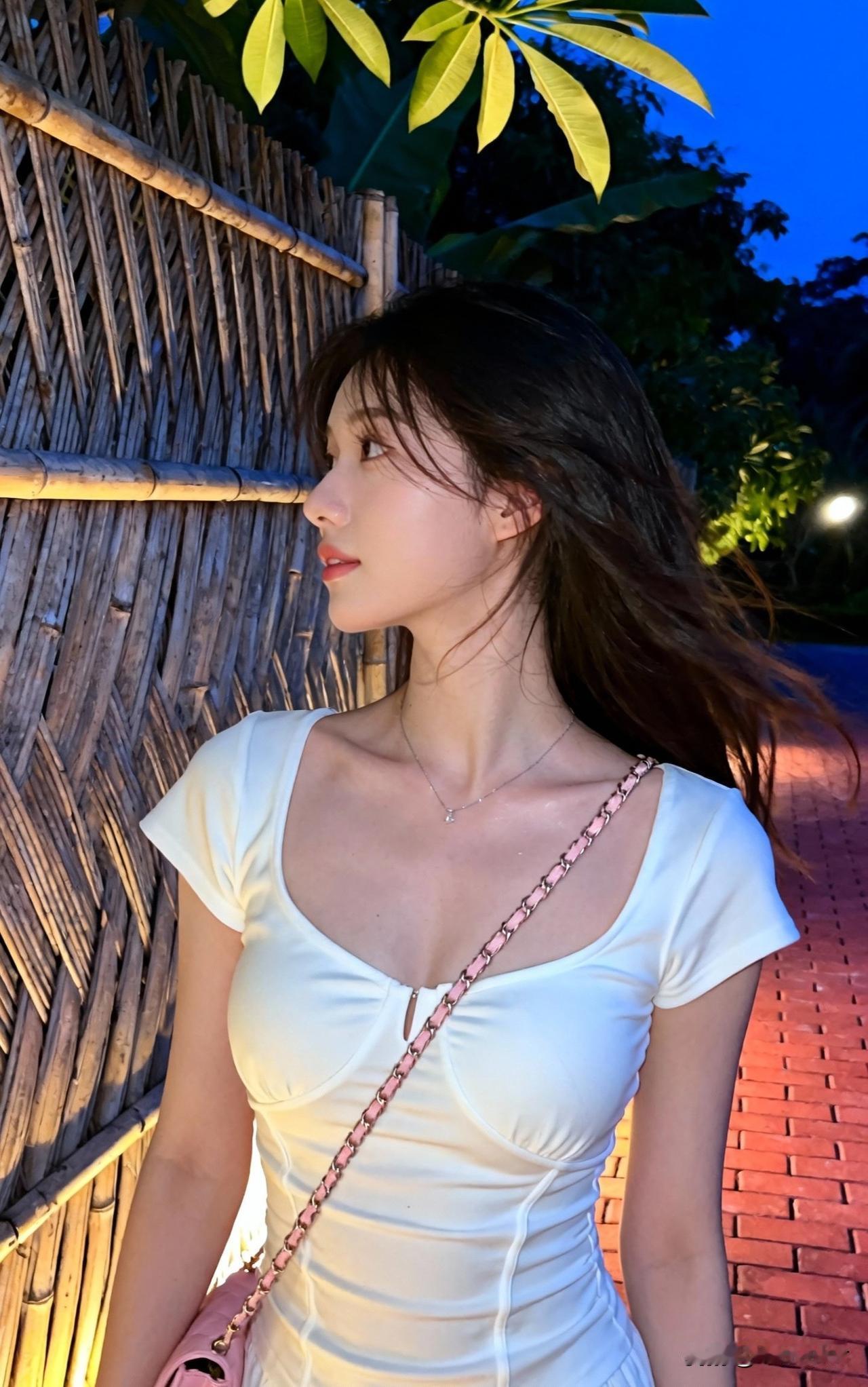 夜晚的竹林小道,少女侧影,粉色包包,清新自然。