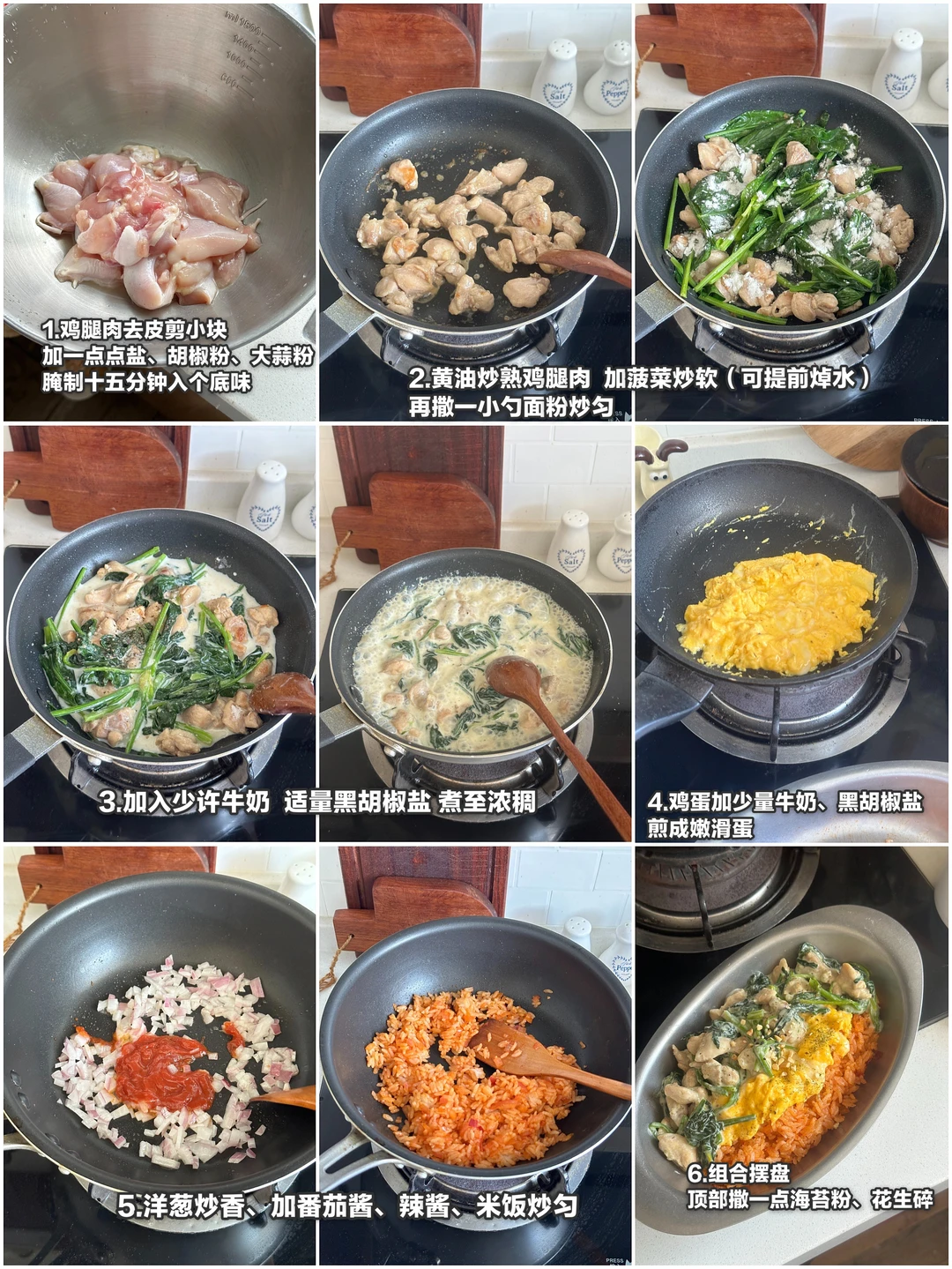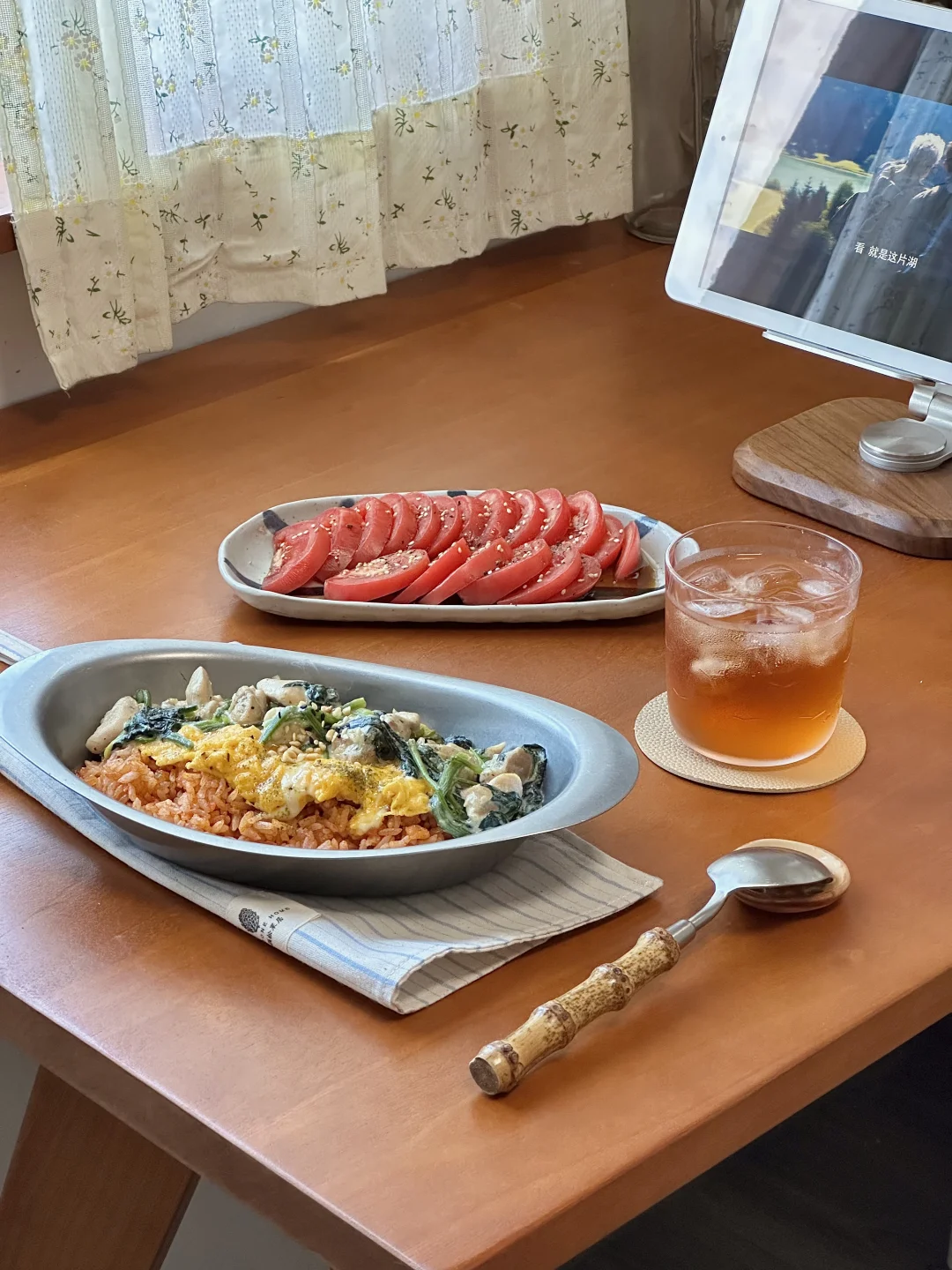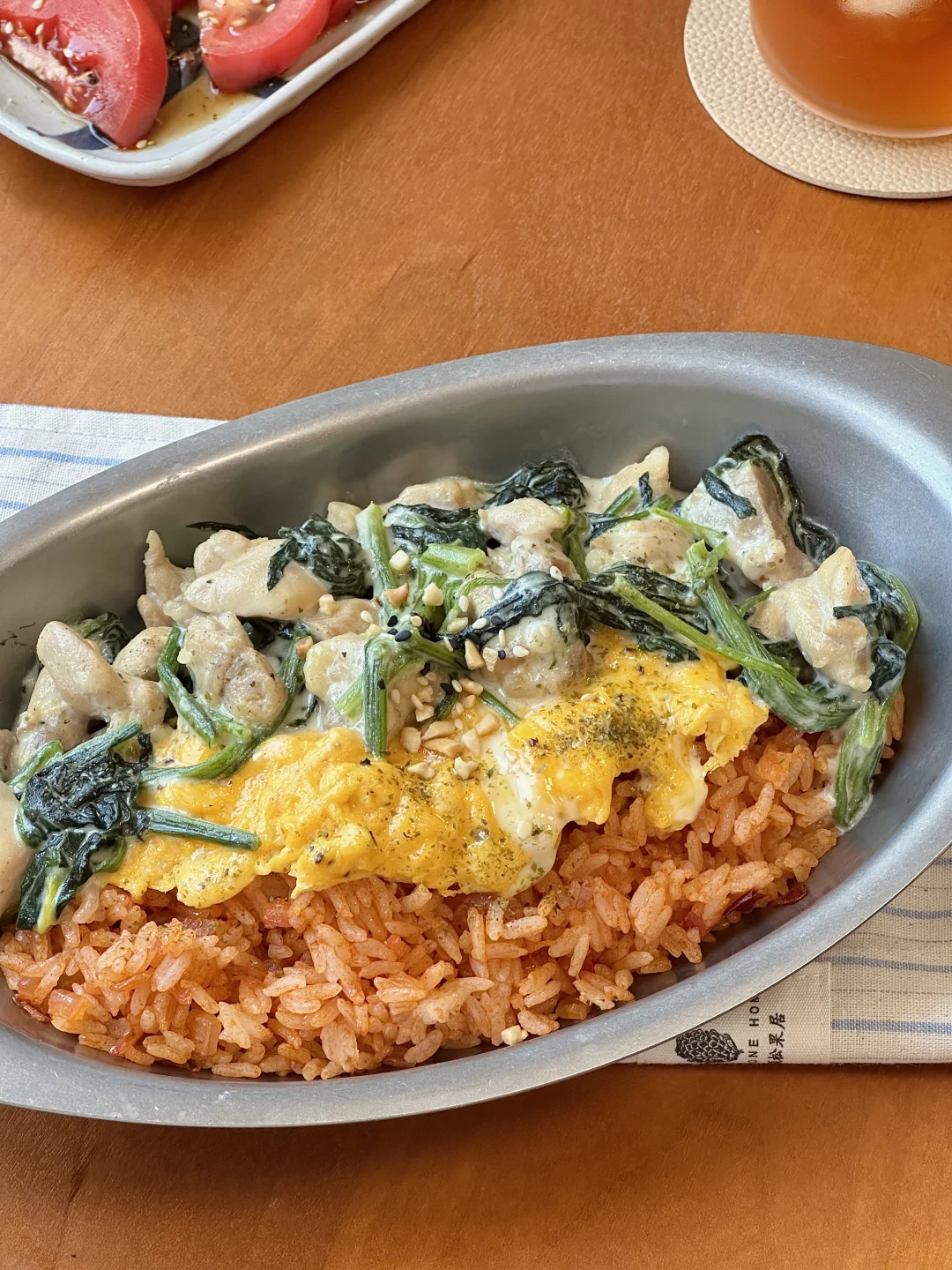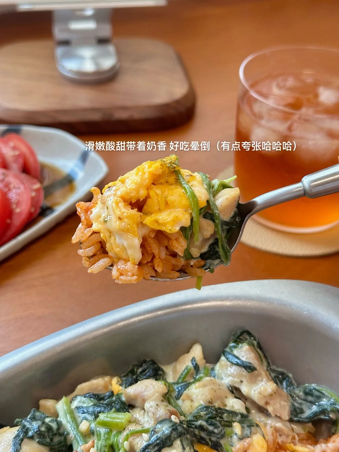 🥄今日菜单: 奶油菠菜鸡肉蛋包饭 柚子醋麻油凉拌番茄 生茶 . 详细做法步骤图往后翻~ . 料理书上学到的蛋包饭 我用现有的调料做了简易版hhh 超级超级好吃!这个搭配! 炖煮过的菠菜很软 和奶香融合的很好 加上酸甜口的番茄饭 多重口感 一定要每样食材都一起吃😬😬 咸口的凉拌番茄也是惊艳到我了 最近重温日剧看到的菜谱 试了一下 和甜口是很不一样的感觉~ .