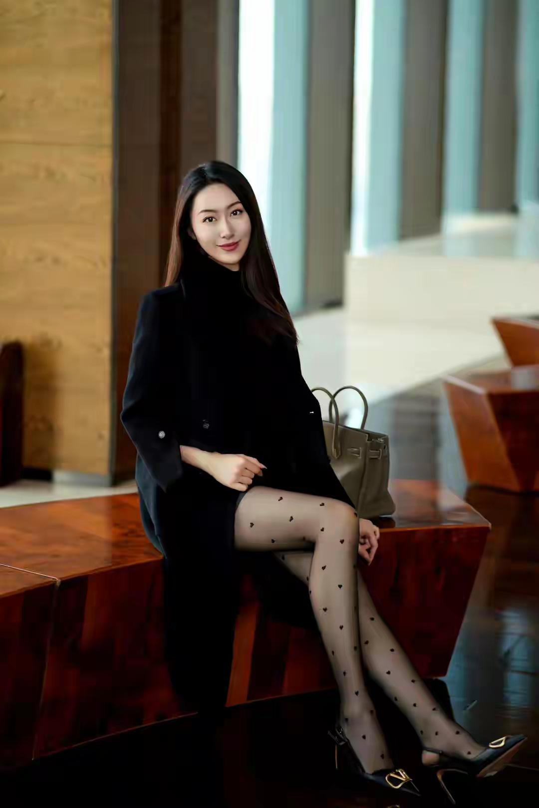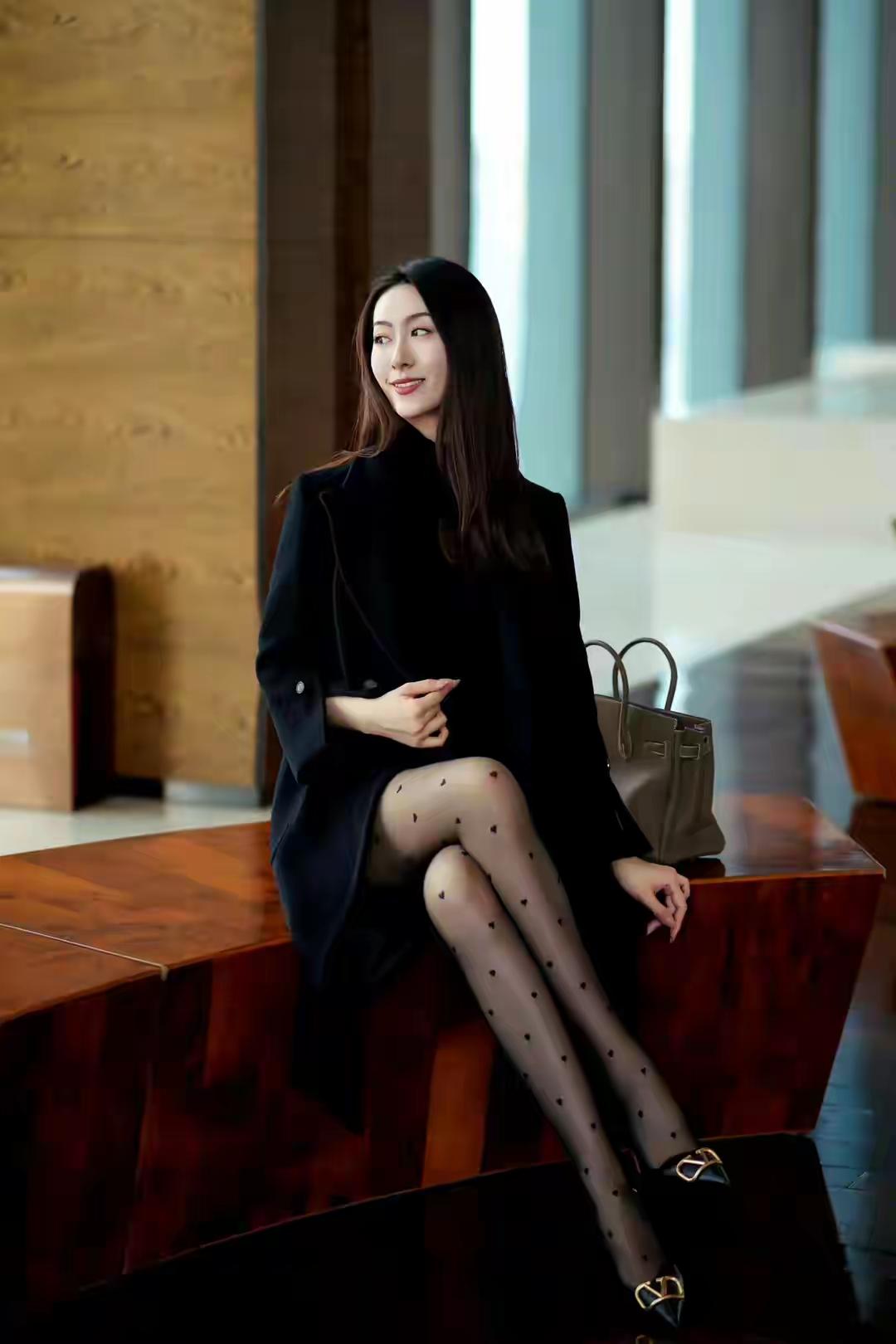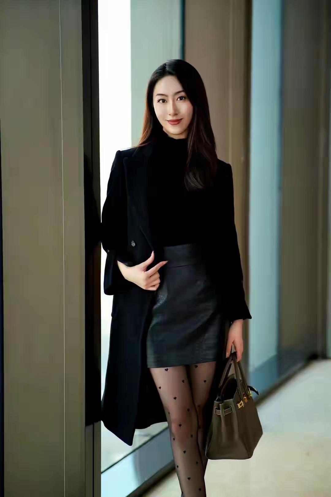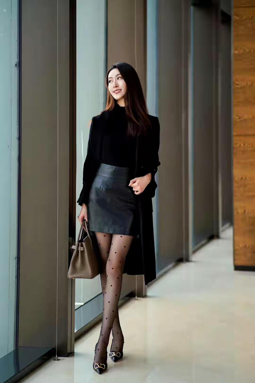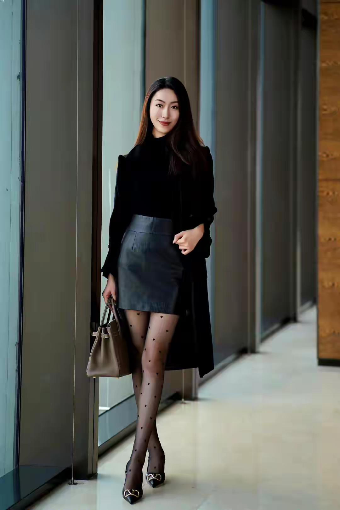 时髦精穿搭秘籍内穿黑色高领打底衫搭配黑色的短裙,外搭一件质感十足的大衣,一双波点连裤袜,精致的细跟高跟鞋,给人一种非常精致时髦的气质感!