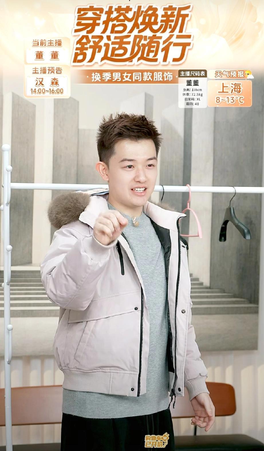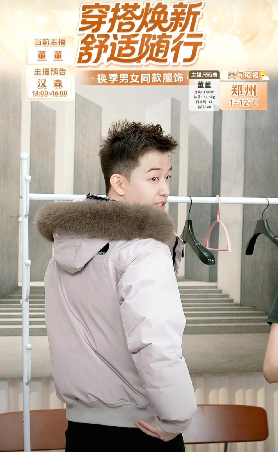 董董居然用了“婀娜”这个词形容自己! 还说穿上这款衣服能显腰线。董董在讲一款派克羽绒服时,被要求穿上紫色的试一下,1米78的大个,硬是穿上s码的羽绒服。他调侃他自己穿上很“婀娜”。 这让我想起盼盼曾经说董董在卖女性用品时比她讲的还要好。这是真的,看过董董讲化妆品,讲女士衣服,讲女性用品,都讲的非常非常专业。 当有朋友问他身上穿的裤子会粘毛吗?他直截了当的说:“粘!裤子上粘了老多毛,你怕粘毛你别买啊。” 就喜欢他们的这份实在劲,有一说一,有二说二,不拖泥带水。节约自己的时间,也节约大家的时间。 董宇辉 与辉同行 兰知春序