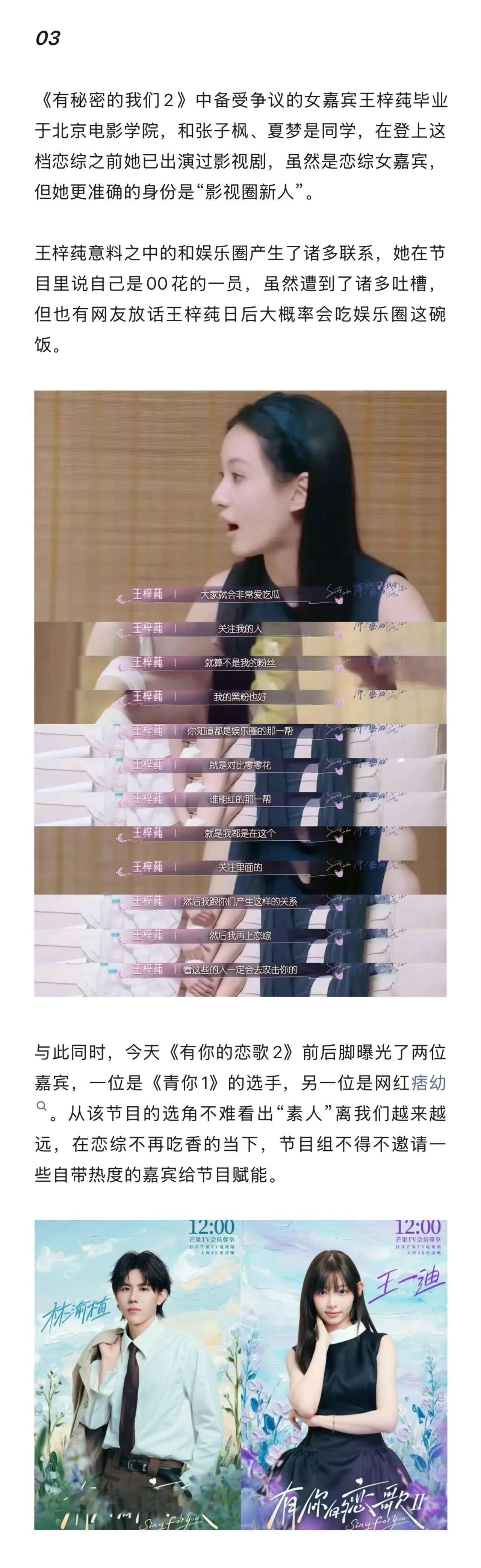 恋综是通往娱乐圈的大门吗业内谈恋综选角标准 从无人问津到靠争议走红,《有秘密的我们2》王梓莼备受争议,侧面印证了恋综嘉宾才是流量密码。业内人士爆料,内娱恋综早年照搬韩版《Heart Signal2》,高颜值、海归学历、中产职业成选角三大硬指标,嘉宾面试甚至会刻意穿最贵行头迎合标准。而CP感全凭“玄学”,带“伤痛气质”的嘉宾更受青睐,如今为博热度,网红、明星预备役扎堆恋综,素人恋爱早已变味。