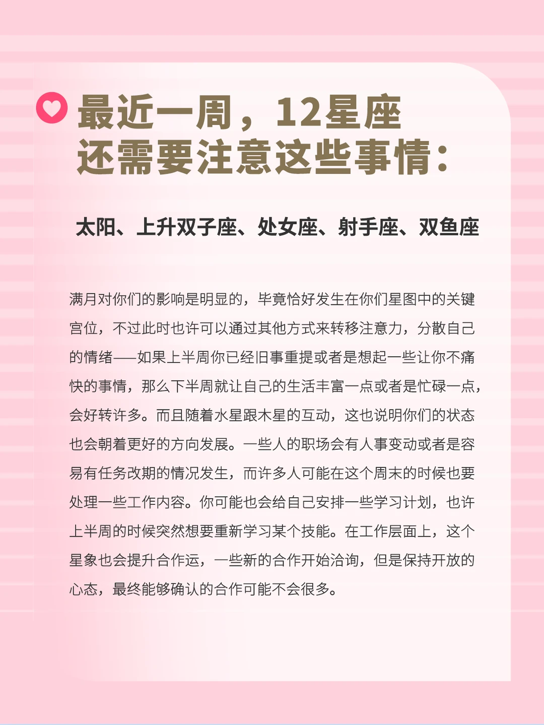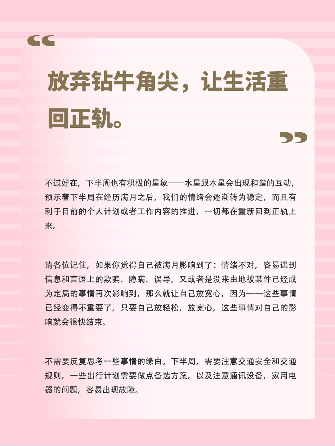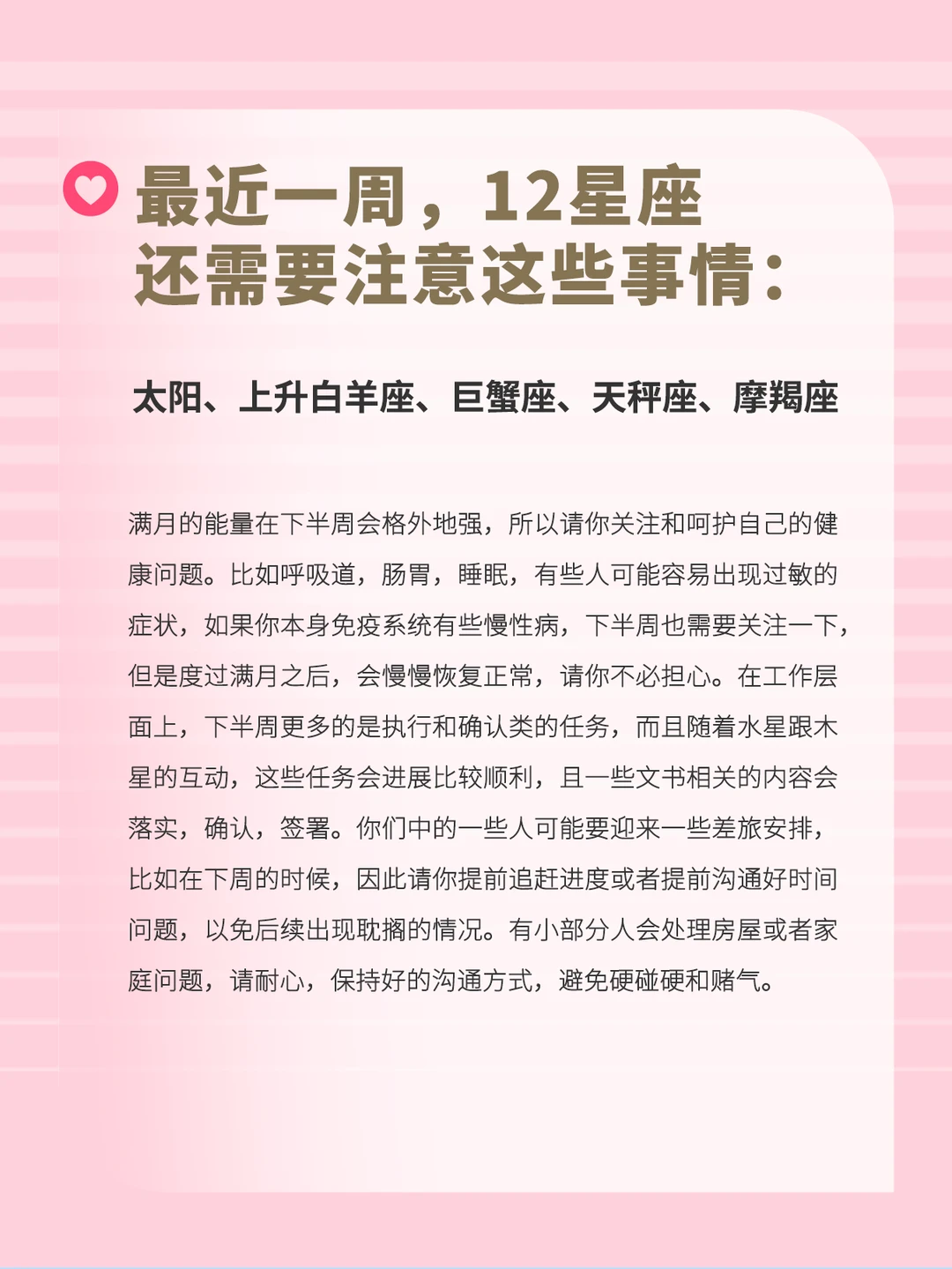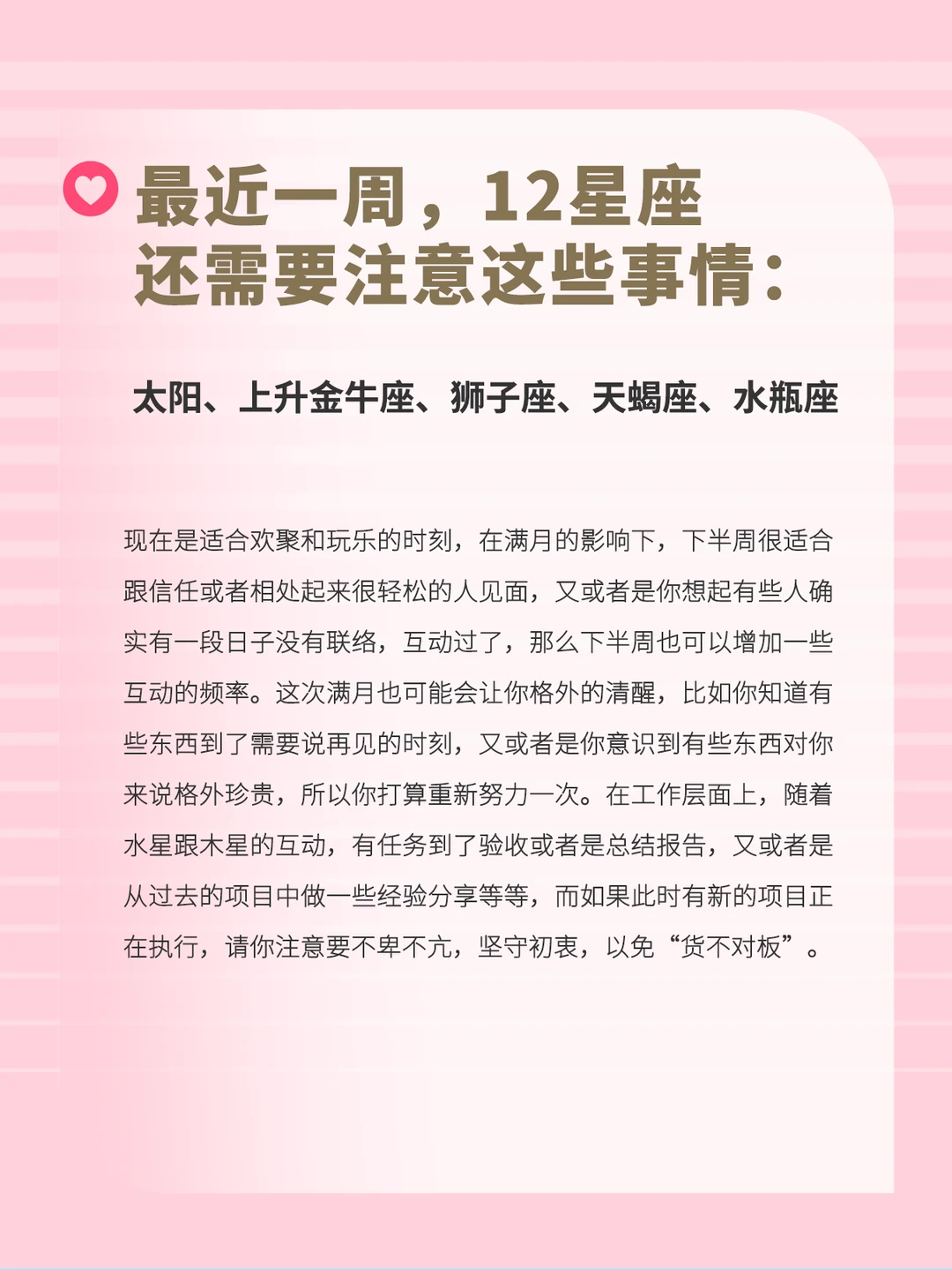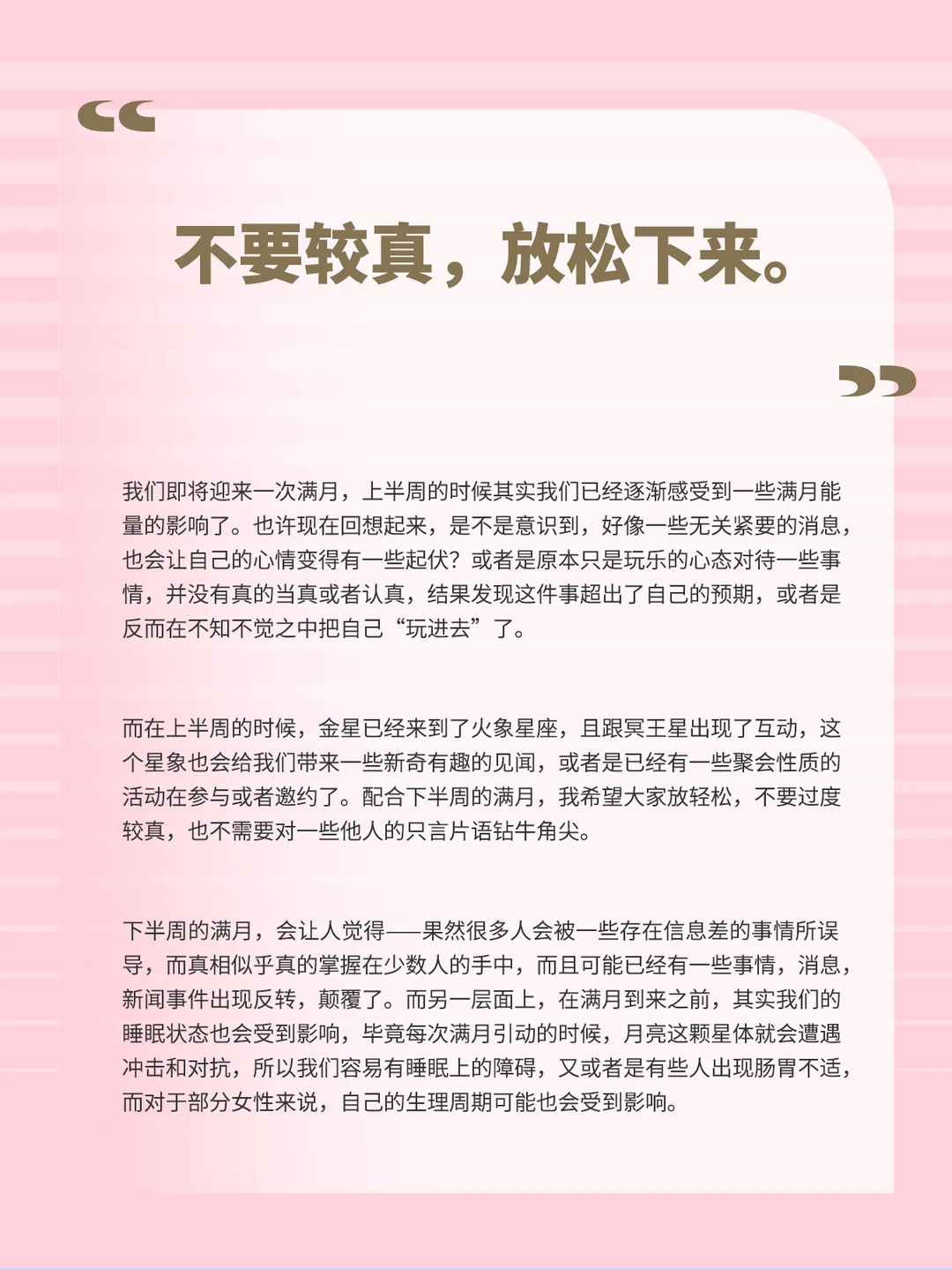 我们即将迎来一次满月,上半周的时候其实我们已经逐渐感受到一些满月能量的影响了。也许现在回想起来,是不是意识到,好像一些无关紧要的消息,也会让自己的心情变得有一些起伏?或者是原本只是玩乐的心态对待一些事情,并没有真的当真或者认真,结果发现这件事超出了自己的预期,或者是反而在不知不觉之中把自己“玩进去”了。 而在上半周的时候,金星已经来到了火象星座,且跟冥王星出现了互动,这个星象也会给我们带来一些新奇有趣的见闻,或者是已经有一些聚会性质的活动在参与或者邀约了。配合下半周的满月,我希望大家放轻松,不要过度较真,也不需要对一些他人的只言片语钻牛角尖。 下半周的满月,会让人觉得——果然很多人会被一些存在信息差的事情所误导,而真相似乎真的掌握在少数人的手中,而且可能已经有一些事情,消息,新闻事件出现反转,颠覆了。而另一层面上,在满月到来之前,其实我们的睡眠状态也会受到影响,毕竟每次满月引动的时候,月亮这颗星体就会遭遇冲击和对抗,所以我们容易有睡眠上的障碍,又或者是有些人出现肠胃不适,而对于部分女性来说,自己的生理周期可能也会受到影响。 不过好在,下半周也有积极的星象——水星跟木星会出现和谐的互动,预示着下半周在经历满月之后,我们的情绪会逐渐转为稳定,而且有利于目前的个人计划或者工作内容的推进,一切都在重新回到正轨上来。 请各位记住,如果你觉得自己被满月影响到了:情绪不对,容易遇到信息和言语上的欺骗、隐瞒、误导,又或者是没来由地被某件已经成为定局的事情再次影响到,那么就让自己放宽心,因为——这些事情已经变得不重要了,只要自己放轻松,放宽心,这些事情对自己的影响就会很快结束。 不需要反复思考一些事情的缘由。下半周,需要注意交通安全和交通规则,一些出行计划需要做点备选方案,以及注意通讯设备,家用电器的问题,容易出现故障。 本周剩余几天至下周二期间,12星座还需要注意这些事情:(请阅读图片)