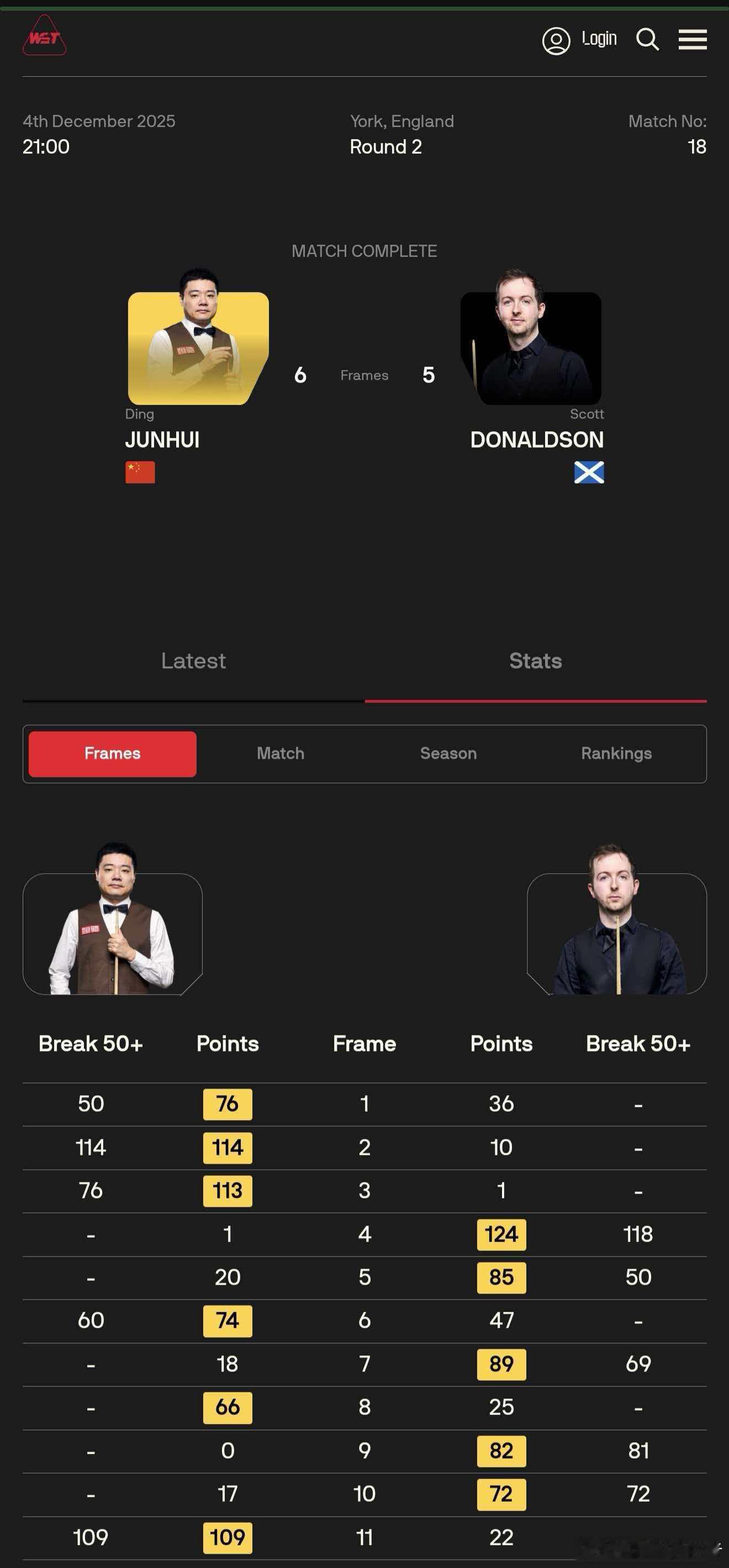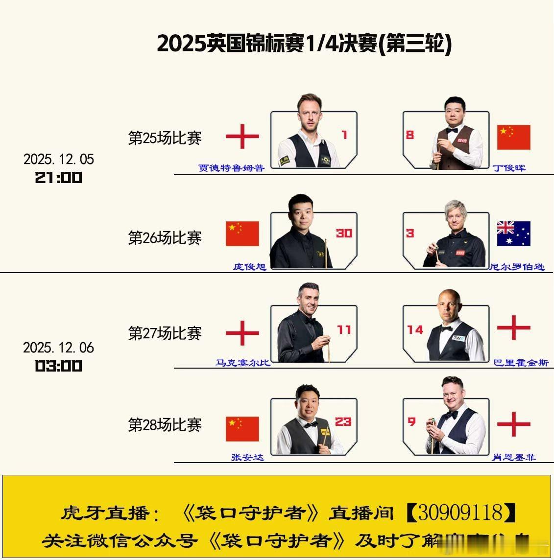 2025英国锦标赛1/4决赛2025英国锦标赛1/4决赛(11局6胜)中国选手丁俊晖、庞俊旭、张安达等三位晋级8强2025.12.05日 星期五21:00 直播: 丁俊晖VS贾德特鲁姆普2025.12.06日 星期六3:00 直播: 张安达VS肖恩墨菲
